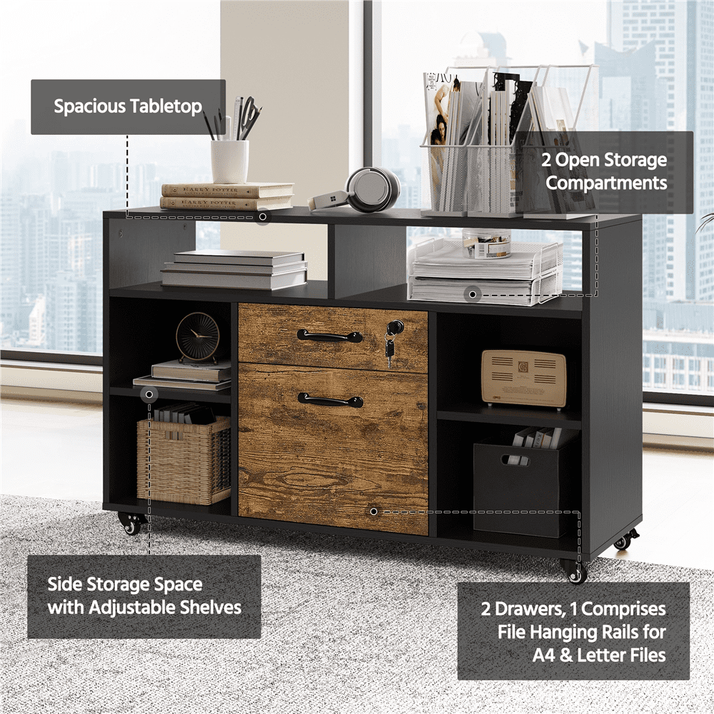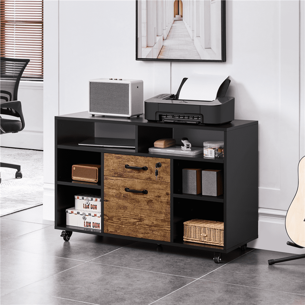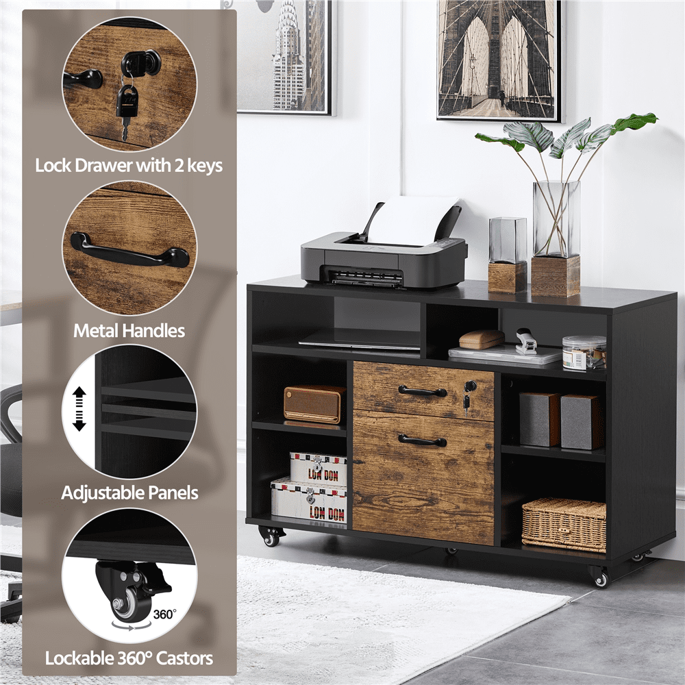 Get tired of rummaging through the office with overwhelming files and office supplies to get a file? Let this large office storage cabinet save you. Featured by a spacious top, separated open and closed storage areas, 5 flexible industrial-grade casters, and a chic and sleek outlook, this office printer stand is no longer a traditional boring filing cabinet. It can pair with any wood or industrial-style space as a storage unit or a display cabinet.