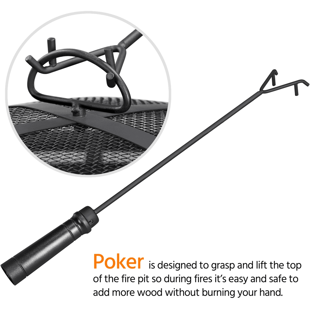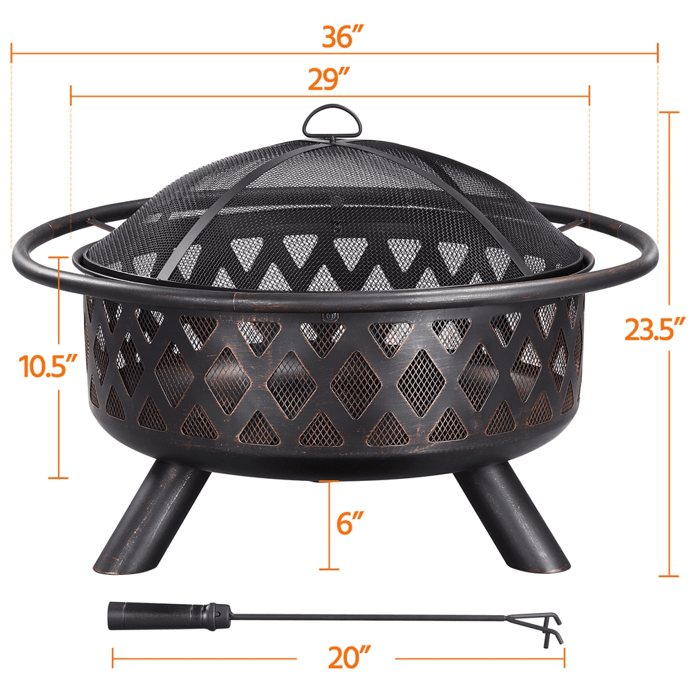 Smile Mart Iron Fire Pit with Mesh Screen Poker and Cover for Outdoors, Bronze Specifications: Materials: Metal Color: Bronze Fuel Type: Charcoal, Firewood Overall Dimensions (w/ lid): 36in Dia. × 23.5in H Fire Pit Height (w/o lid): 17in Fire Bowl: 29in Dia. × 10.5in H Distance Between Fire Bowl & Ground: 6in Fire Poker Length: 20in