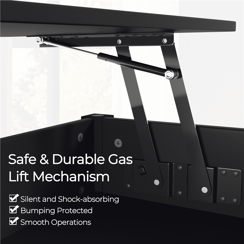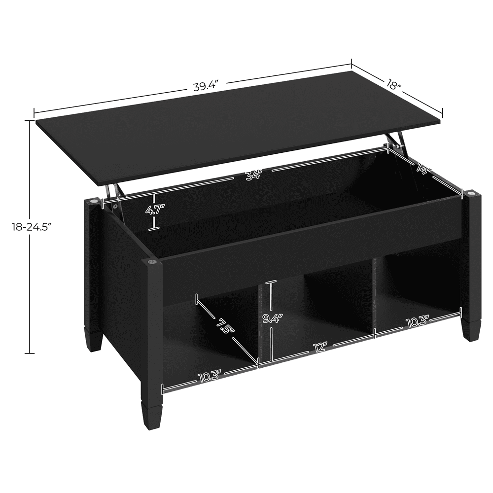 Color: Black Materials: Engineered Wood, Solid Wood, Metal Assembled Dimensions: Closed Top: 39.5″L × 18″W × 19″H Extended Top: 39.5″L × 18″W × 24.5″H Tabletop Size: 39.5″L × 18″W Storage Inner Size: 33.7″L × 14″W × 4.7″D Bottom Shelf Height: 9.4″ Item Weight: 42.2 lb Shipping Weight: 46.7 lb Maximum Weight Capacity: Total: 121 lb Tabletop (when extended): 22 lb Inner Storage: 44 lb Bottom Shelf: 35 lb Lift Top for Versatility Strong Wood Construction