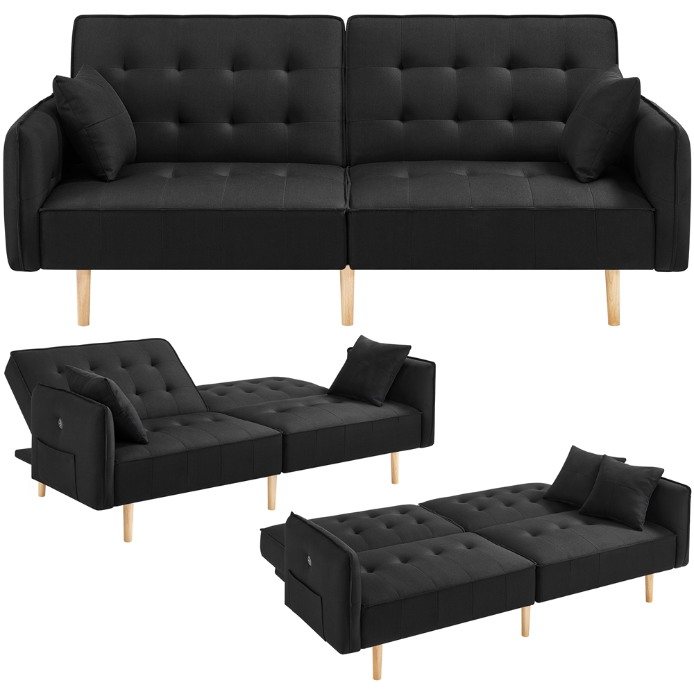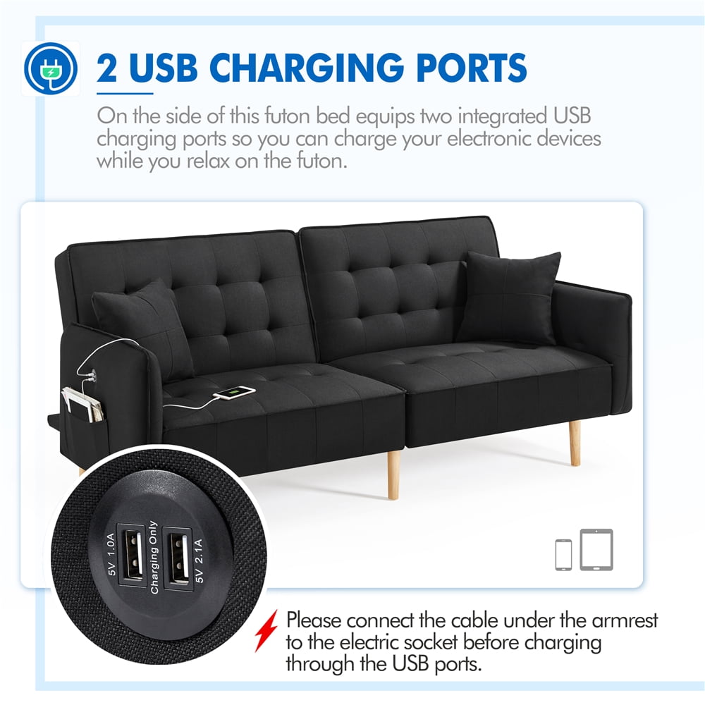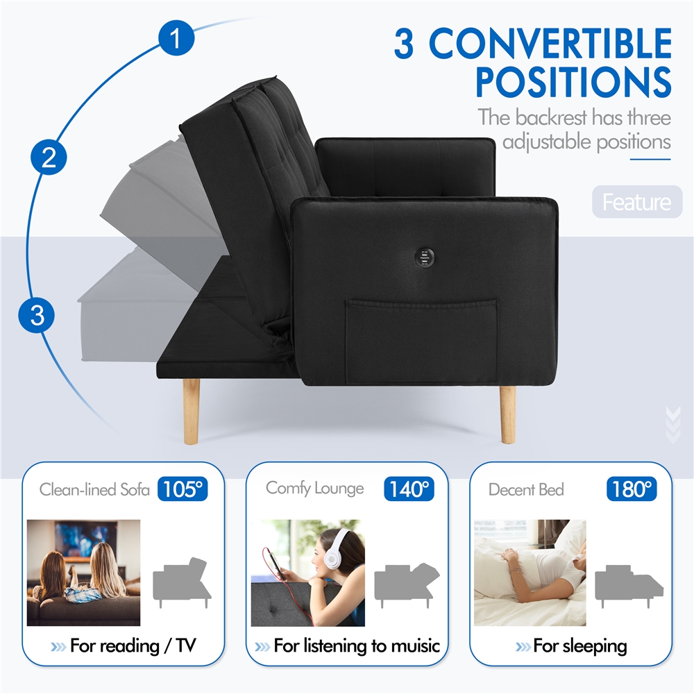 Alden Design Memory Foam Convertible Futon Sofa Bed with USB, Black: Material: memory foam, fine linen, solid wood legs, 100g non-woven fabric Color Options: Black, Gray Dimension at 180 degree lay-flat: 78.0” x 44.0” x 25.5″ (L x W x H) Dimension at 140 degree tilt-back: 78.0” x 41.0” x 27″ (L x W x H) Dimension at 105 degree seated upright: 78.0” x 37.0” x 33.0″ (L x W x H) Seat Height: 15.9″ H Armrest Height: 25.2″ H Side Pocket Size: 13.6 x 7.9″ (L x H) Ground Clearance: 7.3″ from ground to base of futon Max. Weight Capacity: 772lb N.W.: 84.4lb G.W.: 94.8lb Note: Simple assembly needed. Please allow ± 0.6in error due to manual measurement. Please refer to the size description before purchase to avoid unnecessary inconvenience (customer will cover the return shipping cost if the return is because size does not match the image). This is not a true twin size bed. Be sure to check all packing materials carefully for some parts are kept in the zip compartment underneath the sofa bed.