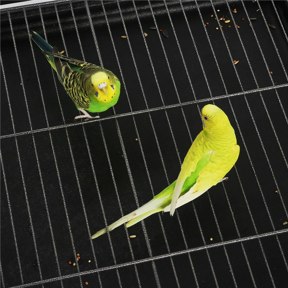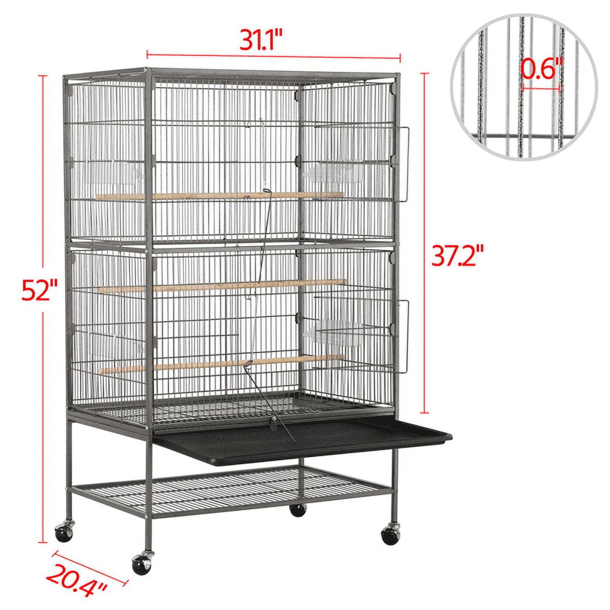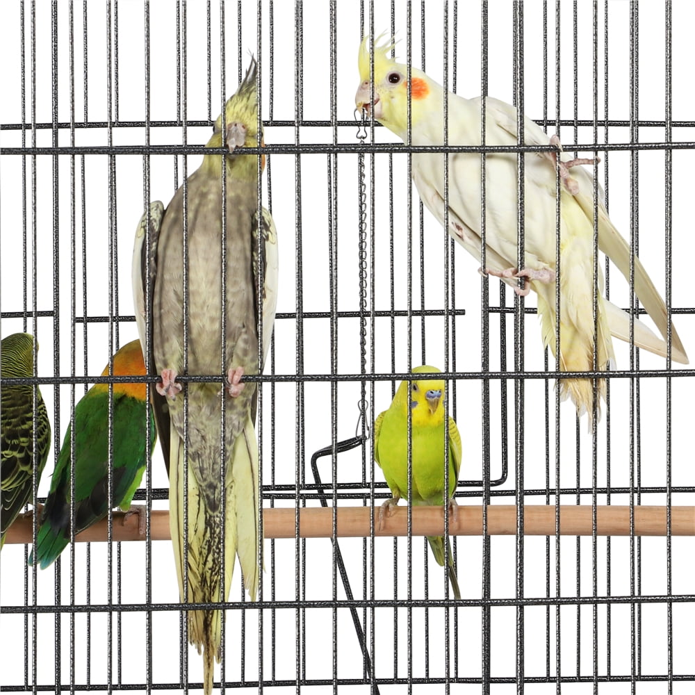 Spacious Home For Small/Medium Birds: This large birdcage offers your feathered friends a roomy living space of 31″ L × 20.5″ W × 37.2″ H. The 5/8″ bar spacing is crafted to provide a safe habitat for various small to medium-sized birds, such as lovebirds, cockatoos, small conure cockatiels, and medium-sized parakeets Safe & Secure: The two front doors of this large bird cage are secured with latches to prevent your smart escape artists from opening the doors and keep them safe in the cage when you are not around Smooth & Effortless Rolling: The four-wheeled stand allows for the convenient maneuverability of this large birdcage. Ball-shaped casters can roll smoothly in all directions Additional Shelf For Bird Supplies: The open shelf under the birdcage provides a convenient storage space for essential cleaning tools, bird toys, and seeds Cage Accessories Included: For your convenience, this cockatiel cage comes with 3 polished wood dowel perches and four feeders