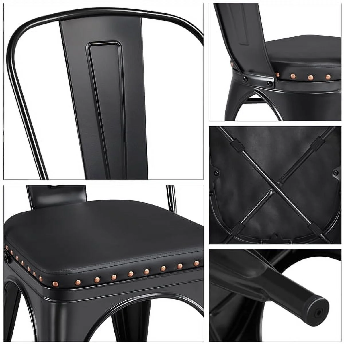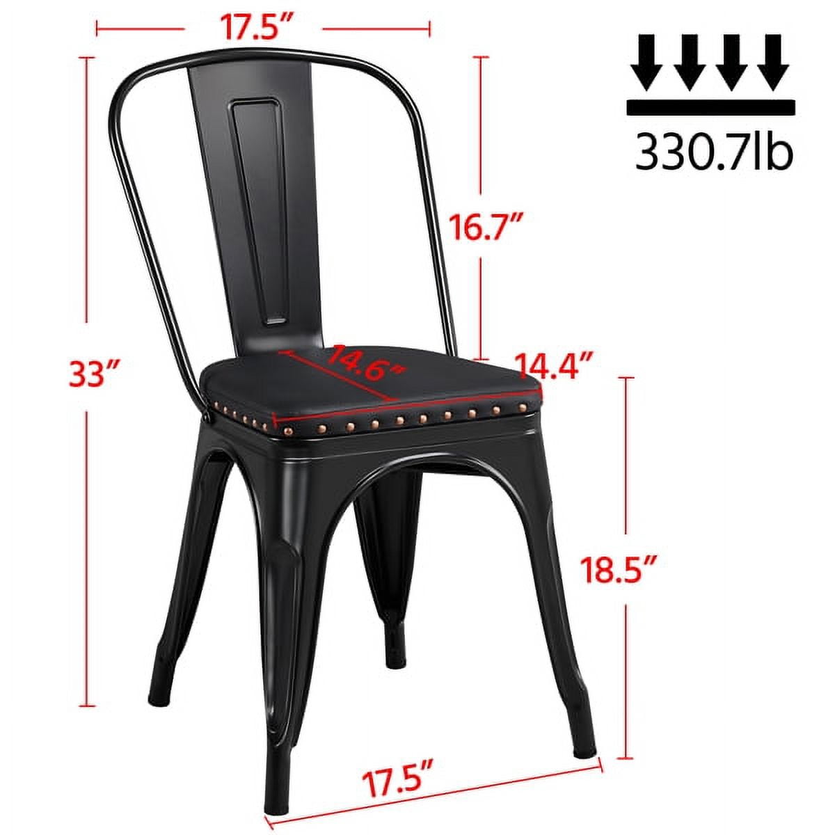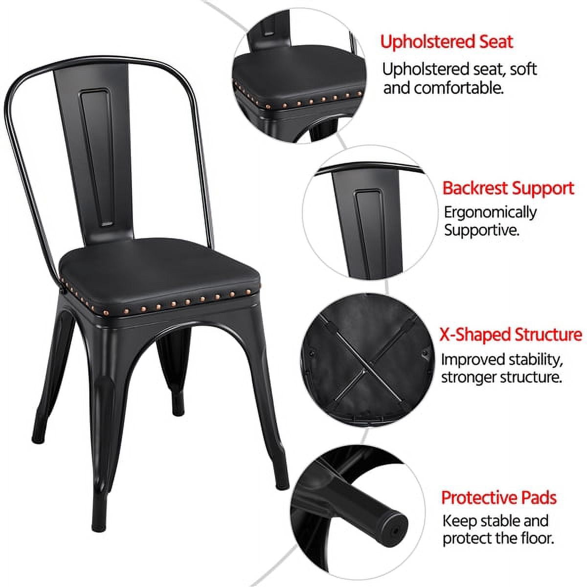 *Features: Soft cushion & reliable backrest: To improve comfort, we adopt upholstered seat and ergonomic backrest so that you feel comfortable and relaxed when you sit on the chair. After a long day, sit down and enjoy delicious foods with your beloved. Fashion punk style: Our dining chairs feature fashion punk style and full black color with matt finish. The metal frame matches leather upholstered seat with riveted sides. These fashion dining chairs are durable, fully-sealed, and fabulous. Set of 4 chairs: As a perfect set of kitchen furniture, our dining chairs are sold in 4 pieces with good value, ideally suitable for a dining table or a counter. You can set them up in your living room, yard, porch, etc. If you are running a restaurant, this set of 4 stylish chairs will be perfect to add extra fashion to your place. X-shape supports: Under the seat, there is an X-shape support to reinforce the weight capacity. The maximum load bearing of each dining chair is 150kg/330.7lb. For your safety, please do not overload or stand on the chairs. Removable backrest: If you do not need the backrests, you can remove them, and the dining chairs will become simple bar stools, which also makes the stools stackable, saving space and easy to organize. Quality materials: The industrial style kitchen chairs are made from metal with matt finish. It is easy to clean, just a wet cloth will do the job. The legs of the kitchen chairs have protective footpads to avoid scratching and damaging. Warm service: Your satisfaction is always our pursuit. All matching accessories and instructions are accompanying the products. If you have any problems and questions, please do not hesitate to contact our customer service.