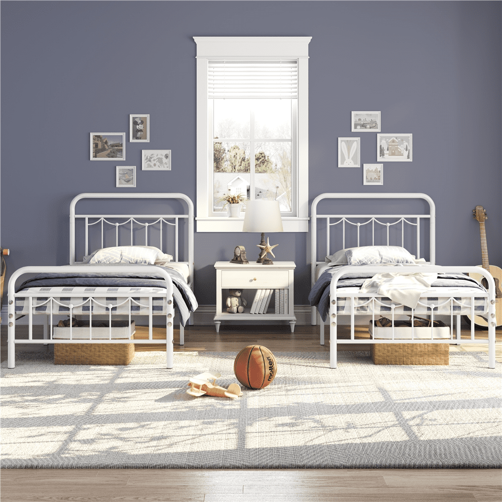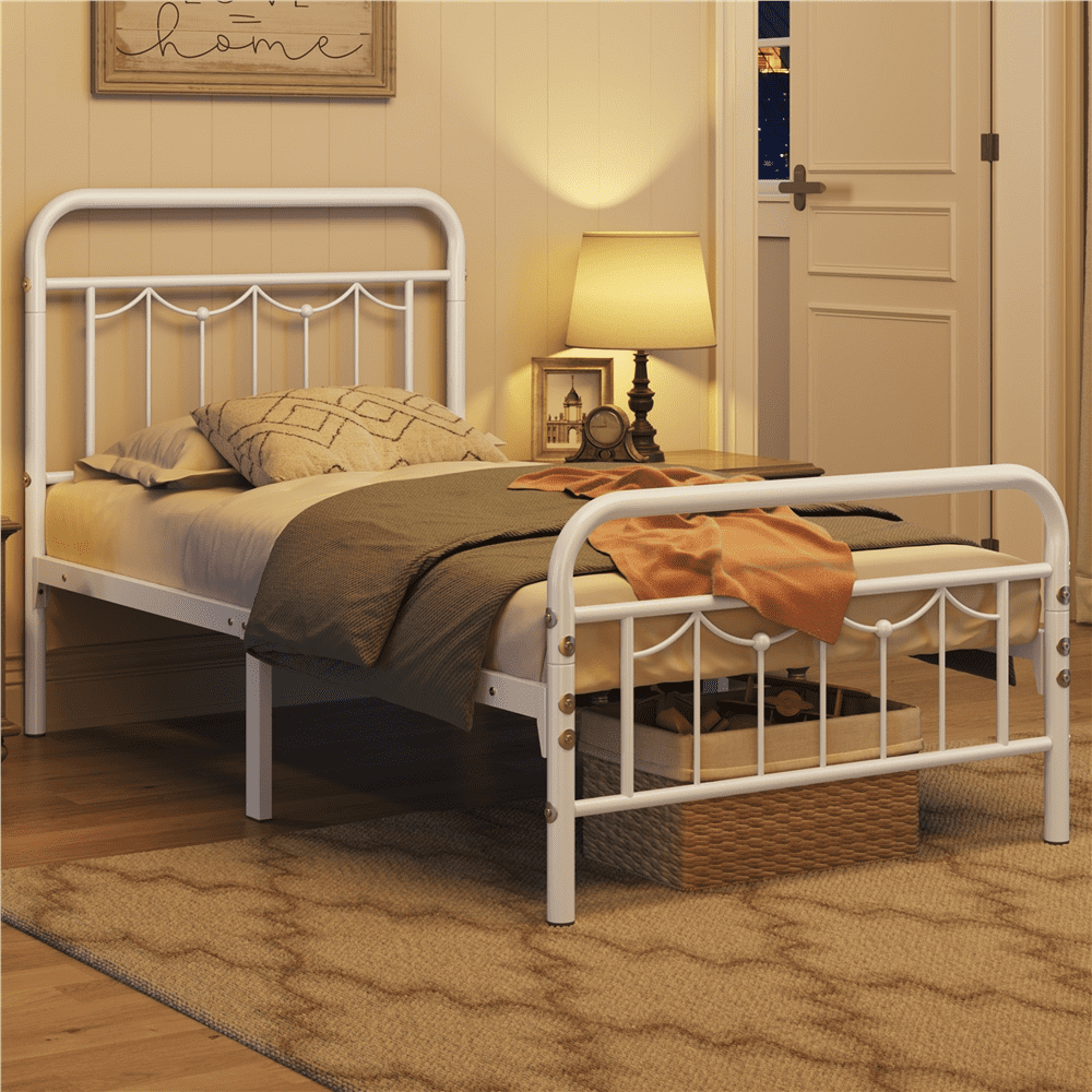 Alden Design Metal Platform Bed with Vintage Headboard and Footboard, Twin, White, Adult