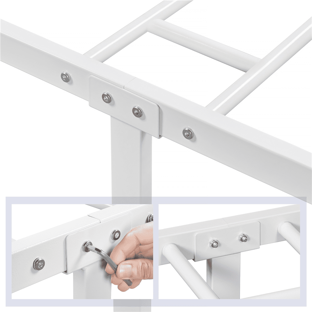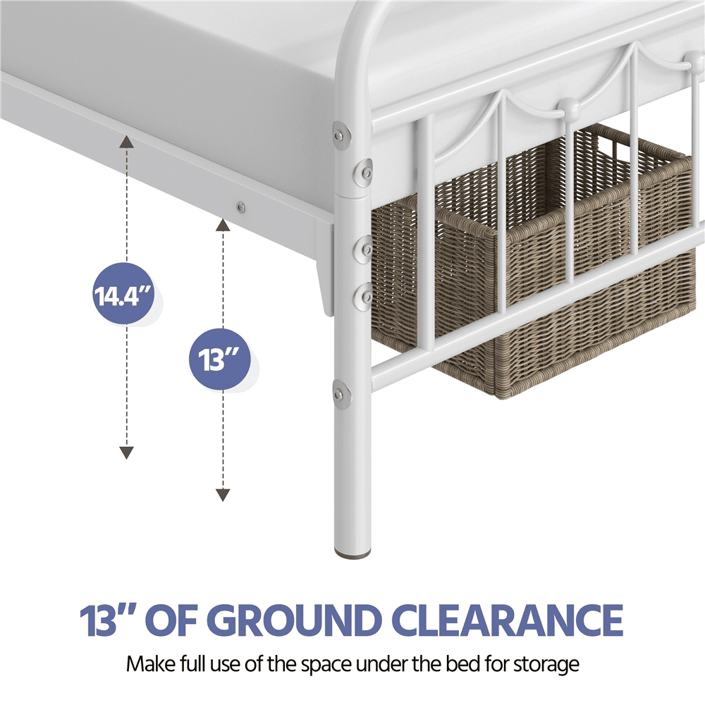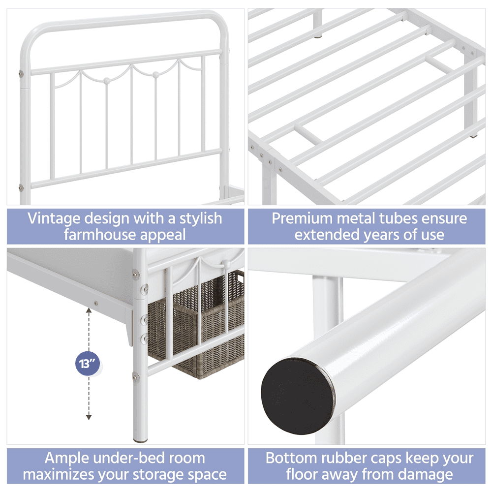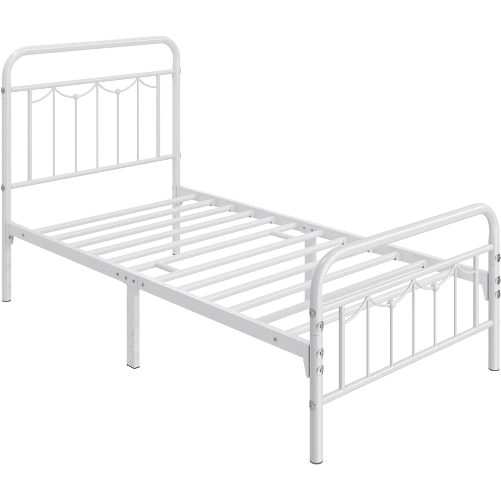 Ultra-Durable Steel Construction: Constructed completely of a powder-coated steel framework, this twin size bed frame features solid slats and multiple sturdy legs, with a maximum weight capacity of 450 lb, which all together provides reliable stability. No Box Spring Required: The 12-slat support system eliminates the need for a clumpy box spring, so once you have tracked down a suitable mattress, you’re good to go. The slats are spaced 5.3 – 5.7″ apart. High Headboard & Footboard: By propping soft pillows behind your back, the high headboard creates a cozy snuggling spot for reading novels or browsing the web. Classic Farmhouse Sensibility: This twin bed frame showcases an adorned silhouette, graceful downward arches and a clean coating of white for a farmhouse appeal. Specifications: Material: Steel; Color: White; Overall Dimensions: 78″ L × 41″ W × 41″ H; Applicable Mattress Size: 75″ L × 39″ W; Maximum Weight Capacity: 450 lb.