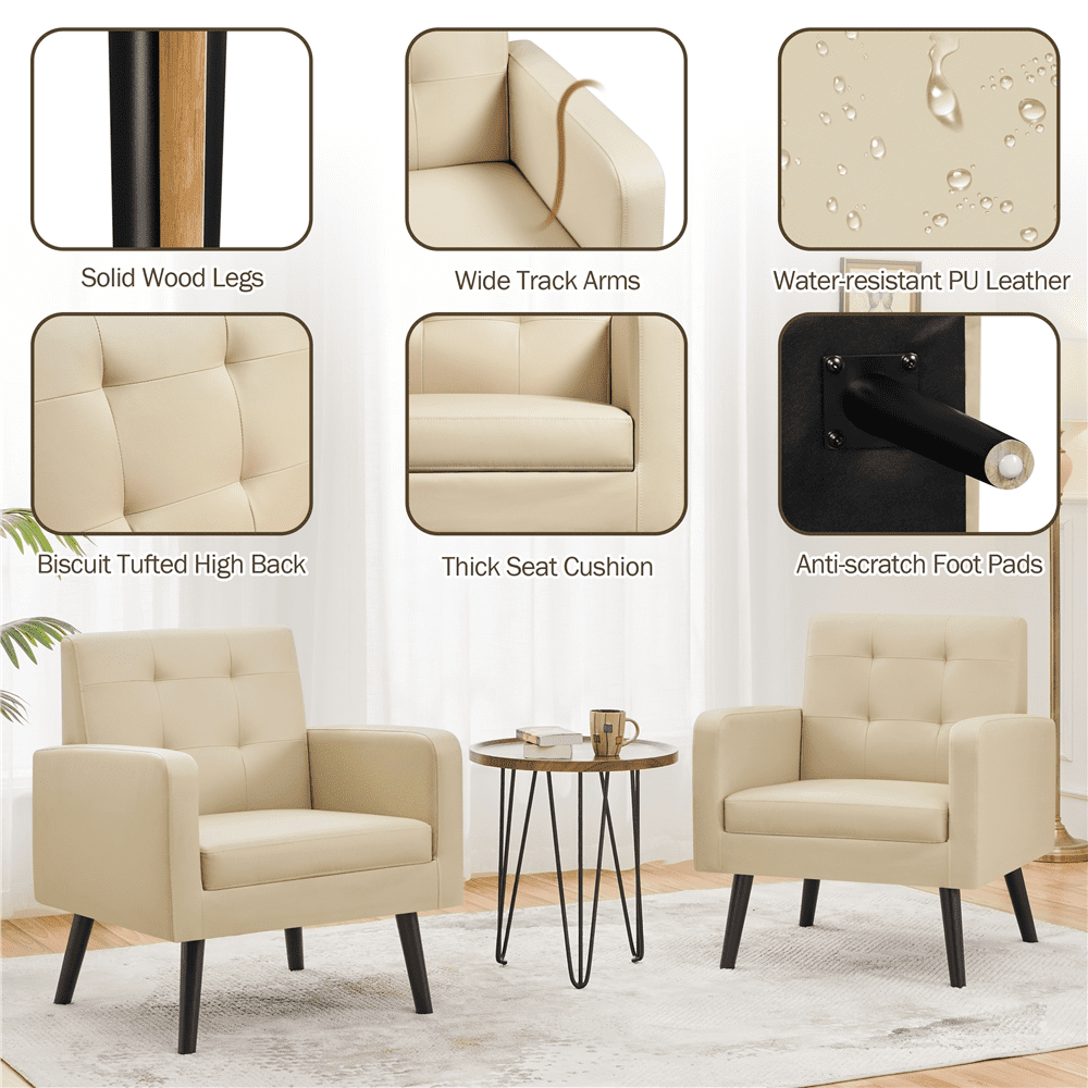 SmileMart Mid Century Faux Leather Tufted Accent Chair for Living Room, Beige Materials: PU leather, Foam, Solid wood, Composite board, Iron, Rubberwood Color: Beige Assembled Dimensions: 28.5″ L × 29″ W × 33″ H Seat Width: 21.7″ Seat Depth: 21″ Seat Height: 16″ Arm Height: 25″ Maximum Weight Capacity: 300 lb Item Weight: 38.3 lb Shipping Weight: 44.4 lb Note: Please allow a 0.5″ measurement tolerance. Comfortable and Supportive Elegant Tufted Chair