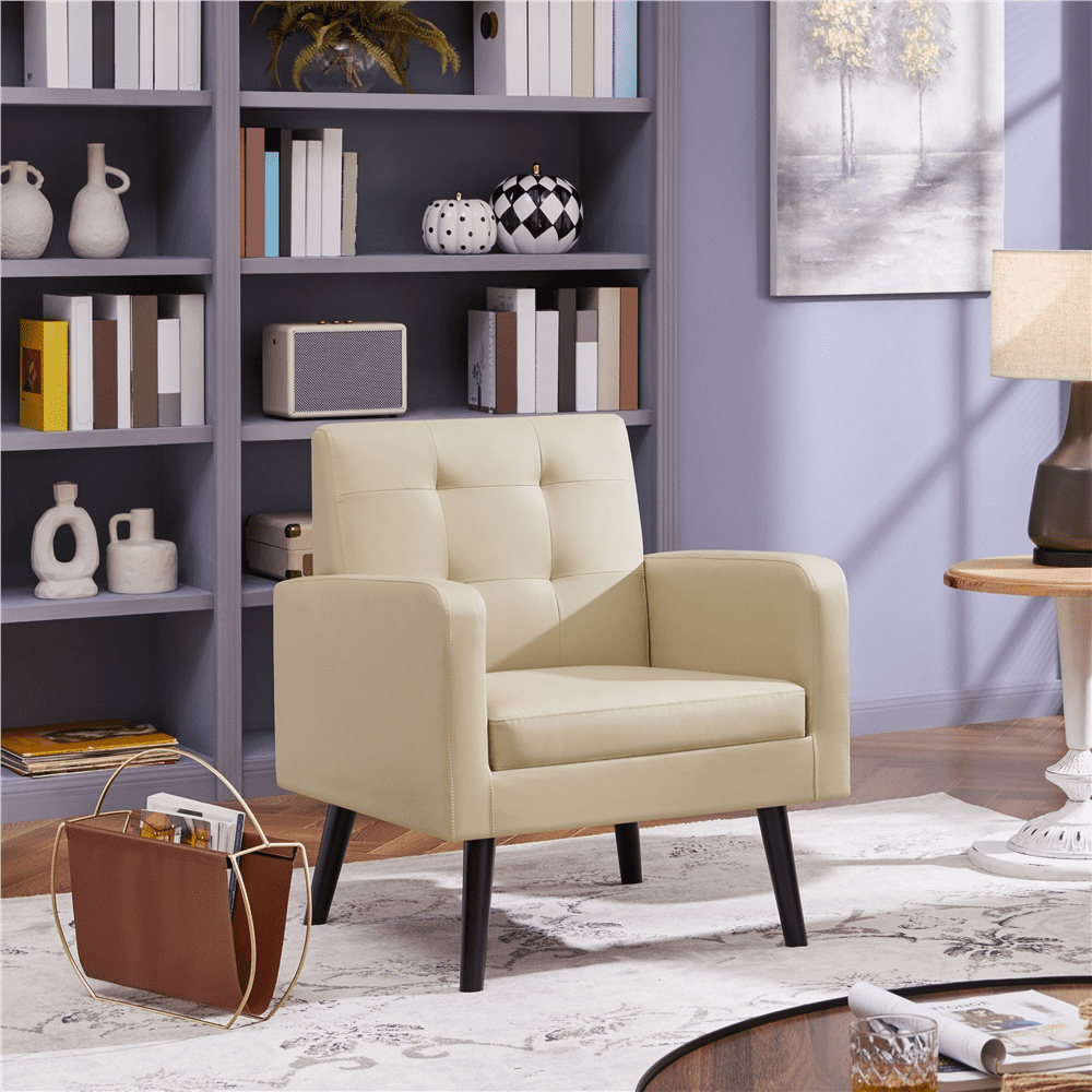 Alden Design Mid Century Faux Leather Tufted Accent Chair for Living Room, Beige