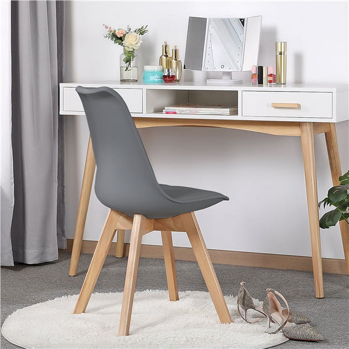 This set of four dining chairs is popular because of their versatile color and beech wood legs. They are stylish, modern, and perfect for a range of home decor styles. The seat and the backrest are molded in one piece, which makes the chairs durable, good-looking, and comfortable. To improve comfort, the backrest is designed in a curved shape so you can sit for long hours. This set of four is perfect for any living room, kitchen, sitting room, porch, balcony, office, etc. The high-quality materials are durable and sturdy, guaranteeing they last a long time. For your safety, please do not stand on the chairs. The modern-style kitchen chairs are equipped with protective pads at the bottom which are made from felt cloth. These pads protect the floor from being scratched and damaged.