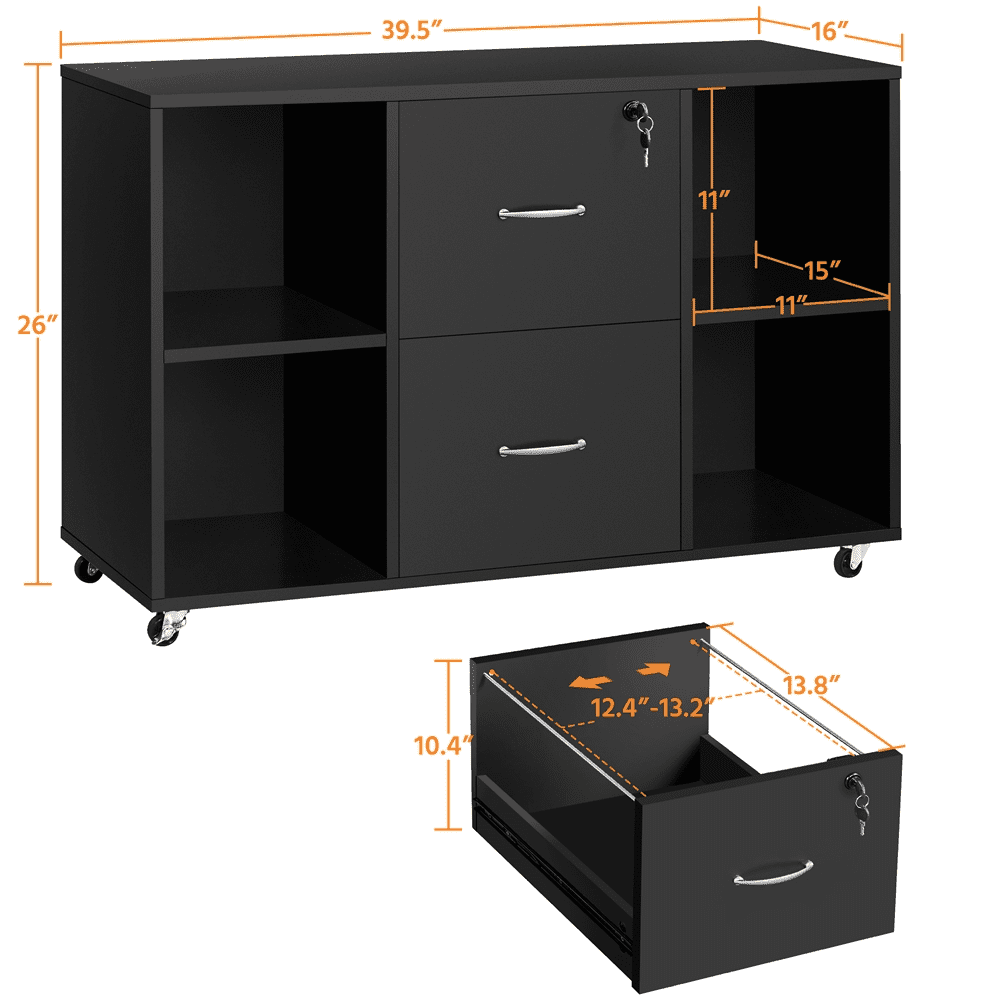 SmileMart Mobile Vintage File Cabinet with 2-Drawer for Home and Office, Black Color: Black Materials: MDF, particle board Assembled Dimensions: 39.5″ L × 16″ W × 26″ H each drawer: 13.8″ L × 13.2″ W × 10.4″ D each shelf: 11″ L × 11″ W × 15″ D Max Weight Capacity: topboard: 154 lb; each shelf: 22 lb; each drawer: 44 lb Shipping Weight: 70.5 lb Item Weight: 66 lb Note: Please allow ±1/2″ measurement tolerance. Please do not overload this chest for your safety.