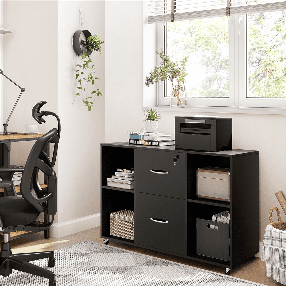 Alden Design Mobile Vintage File Cabinet with 2-Drawer for Home and Office, Black