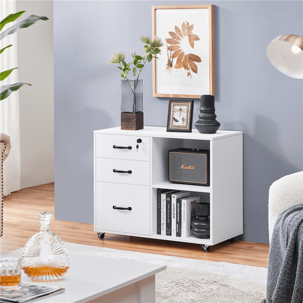 Looking for a file cabinet that’s both practical and looks great? Check out this vintage-style cabinet! With plenty of storage space, including 3 drawers and 2 shelves, you can keep all your files and documents organized. The large drawer even accommodates foolscap or A4 suspension filing. Made with high-quality materials, CARB P2 MDF and particle board. This file cabinet is sturdy, durable and made with quality in mind. This rolling cabinet is designed with 4 smooth wheels for quiet and flexible mobility, 2 of which are arranged with built-in brakes to allow the cabinet to firmly stay in place. The top drawer is designed to be lockable, so that you can store your important or personal items within. The lock is arranged on the top right hand corner of the drawer to facilitate you turning the key without being hampered by the knob. Plus, it looks great in any home or office setting.