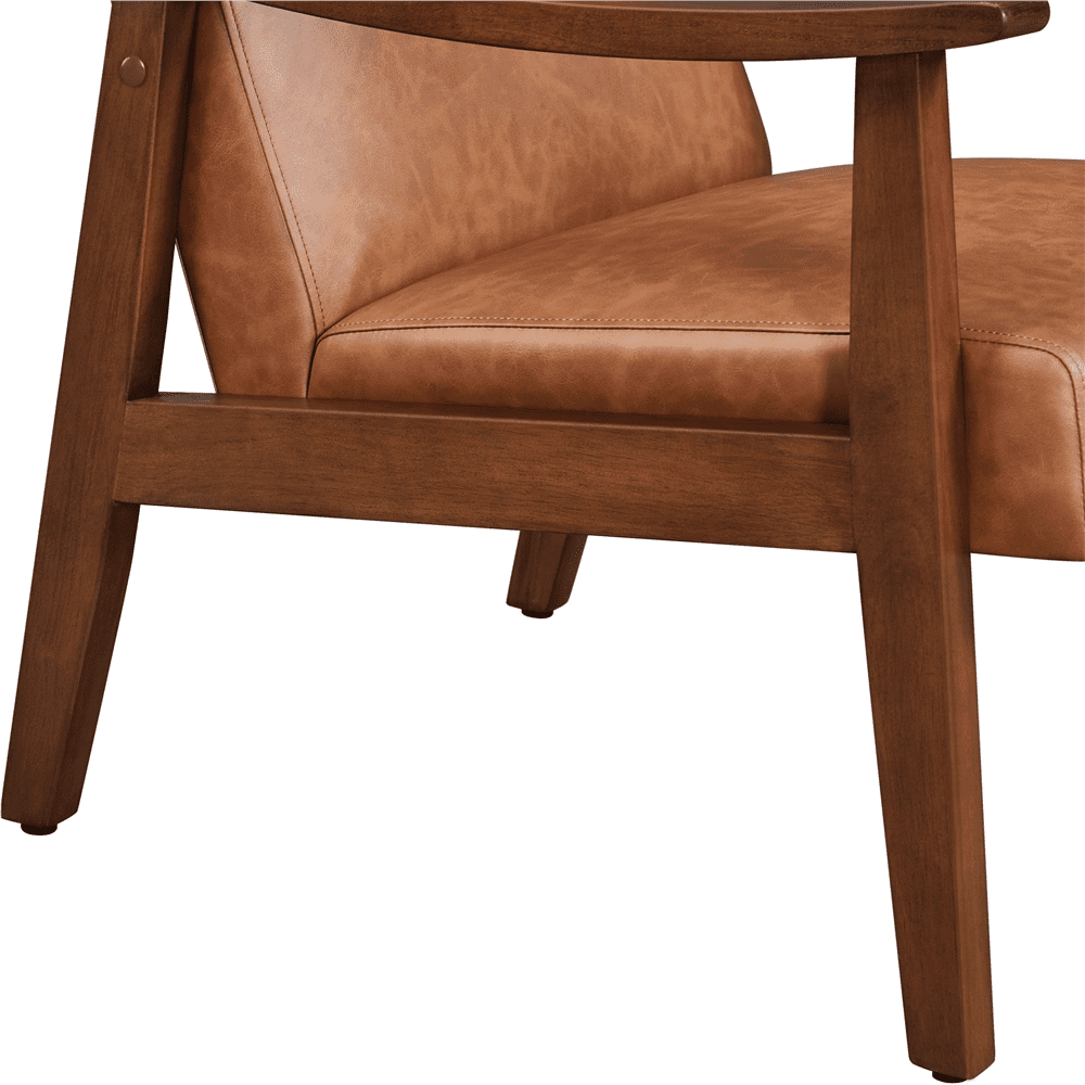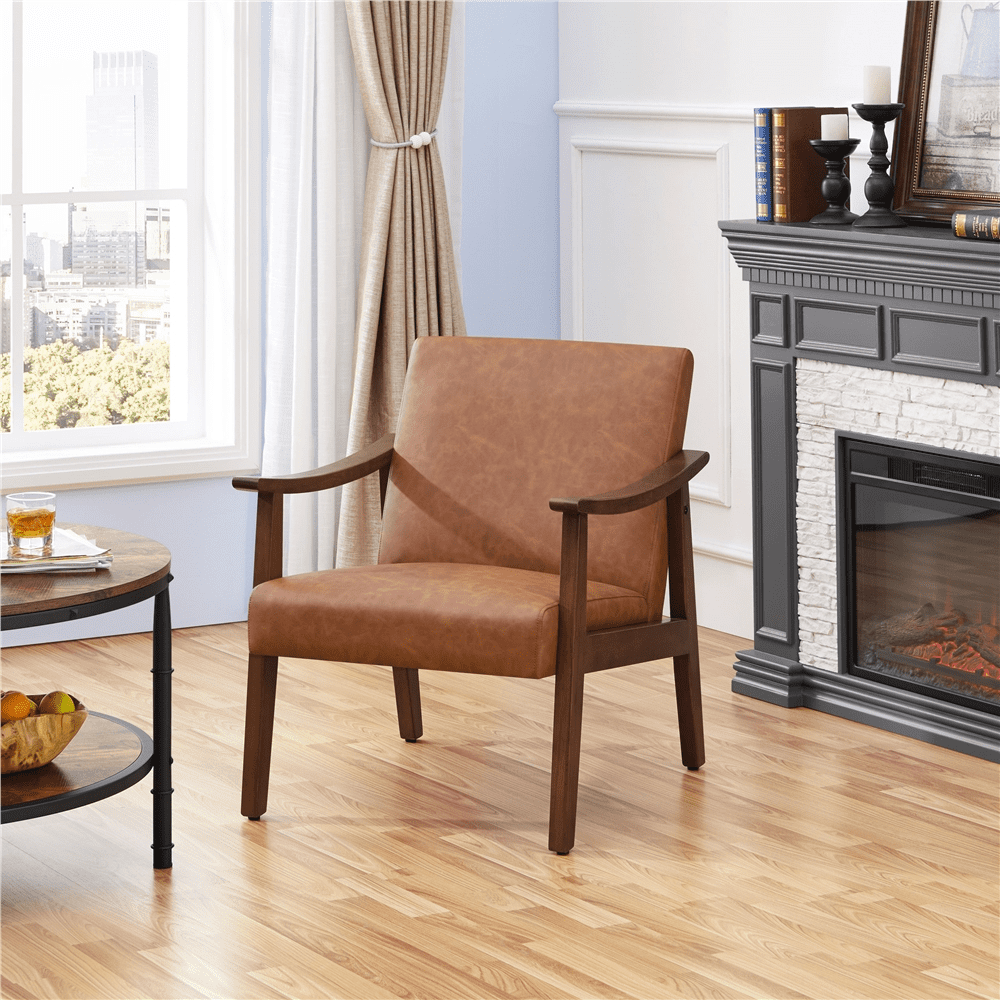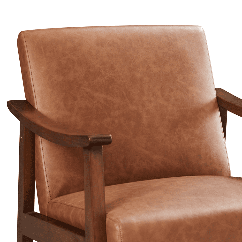 Want a piece to uplift your room? This faux leather accent chair combines a mid-century modern style with a warm color tone, which will easily blend with any home decor. The PU leather upholstery complements the wood side frame, bringing a charming and retro vibe to your room. The armchair features a solid wood & manufactured wood frame for excellent sturdiness and stability. With a cushioned seat and a slanted backrest, you can sit comfortably with a cup of tea and a book. Plus, the low-profile design and extra-long armrest add an extra laid-back feel. A great addition to the living room, bedroom, office, or guestroom of your house or apartment.