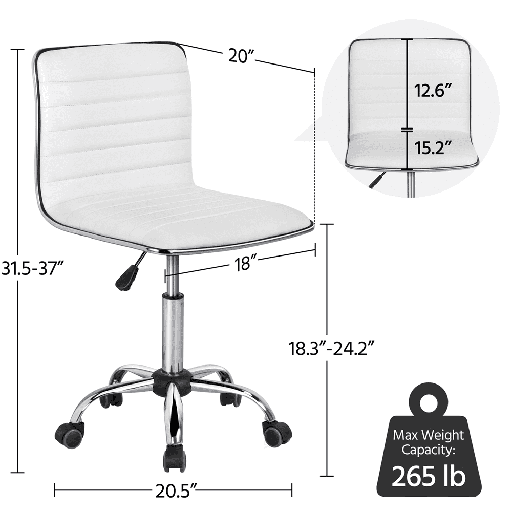 This armless chair is constructed with deluxe PU leather, high-density foam, a premium gas lift, a strong metal base, and a durable engineered wood frame. With its solid structure and high load capacity of up to 265 lb, this task chair is strong and sturdy enough for daily use. The 360° swivel casters and seat make it easier to fetch items and multitask. This elegant, ribbed task chair will be a stylish addition to your bedroom, study, dorm room, office, and more. The armless design allows the chair to slide easily under your makeup table, computer desk, writing desk, or office desk, saving valuable space.