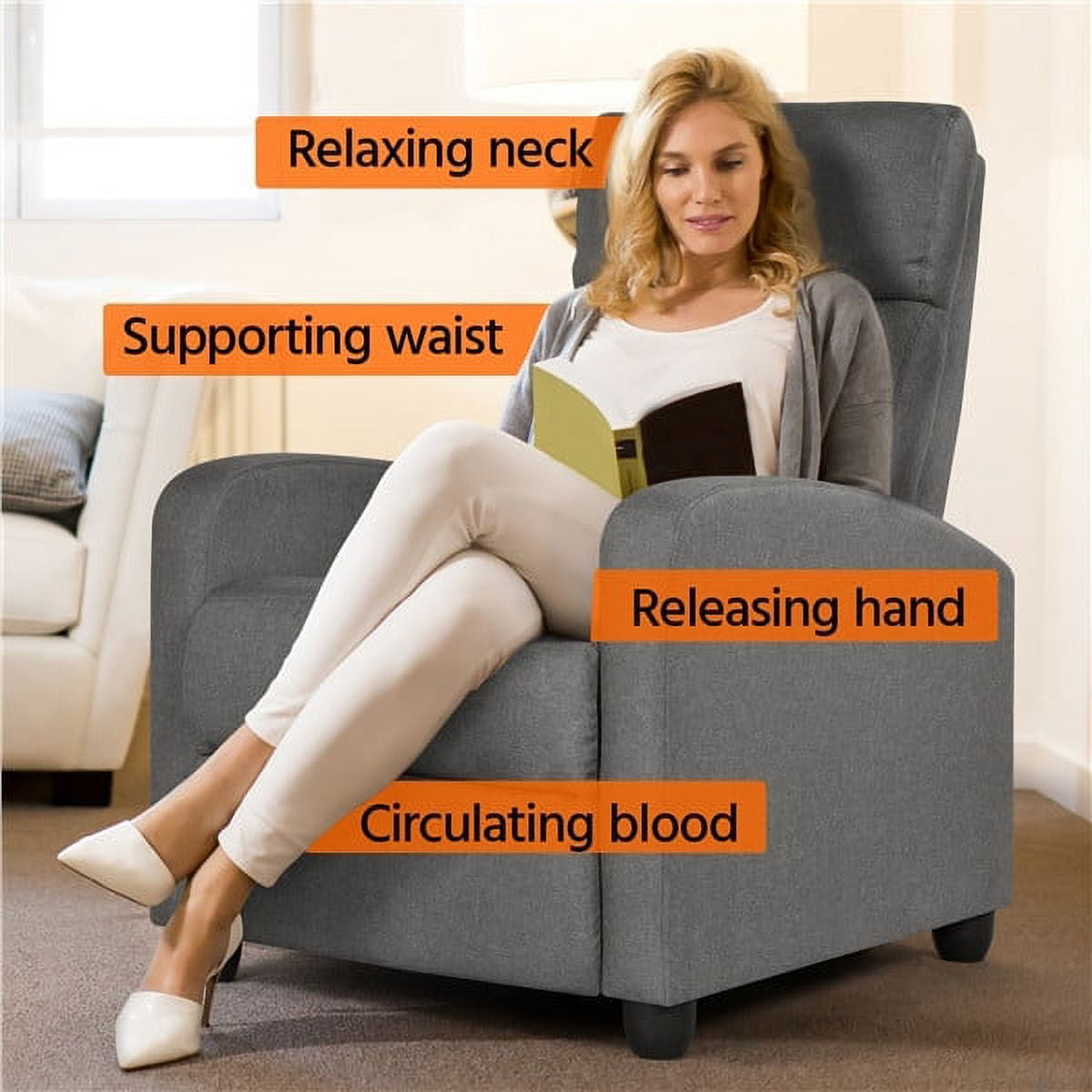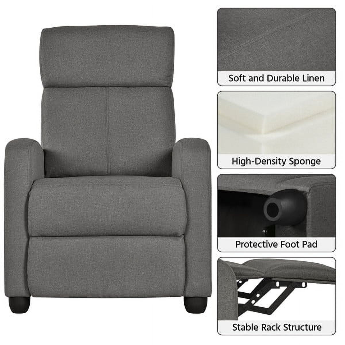 Alden Design Modern Adjustable Fabric Recliner with Footrest, Set of 2, Gray: Sturdy & Comfortable Recliner Adjustable Footrest Easy-to-assemble Color: Gray Materials: Polyester Fabric, Composite Board, Foam, Metal, Fiber Fill Assembled Dimensions: 26.5″ W × 33.5″ D × 39.5″ Fully-reclined Dimensions: 26.5″ W × 62″ D × 30″ Seat Depth (approx.): 19.7″ Seat Width: 19.5″ Seat Height: 17.7″ Armrest Height: 22.4″ Backrest: 20″ W × 25.5″ Footrest Angle: 0-90° Maximum Weight Capacity: 265 lb Item Weight: 55.7 lb Shipping Weight: 63.9 lb