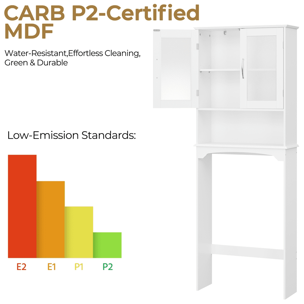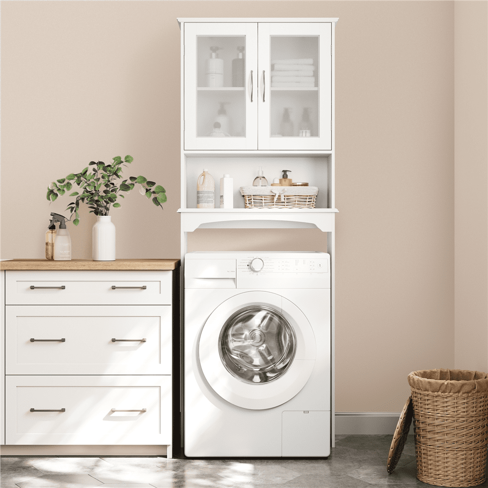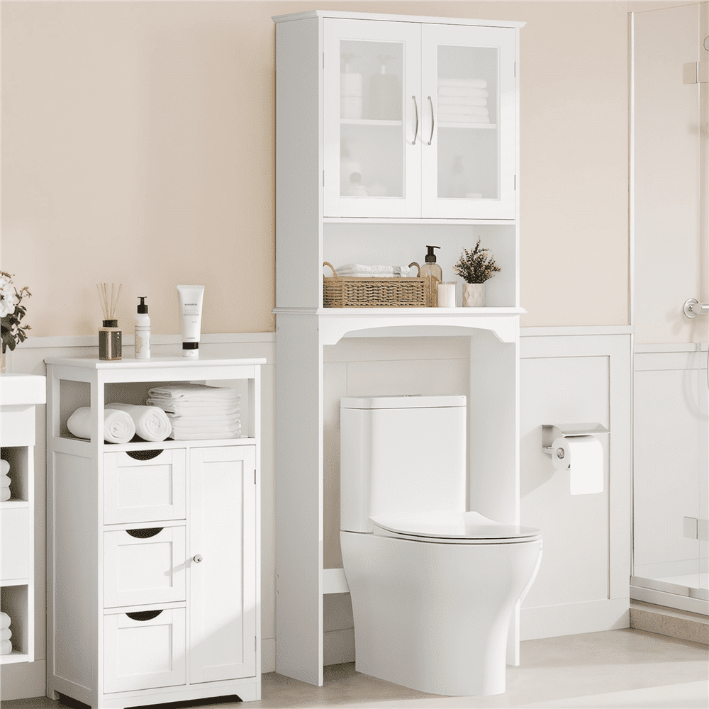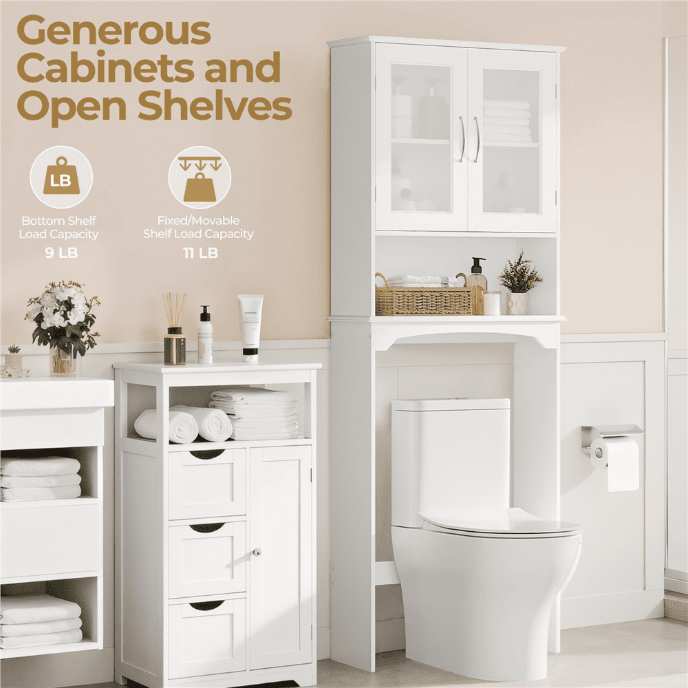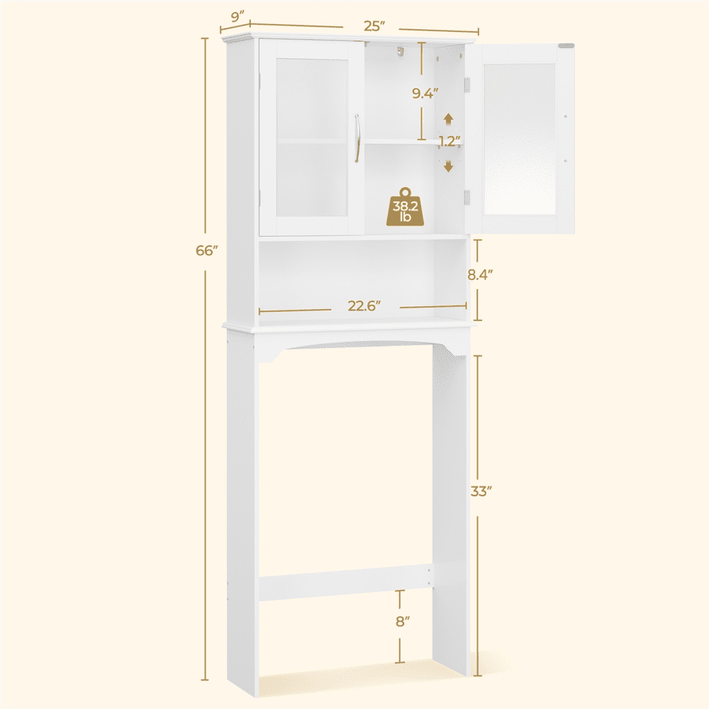 : Sturdy Construction: Multi-functional: Adjustable Shelf: Over the Toilet Storage: Specifications: Color: White Material: MDF, tempered glass Overall dimension: 25x9x66’’ (LxWxH) Cabinet Interior22.6x19x9’’ (LxHxD) Open shelf:22.6×8.4×9’’ (LxHxD) Adjustable shelf:8.2’’;9.4’’;27.10.7’’ Ground clearance:35’’ Max.loading capacity: Fixed panel:4kg/9lb; adjustable shelf:4kg/9lb G.W.:42.1lb N.W.: 38.1lb Note: 1. Please allow ±0.5’’ errors due to manual measurements.