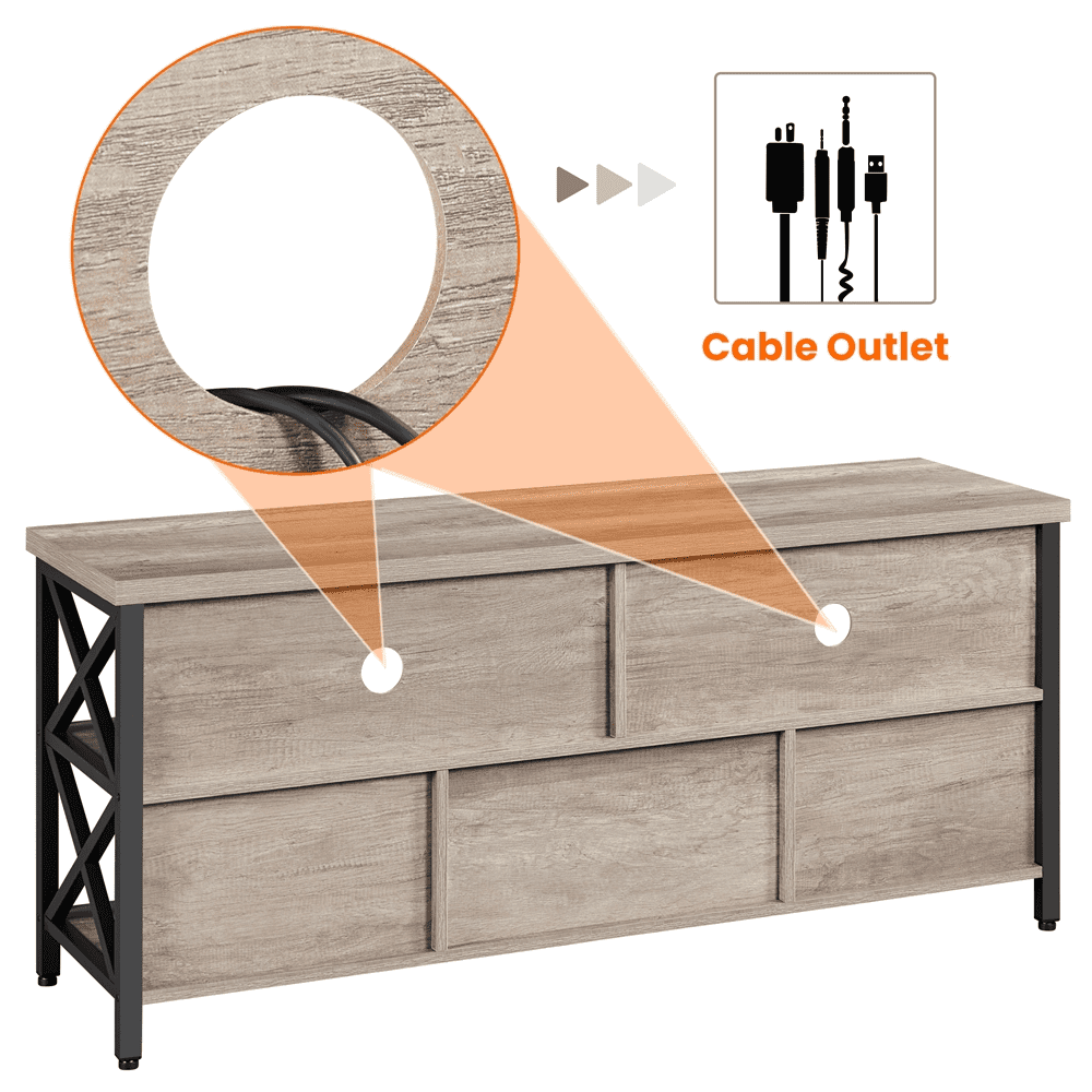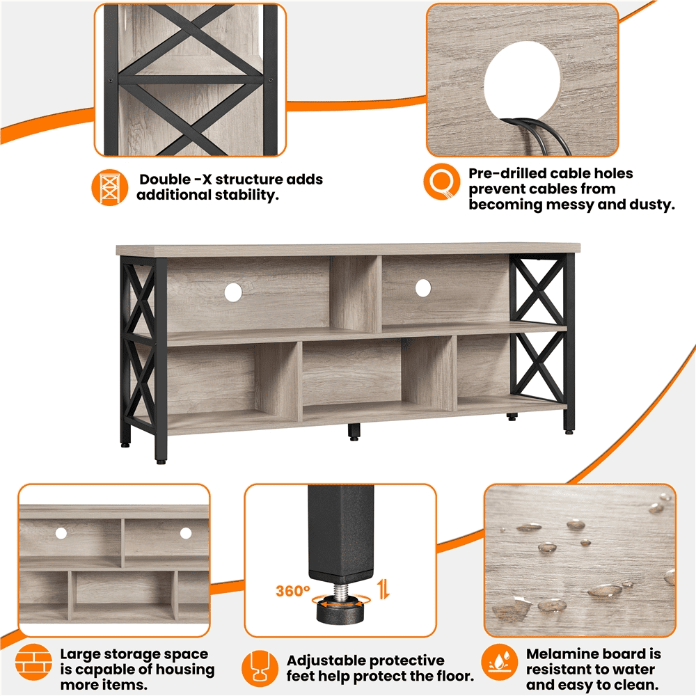 We are constantly vigilant for the latest furniture trends. Our industrial series reflects our approach to the surge in demand over the past few years for this industrial style. We see such a style not just as a trend that prevails but as the reveal of people’s yearning for emotional care and nourishment just as what these rustic, unadorned pieces that convey. We hope that our products are not just some pieces of cold furnishings but of warmth that can complement the style of your home and help create your home into a restful habitat to nest. This industrial TV console comes in 2 colors, rustic wood in higher saturation and grey in lighter tone. Both are made of high quality and durable particle board that’s been laminated. The sturdy iron frame is black matte coated and in the shape of a double X, not only reinforcing each side, but also counteracting the heaviness by adding airy expression. Our 55” industrial TV stand has 5 open compartments that come in 3 sizes. The 2 seamless large ones have pre-drilled cable management holes that can accommodate game consoles and the other 3 can house trinkets, souveneirs and more.