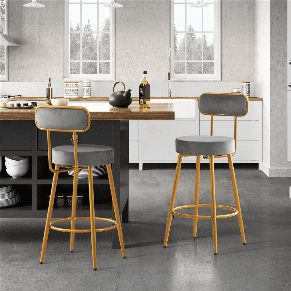 Crafted Barstools: Made from durable and soft velvet-like fabric, well-padded foam, and metal with golden powder coating, these 2pcs barstools have a luxurious appearance and modern style. The maximum weight capacity of each stool is 300 lbs Counter Height Stools: With a seat height of 26 inches, this bar stool set is an ideal option for dining counters or tables that are 35″ to 39″ high. Two stools can tuck neatly underneath the table, providing plenty of legroom and serving you well for any fancy dinner or party Ergonomic Back: With a 10.2″ mid back, you’re not easier to lean over and feel tired even after sitting for a long time. The upholstered backrest can fully support your lower lumbar, preventing you from hunching Elegant Velvet Furniture: Velvet fabric is made to last and soft to the touch, not easy to wrinkle. It offers a feeling of warm, luxury, and elegance to your home Easy Installation: It only takes three steps to assemble each round counter stool, and we provide all the necessary accessories, hardware, and illustrated instructions to help you enjoy delightful meals in no time Specifications: Qty.: 2; Color: Dark Gray; Materials: Polyester, Foam, Metal; Assembled Dimensions: 15″ W × 17.5″ D × 36″ H; Maximum Weight Capacity (ea.): 300 lb