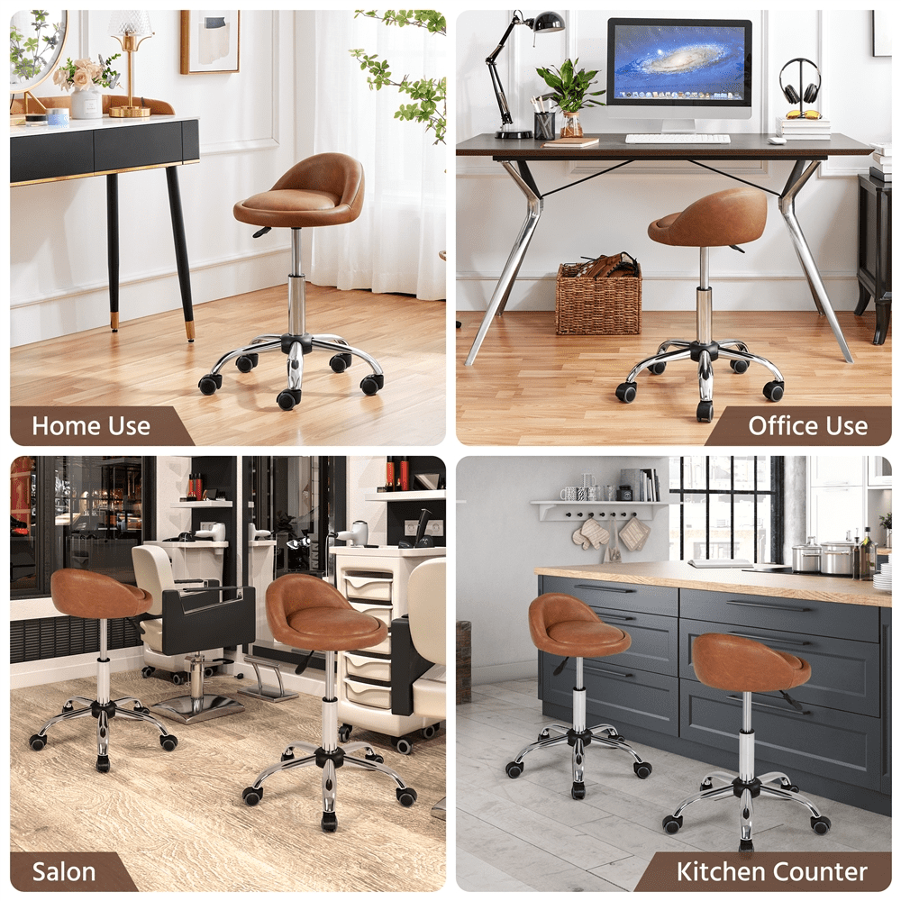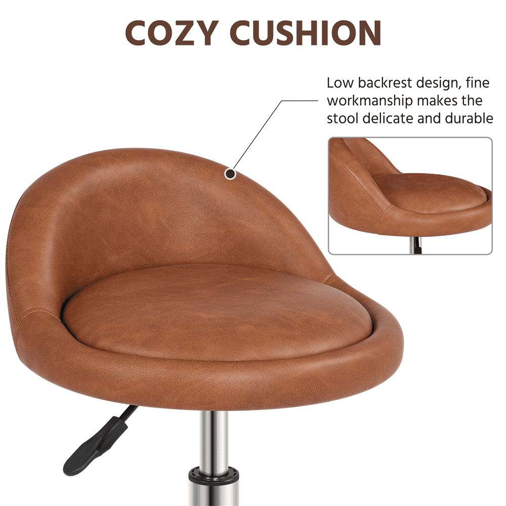 Alden Design Modern PU Leather Rolling Salon Stool with 5 Castors for Spa Massage Manicure, Brown Color: Brown Material: PU Leather, Foam, Steel Overall Dimension: 20.5″ L × 20.5″ W × (22-28)″ H Seat Dia.: 14.2’’ Cushion Thickness: 2.8’’ Seat Back Height: 6.3’’ Adjustable Seat Height: 18.3-24’’ Max. Loading: 265 lb Shipping Weight: 11.7 lb Item Weight: 10 lb Note: Please allow ± 0.5″ errors due to manual measurement. Adjustable Height 360° Swivel Assembly Required Residential Use