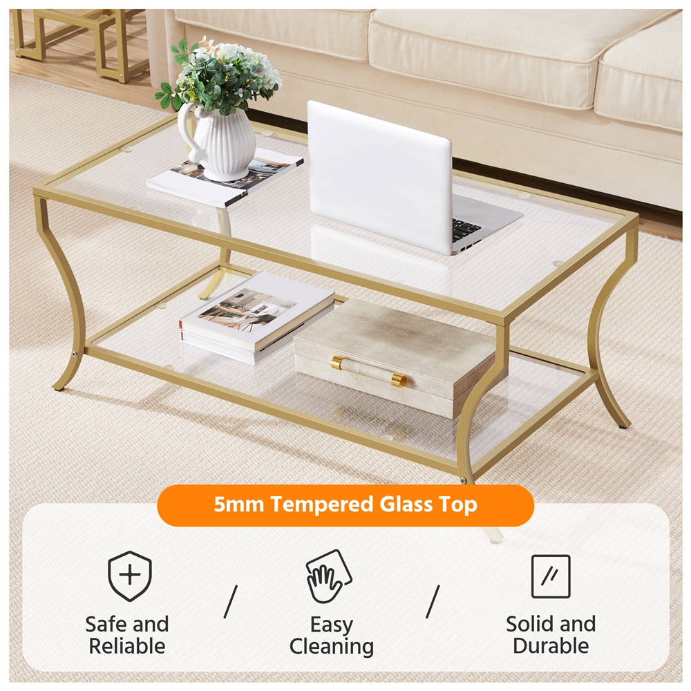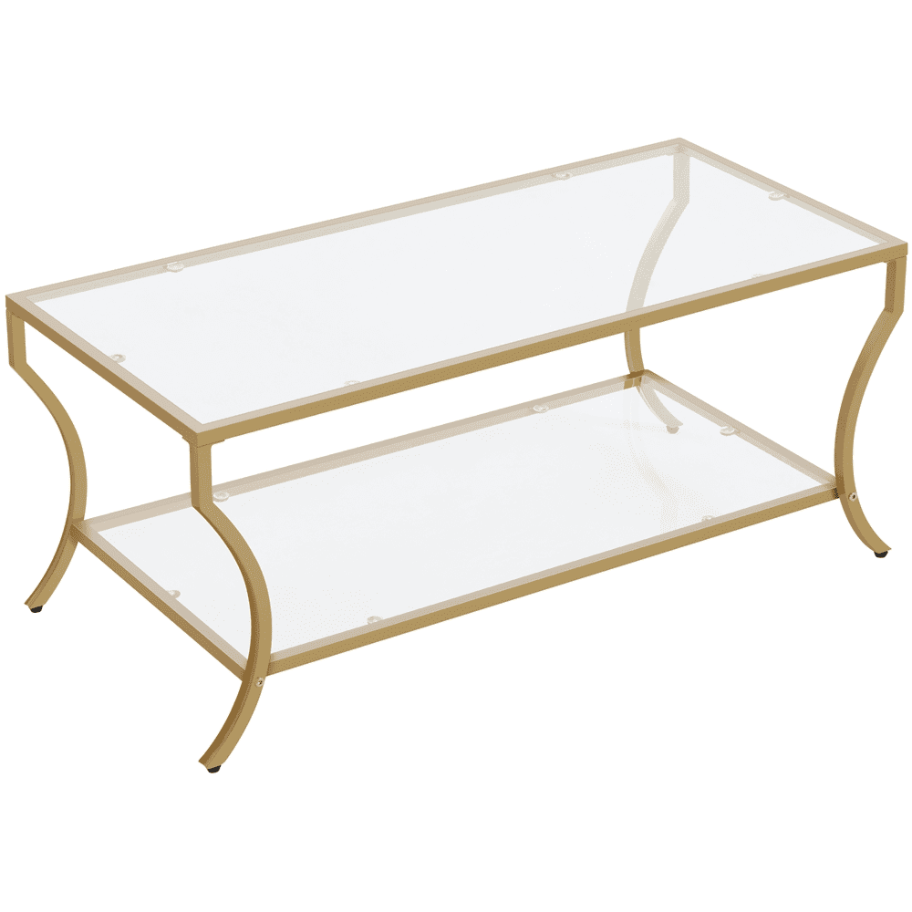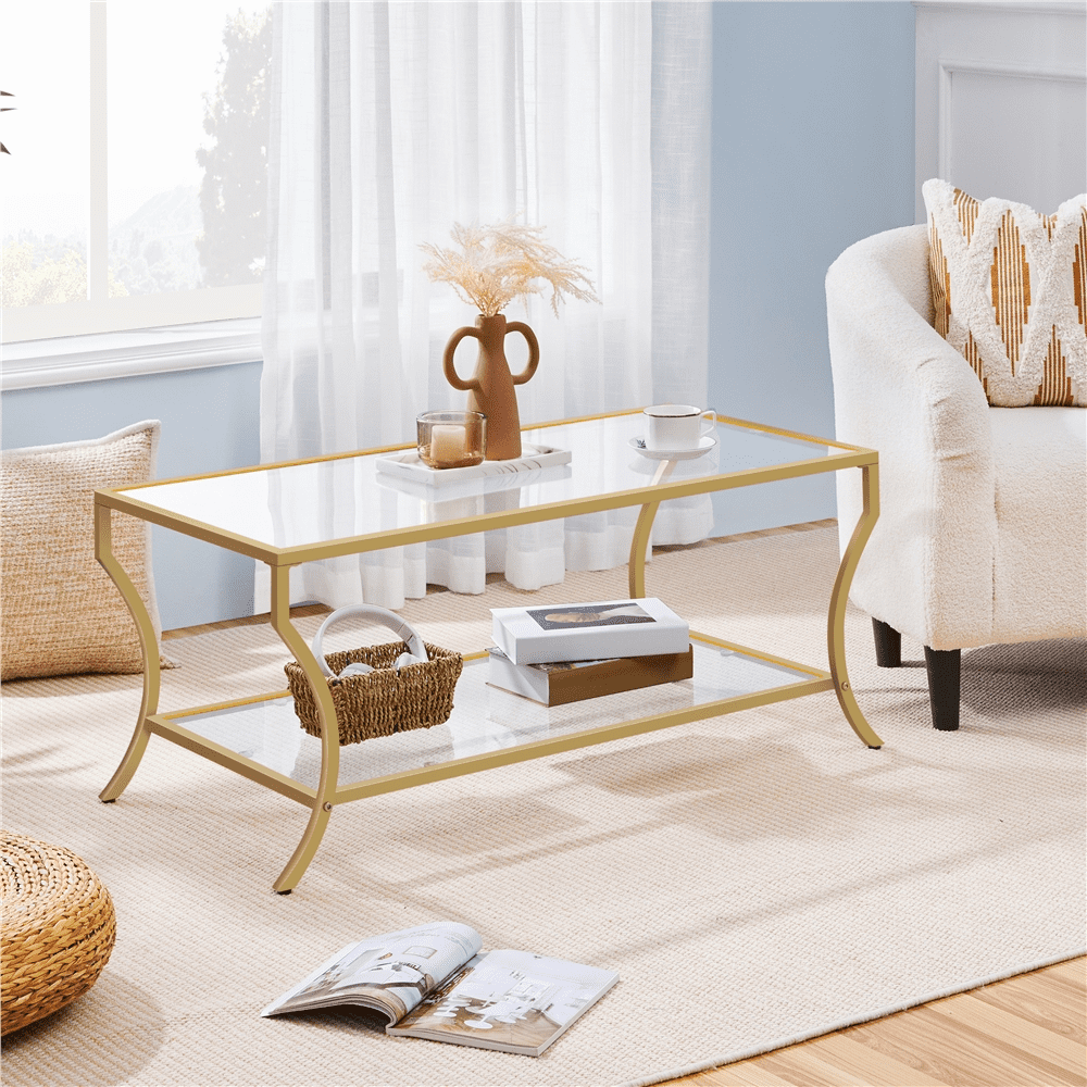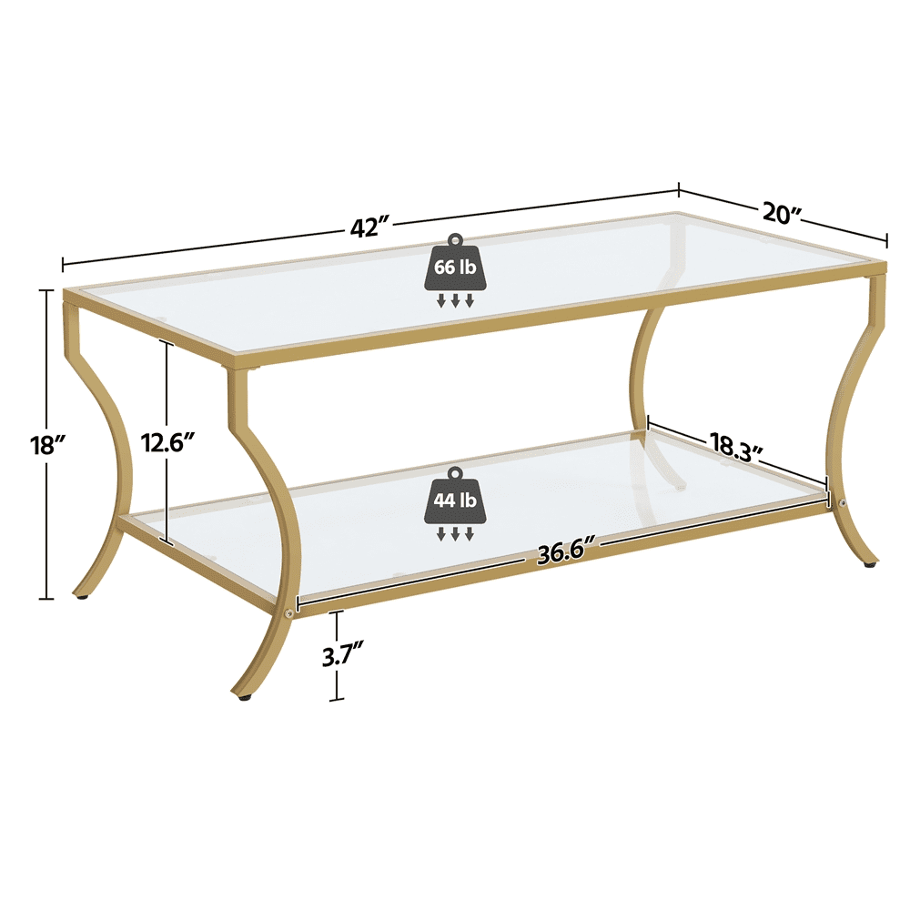 Alden Design Modern Storage Rectangular Tempered Glass Coffee Table with Iron Framed, Gold Stylish and modern design with a gold iron frame Durable tempered glass tabletop for high transparency and strength Overall dimensions 42″ L × 20″ W × 18″ H Spacious 2-layer structure with a lower shelf measuring 36.6″ L × 18.3″ W × 12.6″ H Max weight capacity 66 lb for the tabletop and 44 lb for the lower shelf