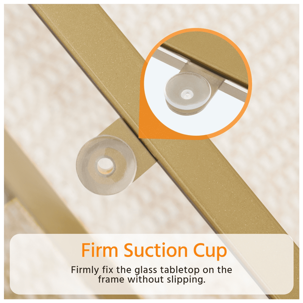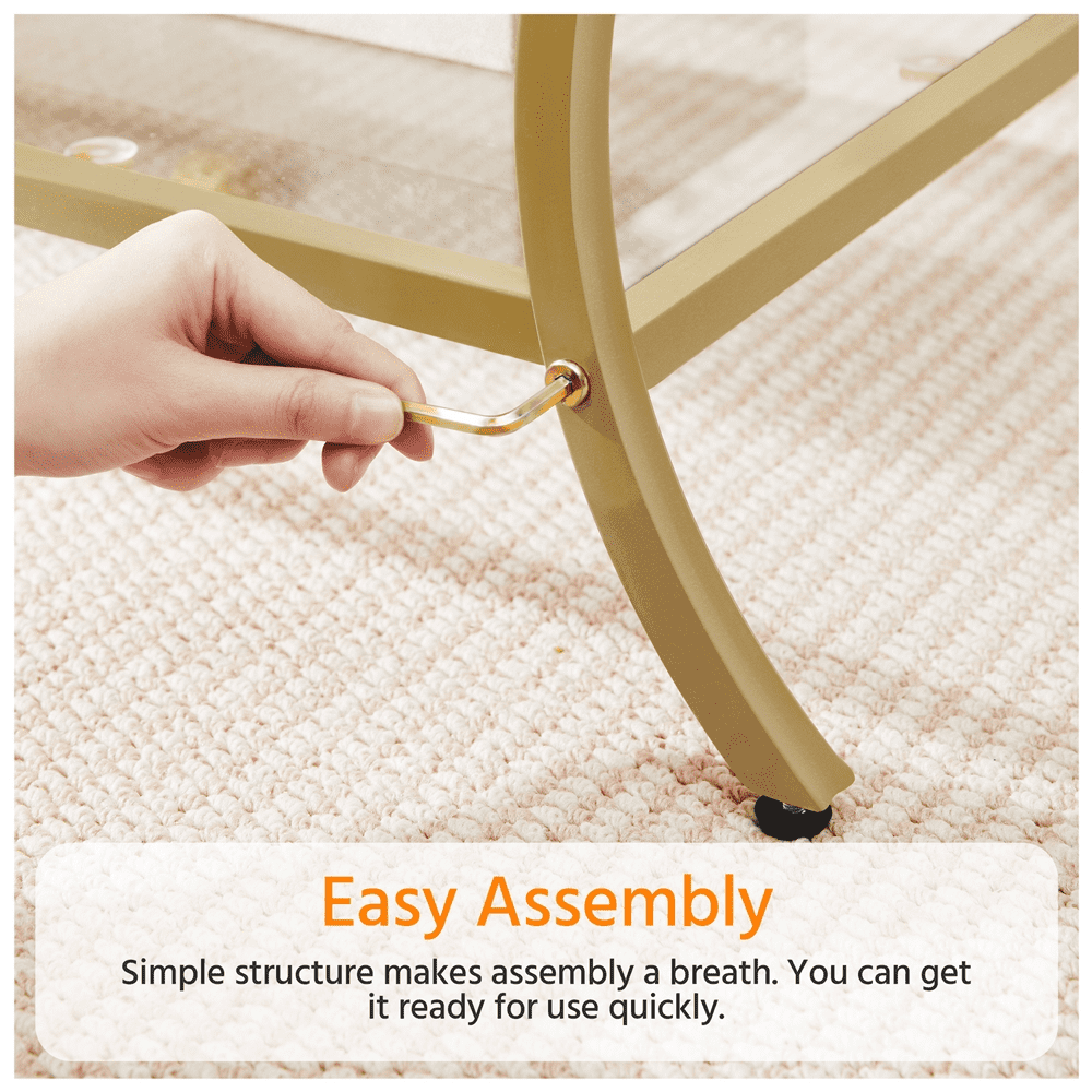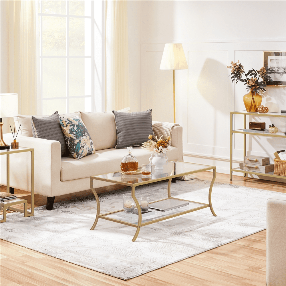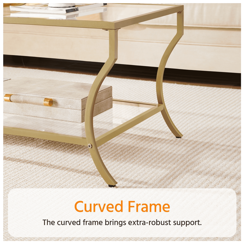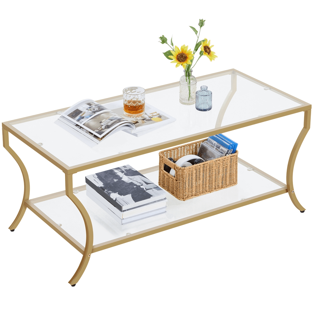 Alden Design Modern Storage Rectangular Tempered Glass Coffee Table with Iron Framed, Gold Stylish and modern design with a gold iron frame Durable tempered glass tabletop for high transparency and strength Overall dimensions 42″ L × 20″ W × 18″ H Spacious 2-layer structure with a lower shelf measuring 36.6″ L × 18.3″ W × 12.6″ H Max weight capacity 66 lb for the tabletop and 44 lb for the lower shelf