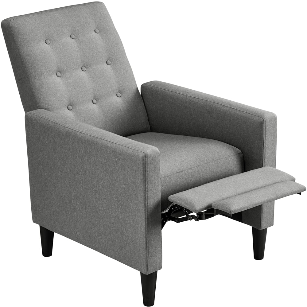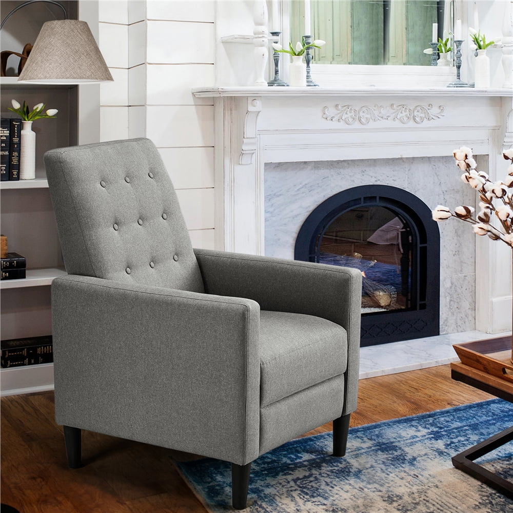 Spruce up your bedroom or living room in streamlined style with mid-century modern fabric recliner. This adjustable recliner is constructed of a strong composite wood frame, high-density foam, quality metal spring, and hard-wearing 100% polyester cover. The robust recliner sofa is capable of holding up 331 lb. The button-tufted details on the back showcase a touch of texture, and its neutral color tone can coordinate with any home decor. Fully reclined back and pop-up footrest let you relax and kick back with a movie after a long day at work.You can enjoy your favorite sitting positions on this adjustable reclining chair, no matter you prefer sitting up straight or with your legs up or lying flat. By a simple pushing at the backrest, the footrest instantly pops up and stops at any angle from 0 to 90 degrees.Our fabric reclining chair can be your private sofa in the living room, office, or bedroom to relax and take a load off, or a perfect spot to spend your leisure time with games, movies, TV dramas and music.