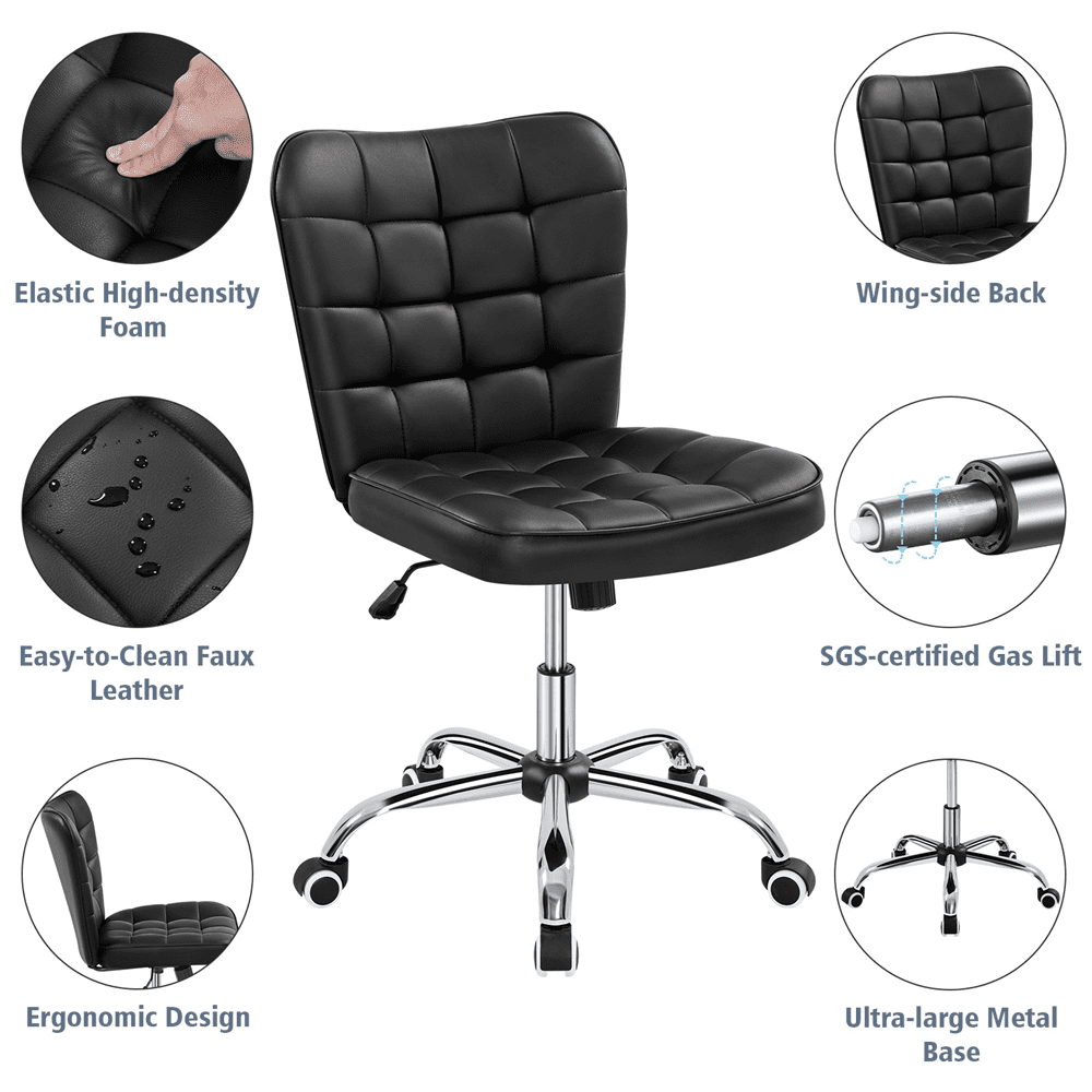 The considerate armless design has more flexibility to be compatible with your particular desk, so that you do not have to worry about extra measurements; Premium faux leather cover is both water-resistant and long-wearing; High-density foam is soft but firm at the same time, featuring deformation-resistant; The rocking function allows you to rock back and forth during breaks; A 360° smooth mobility lets you move easily from task to task; modern and minimalist appearance makes this armless office chair fit in various places. Age Group: Adult