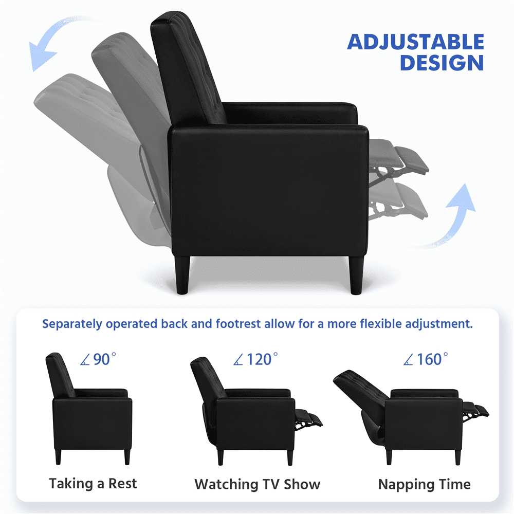 Alden Design Modern Tufted Faux Leather Recliner with Footrest for Living Room, Black Color: Black Material: Polyurethane (PU) Leather, Manufactured Wood, Solid Wood, Foam, Metal Assembled Dimensions: 26.5″ W × 32″ D × 40.5″ H Seat Depth: 20.7″ Seat Width: 20″ Seat Height: 19″ Fully Reclined Length: 58.7″ Backrest: 20″ W × 24.6″ H Footrest Adjustable Angle: 0-90° Maximum Weight Capacity: 331 lb / 23.6 stones Item Weight: 45.6 lb Shipping Weight: 52.5 lb Note: 1. Please do not jump or stand on this recliner. 2. Please allow a 1/2″ measurement tolerance. Smooth Reclining Mechanism Sturdy & Supportive Assembly Required Residential Use