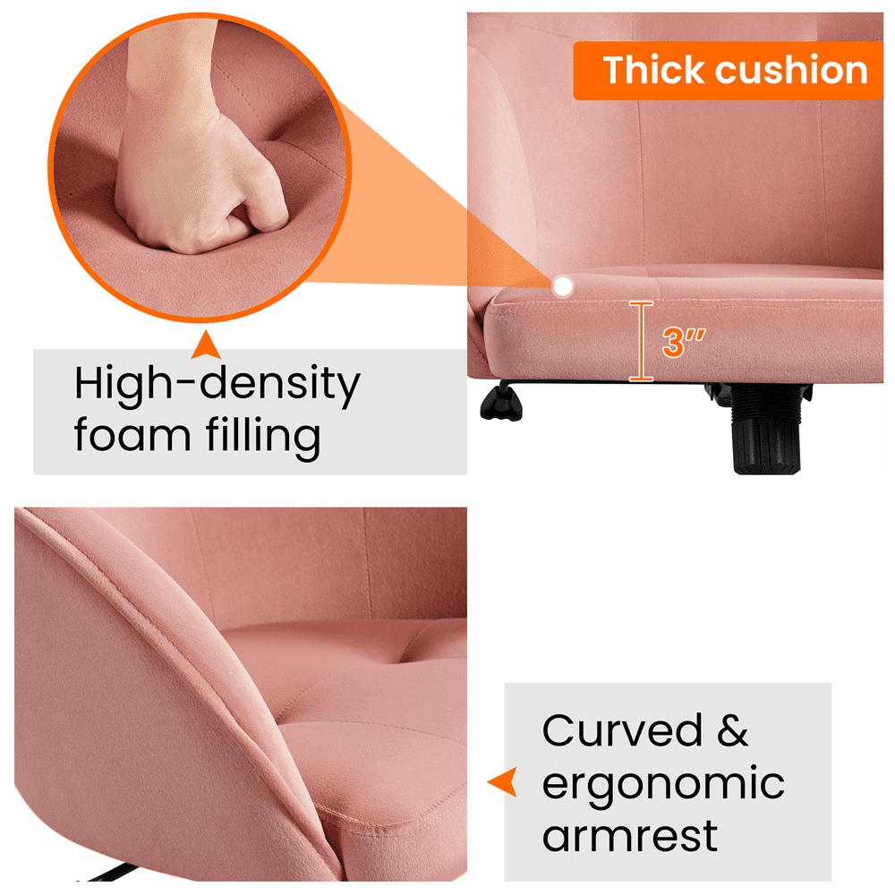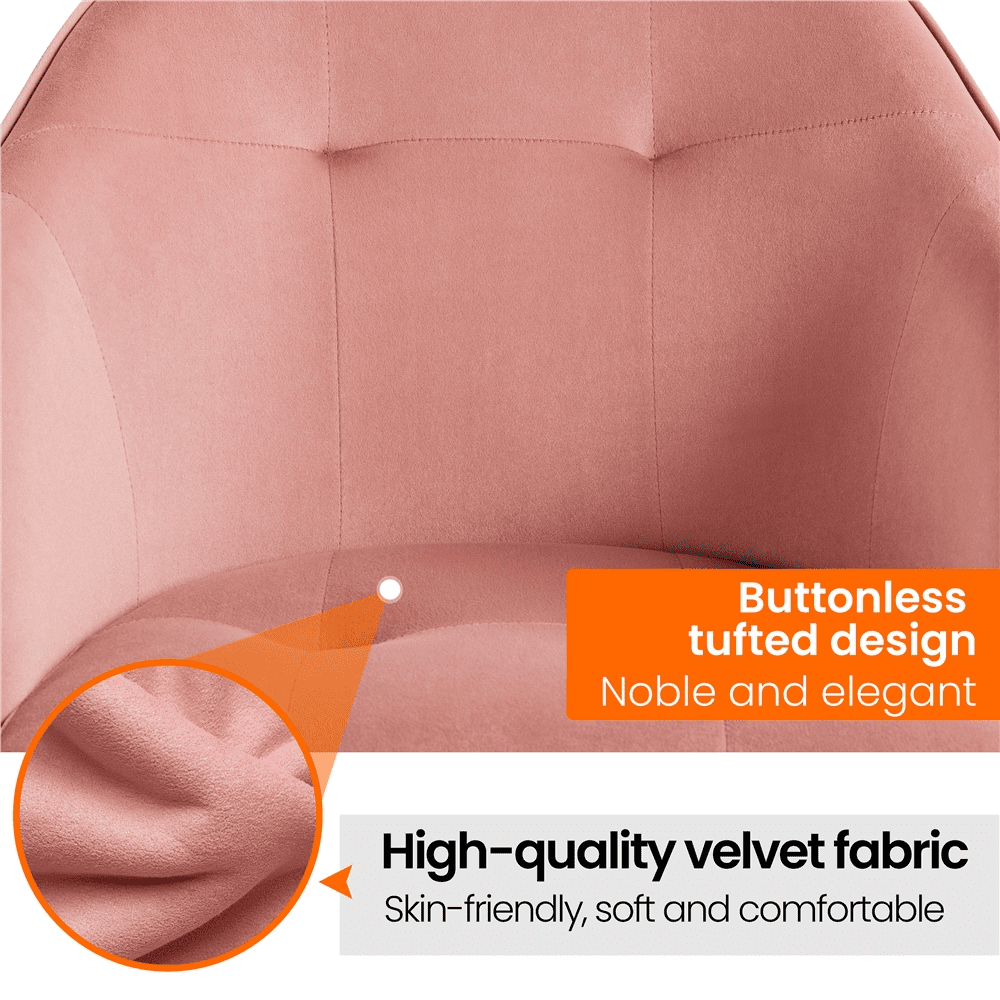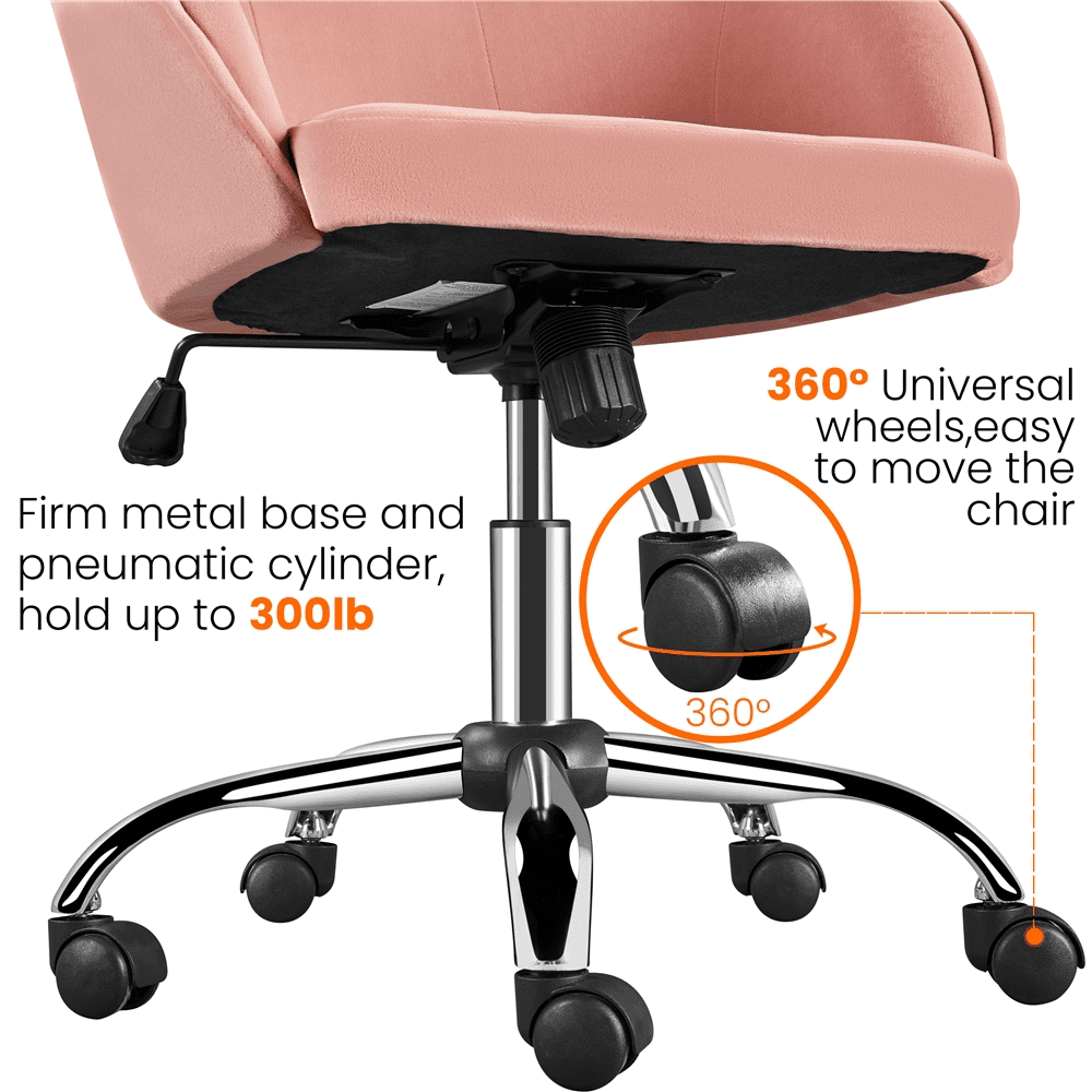This modern, velvet office chair is the perfect addition to your home office. The armrests and seat cushion are soft and comfortable, making this chair somewhere you could site for hours on end. Get comfortable for a long day of work or sit and visit with friends! The 360 degree swivel casters and heavy duty star-shaped base allow you to wheel from task to task seamlessly. If you have a larger desk space this is ideal for optimizing work life. The sleek and elegant design blend in perfectly with any home decor style. Simple assembly is required and detailed instructions are included. Age group: adult