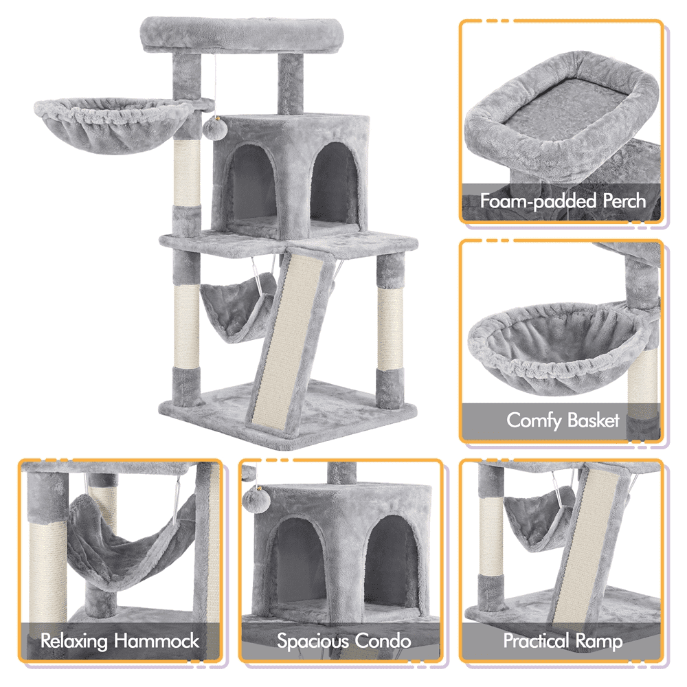 Alden Design Multi-level Small Cat Tree Tower with Condo, Light Gray Professional cat tree: This cat tree has multiple tiers and structures for cats to play and sleep. It is suitable for several kittens or two normally-sized cats. Stable and safe: Considering the cats’ habits and characteristics, we add an anti-toppling strap which is attached to the middle board for better stability, through which you can anchor the cat tree to the wall. Multi-function cat house: Having this quality cat tower, you won’t need to buy any other cat toys. Our cat house has one condo, one soft nest, one plush basket, one scratching board and four scratching posts. Protection of furniture: Cats are active and lively, so the cat tree has a scratching board and four posts to let them sharpen their claws, which are made from sisal ropes, natural and durable. Materials: Particleboard, Plush, Sisal Color: Light Gray Overall Dimensions: 19″ L × 19″ W × 40″ H Baseboard: 19″ L × 19″ W Condo: 12.2″ L × 12.2″ W × 12″ H Top Perch: 14.6″ L × 19.7″ W × 3.5″ H Scratching Board: 18″ L × 6″ W Basket Diameter: 12″ Hammock: 15″ L × 11″ W Maximum Weight Capacity: 55 lb Gross Weight (product in the box):24.1 lb Net Weight (assembled product weight): 22.3 lb Alden Design Multi-level Small Cat Tree Tower with Condo, Light Gray Professional cat tree: This cat tree has multiple tiers and structures for cats to play and sleep. It is suitable for several kittens or two normally-sized cats. Stable and safe: Considering the cats’ habits and characteristics, we add an anti-toppling strap which is attached to the middle board for better stability, through which you can anchor the cat tree to the wall. Multi-function cat house: Having this quality cat tower, you won’t need to buy any other cat toys. Our cat house has one condo, one soft nest, one plush basket, one scratching board and four scratching posts. Protection of furniture: Cats are active and lively, so the cat tree has a scratching board and four posts to let them sharpen their claws, which are made from sisal ropes, natural and durable. Materials: Particle Board, Plush, Sisal, Metal, Plastic Assembled Dimensions: 19″ L × 19″ W × 40″ H Baseboard: 48 cm L × 48 cm W / 19″ L × 19″ W Condo: 12.2″ L × 12.2″ W × 12″ H; Entrance: 7.5″ L × 9.4″ H Top Perch: 19.7″ L × 14.6″ W × 3.3″ H Scratching Board: 18″ L × 6″ W Basket Diameter: 12″ Hammock: 15″ L × 11″ W Maximum Weight Capacity: 55 lb Item Weight: 22.3 lb Shipping Weight: 24.1 lb Assembly Required Resdential Use