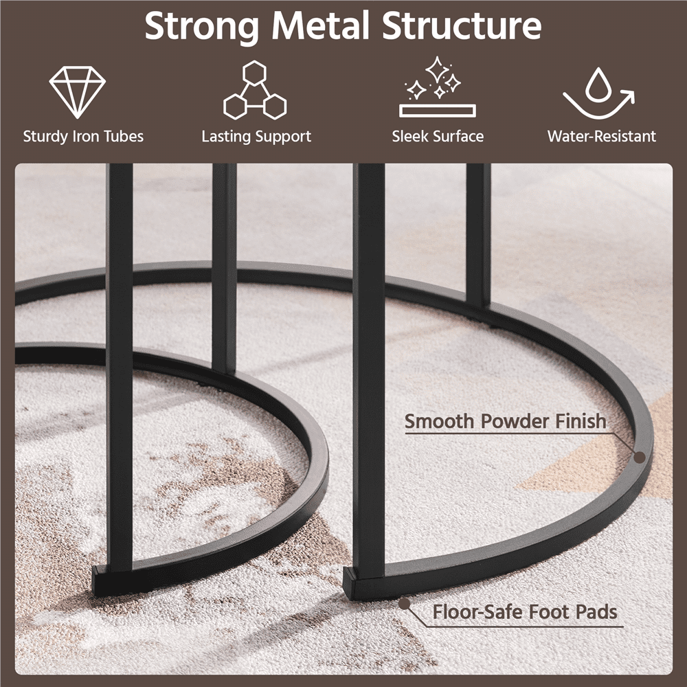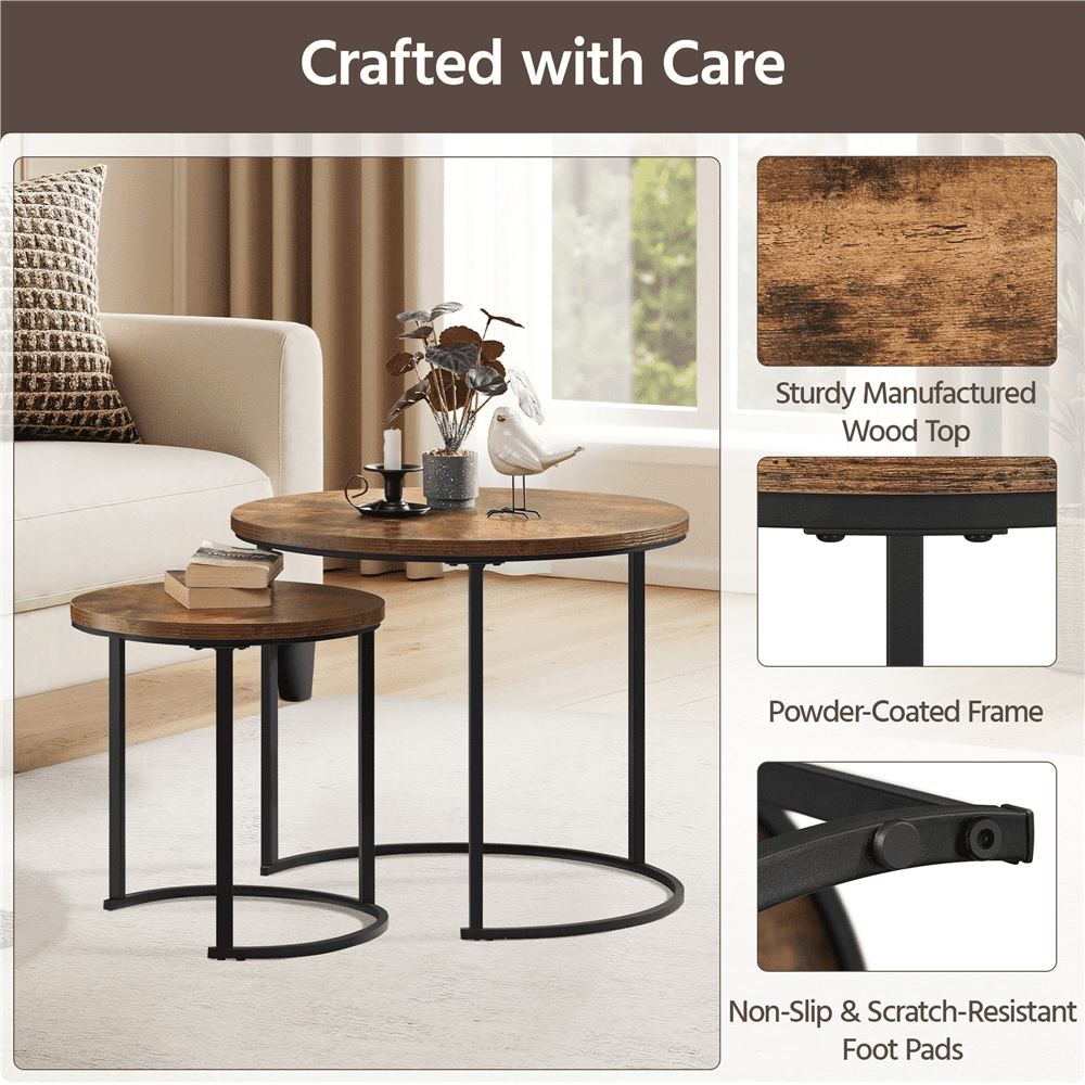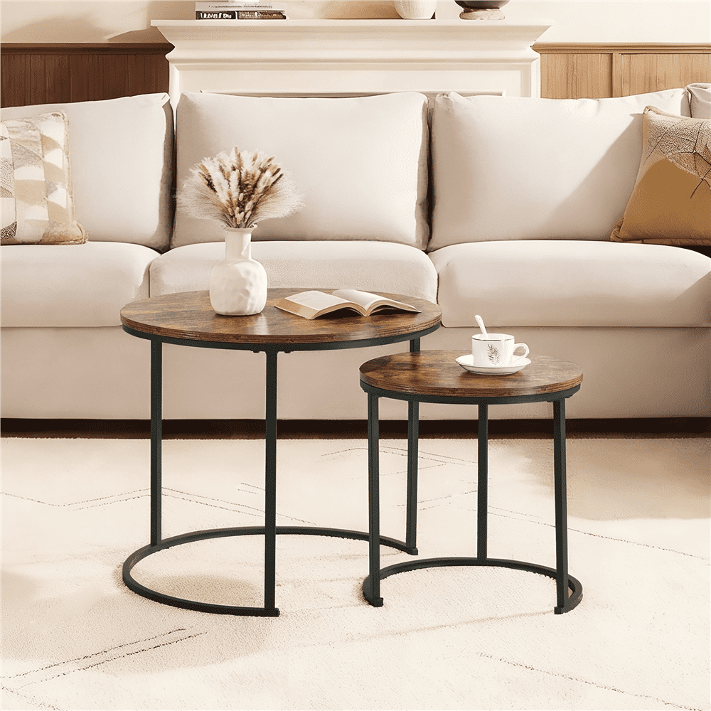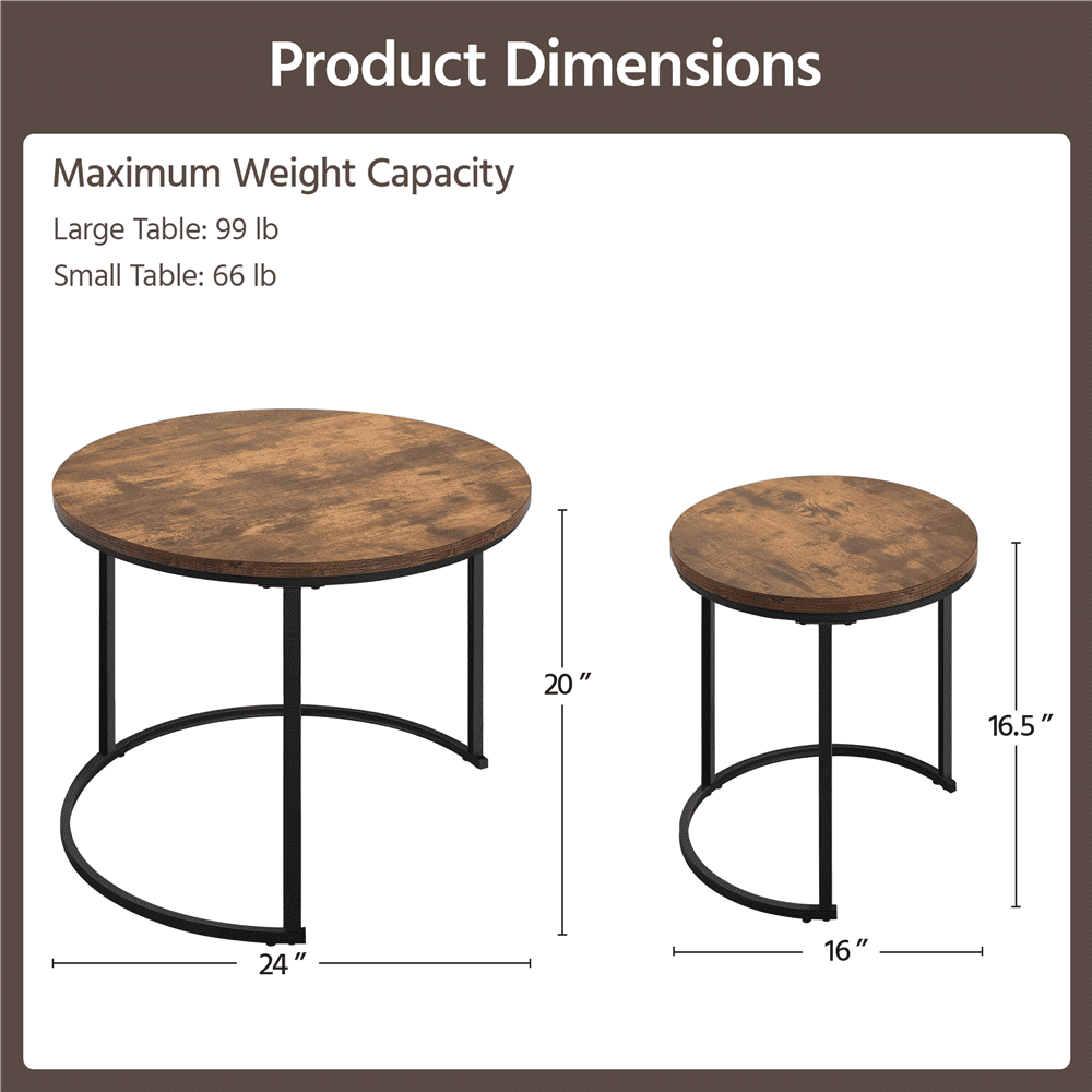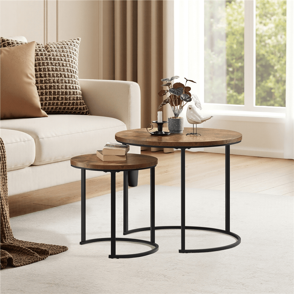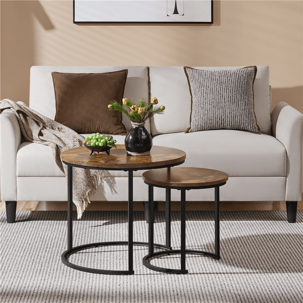 Nesting design: This set of end tables can be nested together to match different sized rooms and gives you a beautiful layered feeling. The smaller table fits neatly under the larger table, so you can save space when the space is limited. Sturdy&Durable: Our nesting coffee table set is built of premium MDF boards and thick iron tubes, which is sturdy enough to meet your various needs, such as eating breakfast, working and socializing. With the waterproof and scratch-resistant covering, so you can simply wipe it clean with a dry cloth as needed. Modern & Minimalist: Thanks to an elegant circular frame, this nesting table set is the ideal modern accessory for your living space. With rustic brown/gray finish and wood-like grain, this set adds a chic, minimalist vibe to your home. Quick assembly: It is super easy to put this nesting table set together. All necessaries and instructions are accompanied in the package and the tables have been well-packaged for better protection.
