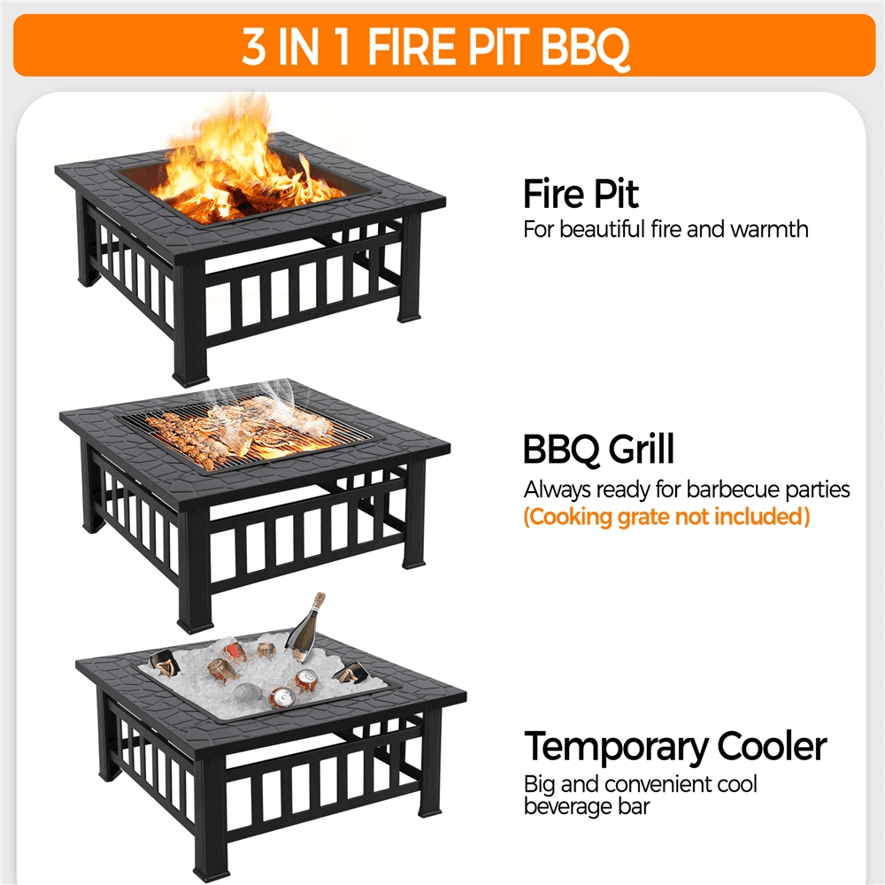 Alden Design Outdoor 32″ Square Metal fire pit table with Spark Screen, Poker, and Cover, Black: Material: Mesh & Iron Overall Dimension (with Lid): 32 x 32 x 19.7″(LxWxH) Overall Dimension (without Lid): 32 x 32 x 14.4″(LxWxH) Lid Size: 20.5 x 20.5 x 4.1″(LxWxH) Pot Size: 22.6 x 22.6 x 4.5″(LxWxD) Cover Size: 32.7 x 32.7 x 17.7″(LxWxH) G.W.: 28.4 lb Please note: The BBQ shelf in the pictures is not included. Color: Black Please Note: The grill grate is not included. Please use this fire pit in outdoors. It is a normal phenomenon that the paint of the fire pit peels off after the fire pit is used several times. Suitable for burning logs or charcoal. There are 6 holes for ventilation at the bottom of the pot, please use outdoors when cooling drink and food. Package includes: 1 x Metal Fire Pit, 1 x Mesh Screen Lid, 1 x Poker, 1 x Fire Pit Cover, and 1 x Instruction This outdoor fire pit is ideal for cold nights for providing cozy warmth, light and a beautiful, comfortable atmosphere. This premium fire pit is built in square shape for stability. The wide edge around the fire bowl provides ample space for holding plates, sauces, brushes and other barbecue supplies, allowing convenient access during cooking. This garden square stove comes with a mesh lid to prevent burning embers from blowing out and a poker for stoking fire and remove the mesh lid. Please feel free Safety Tips: Please use this fire pit on non-combustible surfaces such as cement ground, rocks, or sand for your safety. Please don’t use it on lawns, wooden decks, or in any enclosed room