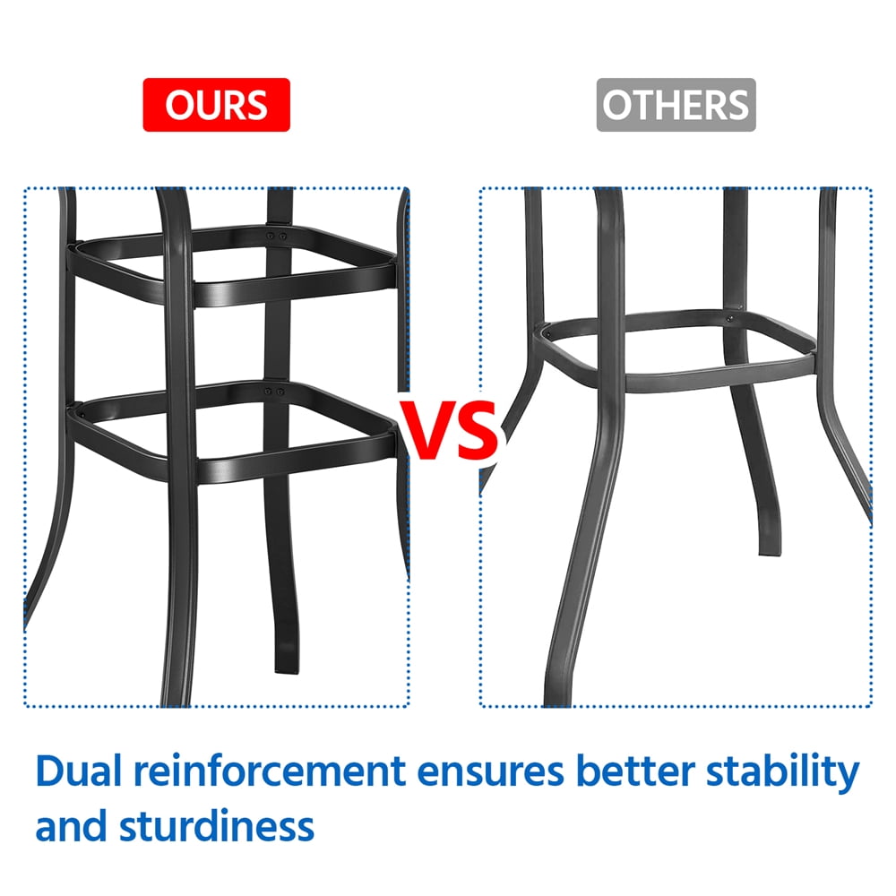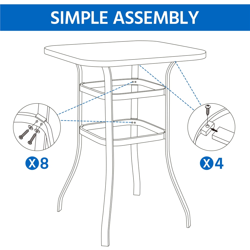 This bar height patio table with tempered glass tabletop is perfect for both outdoor or indoor usage. Simple and classic design makes it versatile for most decoration style or outdoor places. Tempered glass tabletop is extremely hard and does not break easily with a smooth and scratches resistant surface. It would match with several textilene chairs perfectly for patio places. Rounded edges are thoughtfully designed to cause no harm for users. Slanted legs provide better stability to carry food and other stuffs. Sturdy iron frame serves great durability and stability, ensuring a safe sitting.