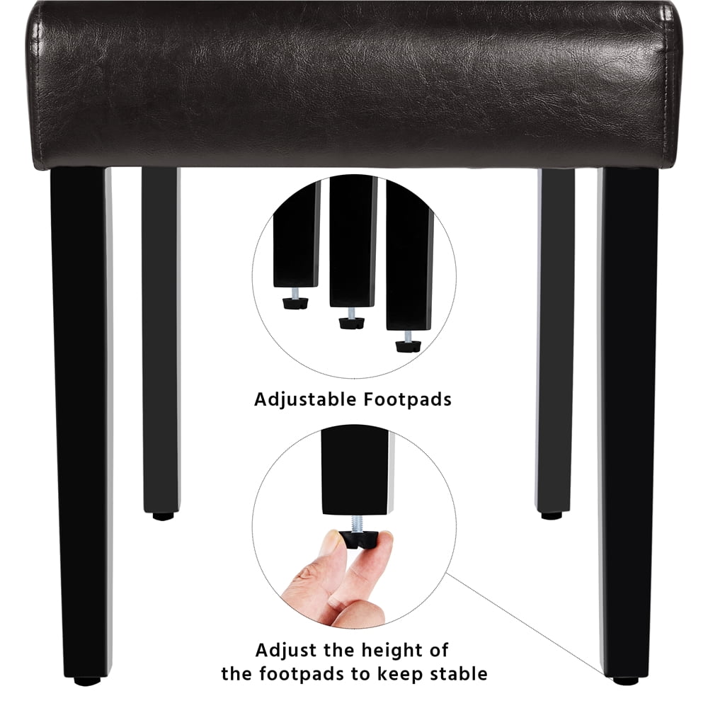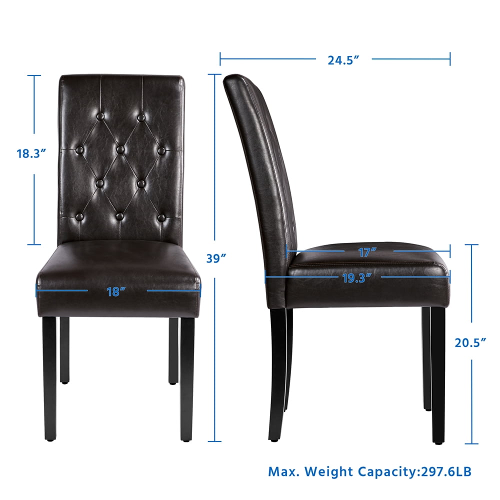 High Weight Capacity: Featuring a sturdy wooden frame and supportive rubberwood legs, each dining chair can easily bear 298 lb. For safety, please do not overload or tilt back the chairs Armless Design: These armless chairs offer convenience by easily storing under the table when not in use, conserving valuable floor space Adjustable Foot Pads: The front legs of these kitchen chairs are equipped with adjustable foot pads to protect your floor from scratches. Additionally, the foot pads ensure these kitchen chairs stay stable on uneven ground Comfortable Sitting Experience: The dining chairs provide a comfortable sitting experience with cushions and backrests covered in soft faux leather and filled with high-density foam. The 18″ high backrest ensures full lumbar support for enhanced comfort Low Maintenance: The water-resistant faux leather upholstery can be easily wiped clean with a damp rag and a few drops of cleaner, removing accidental spills easily Specifications: Quantity: 2; Color: Brown; Materials: PVC Leather, Foam, Rubberwood, Sinuous Spring, Non-woven Fabrics; Assembled Dimensions: 17.5″ W × 23.5″ D × 38.5″ H; Seat Width: 17.5″; Seat Depth: 17.5″; Seat Height: 20.3″; Maximum Weight Capacity (per dining chair): 298 lb