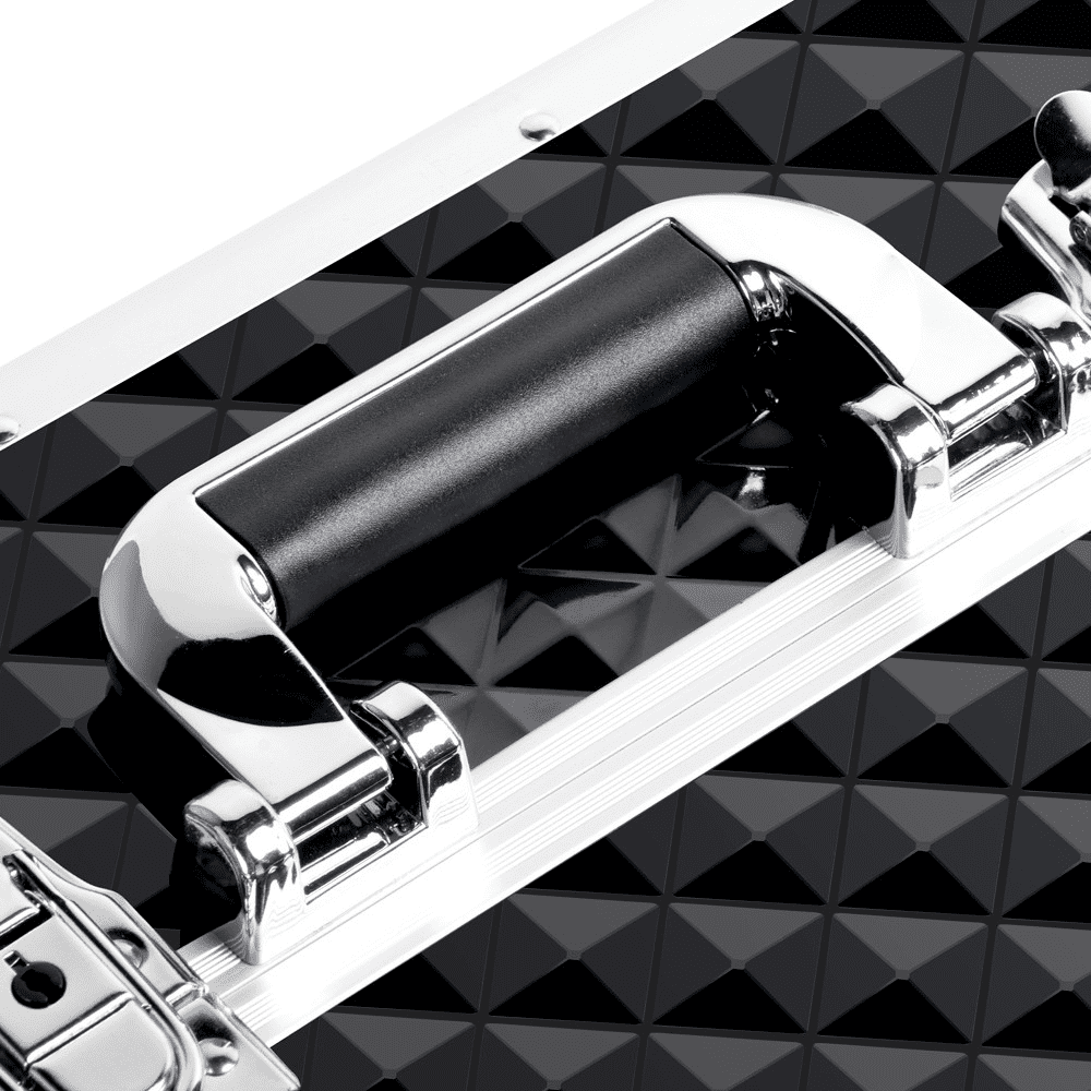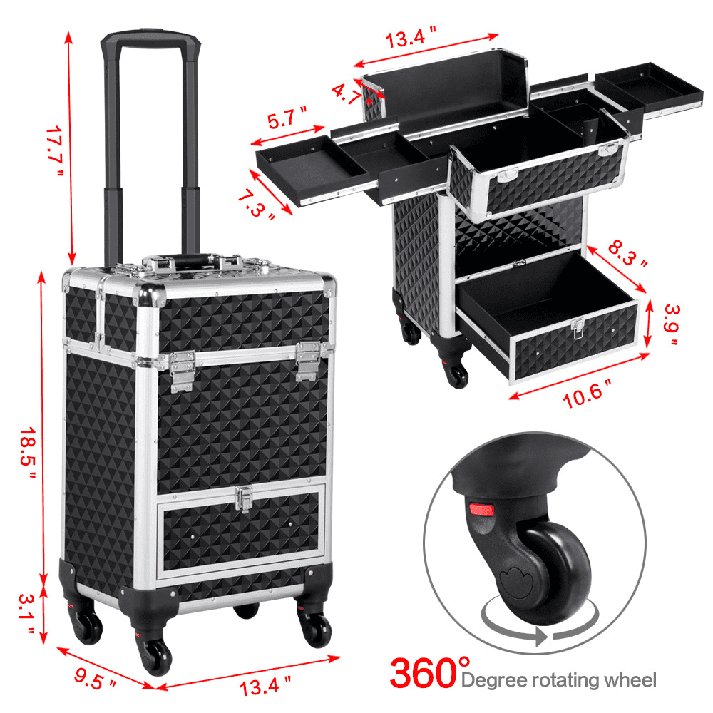 Material: ABS plastic, aluminum, MDF, metal, polyester Case dimension (wheel height included): 13.5″ L x 9.5″ W x 21.9″ H Pull handle maximum height: 39.4″ Retractable tray size: 8″ L x 5.7″ W x 1.4″ H Upper compartment inner size: 12.7″ L x 9″ W x 8.7″ D Bottom drawer inner size: 10.6″ L x 8.3″ W x 3.9″ D Max. weight capacity: 22 lb G.W.: 16.7 lb N.W.: 13.9 lb