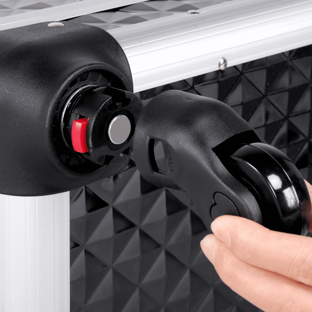 This sleek makeup train case is constructed of top-grade materials ensuring long-term durability. With a contemporary minimalist style combined with a small embossed argyle pattern, this makeup case is not only a practical tool but also a fashionable accessory. This makeup case sits on four high-quality wheels for quiet and effortless rolling. Detachable wheels can be easily removed or replaced if needed. Retractable trays allow for storing and organizing items like polish, lipstick, essential oil, hairpins, and more. This amazing makeup case is a must-have piece for professional beauticians.