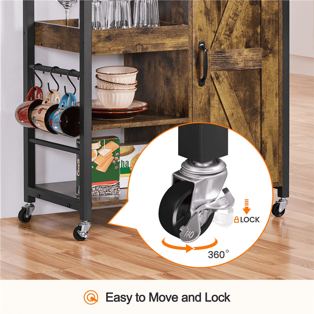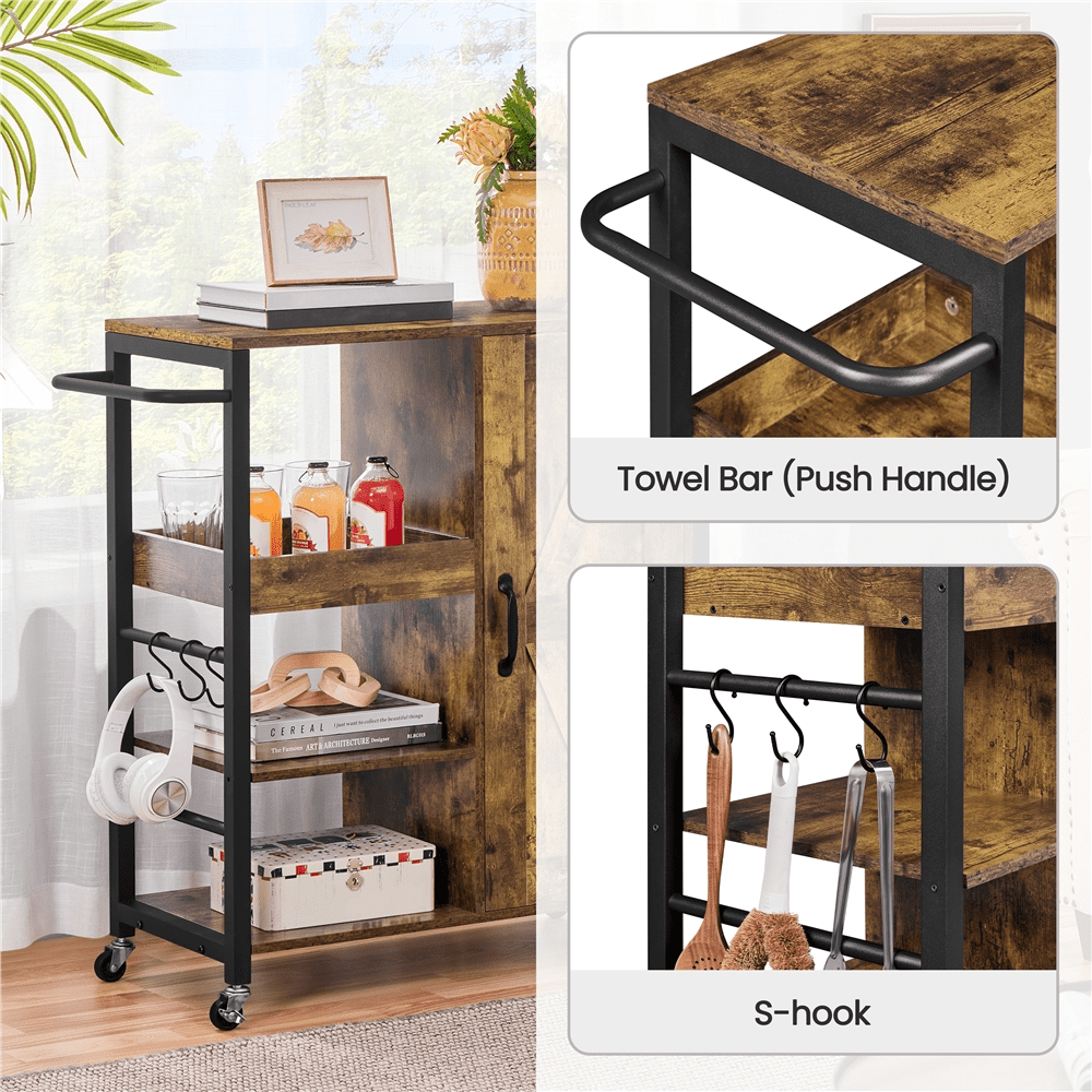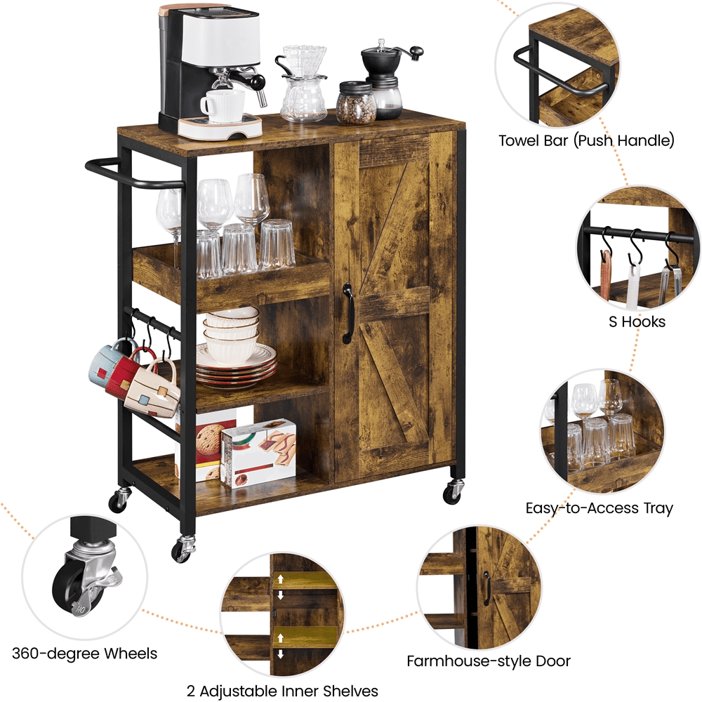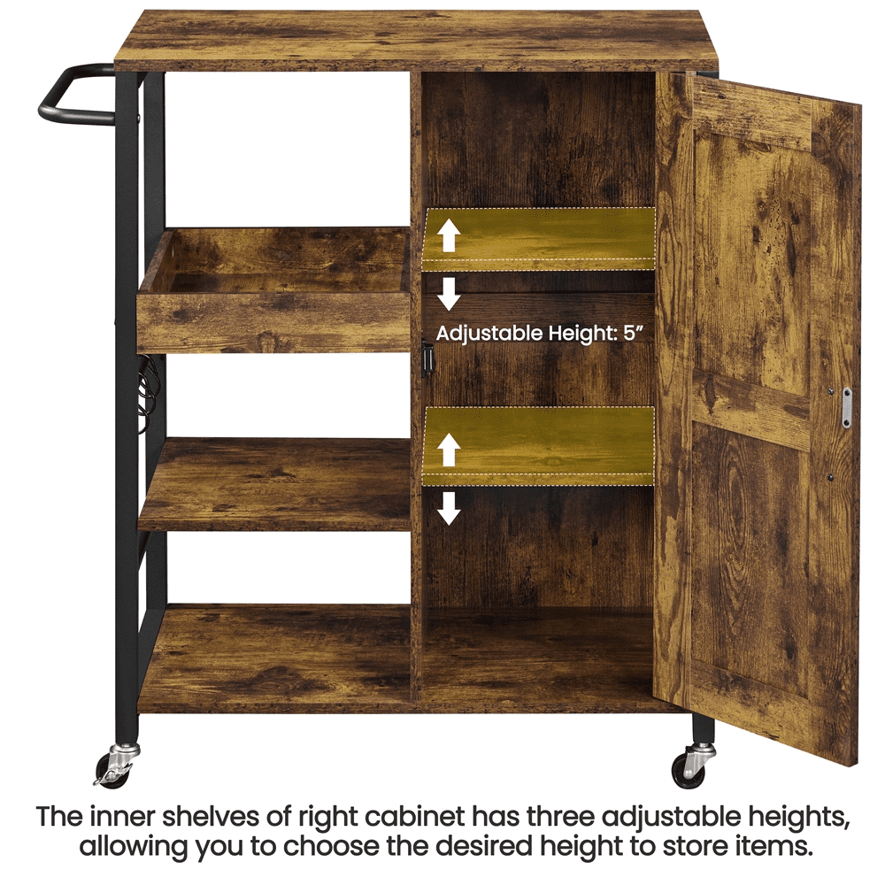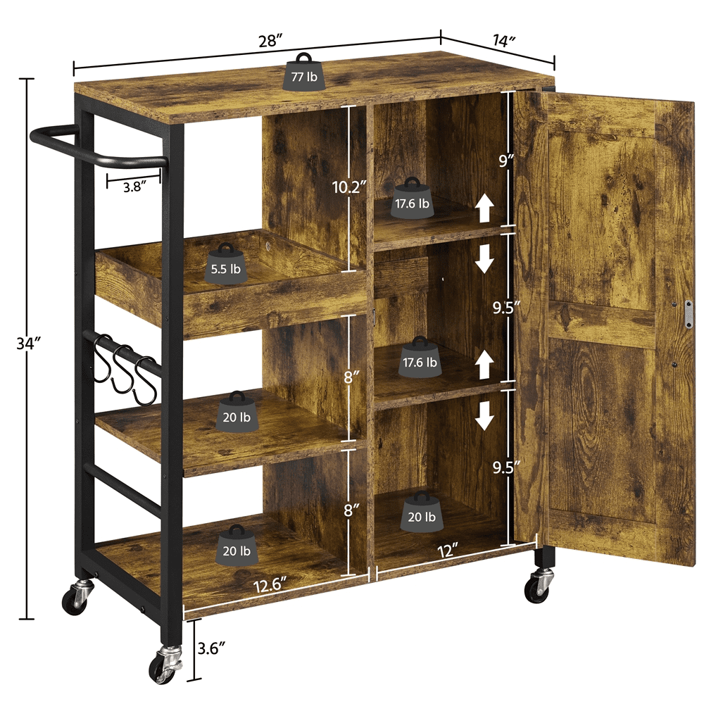 SmileMart Rolling Kitchen Storage Trolley with Open Shelves, Rustic Brown Crafted with CARB P2-compliant MDF and has a powder-coated metal frame The small tray and two open shelves are ideal for organizing frequently used items With a barn door is a great place to store cereals and spice jars without dampness The towel bar can double as a push handle for easy movement Color: Rustic Brown Material: MDF, Powder-coated Iron Assembled Dimensions (without Push Handle): 28″ L × 14″ W × 34″ H Countertop: 28″ L × 14″ W Small Tray: 11.5″ L × 12.7″ W × 2.2″ H Two Open Shelves (ea.): 13.7″ L × 12.5″ W Two Adjustable Cabinet Shelves (ea.): 12″ L × 11.4″ W Shelf Adjustable Height: 5″ Max. Load Capacity: countertop: 77 lb; tray: 5.5 lb; open shelves (ea.): 20 lb; adjustable cabinet shelves (ea.): 17.6 lb Shipping Weight: 48 lb Item Weight: 43 lb Note: 1. Please allow ± 0.5” errors due to manual measurements. 2. For your safety, please do not sit/stand on the countertop.