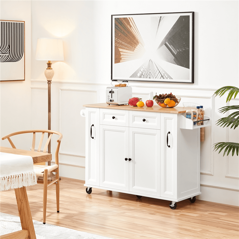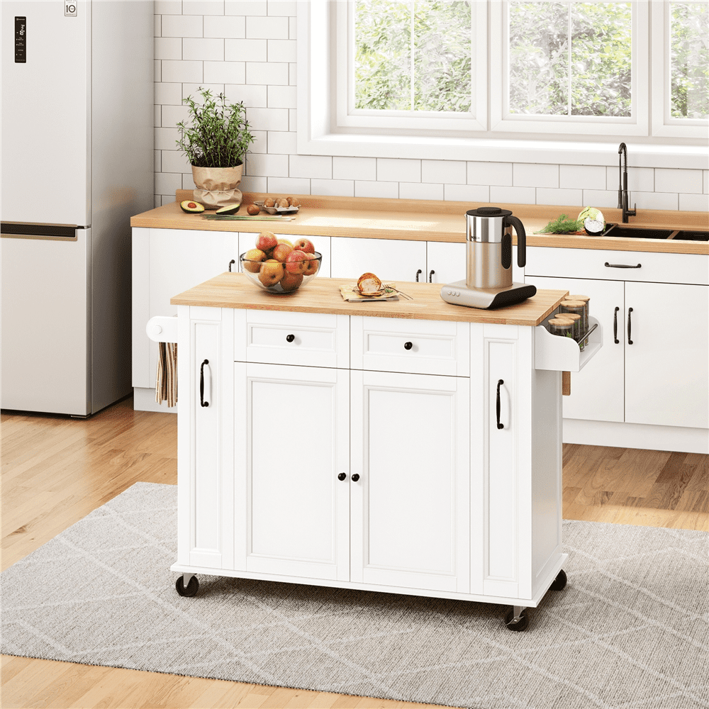 Alden Design Rolling Storage Kitchen Cart with Drop-Leaf Breakfast Bar & 2 Drawers, White