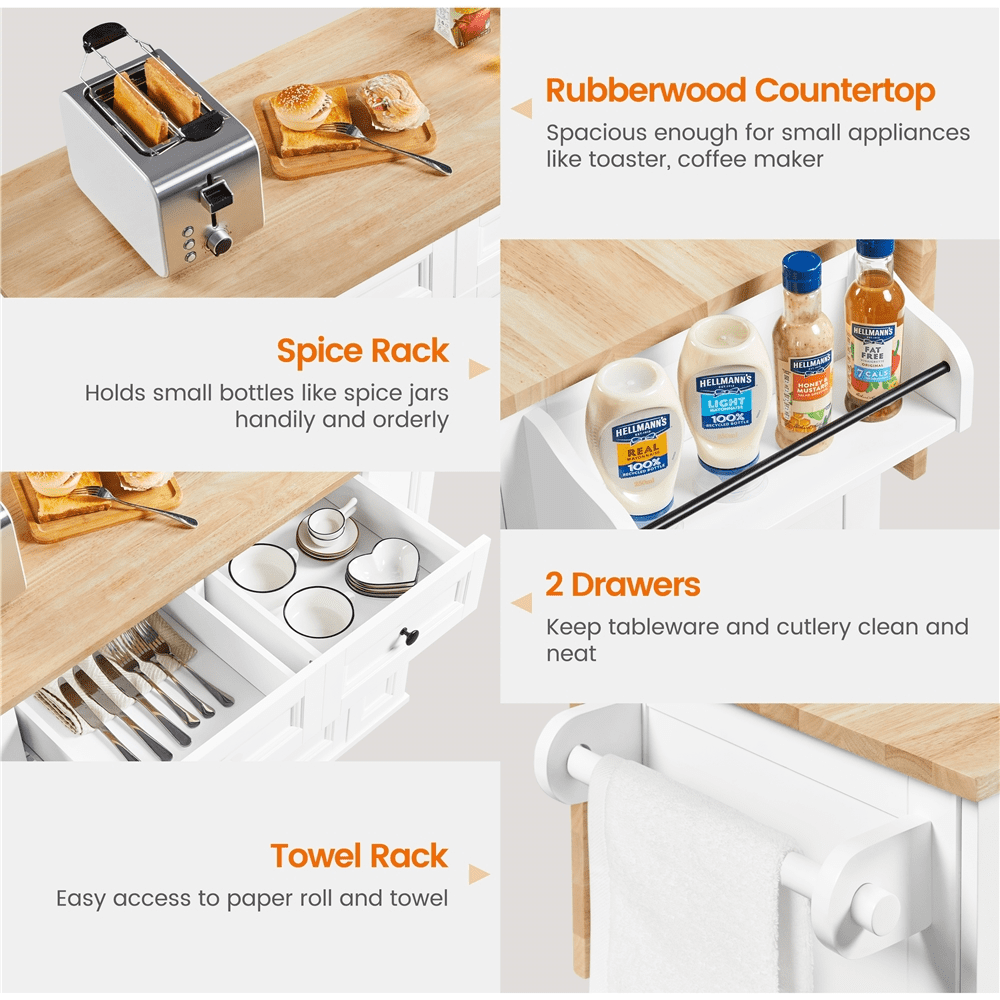 Alden Design Rolling Kitchen Cart with Storage Cabinet & 2 Drawers, White Color: White Materials: MDF, Particle Board, Rubberwood Assembled Dimensions: 52″ L × 19″ W × 36″ H Countertop Size (w/ the drop-leaf board): 44.5″ L × 30″ W Drop-leaf Board Size: 44.5″ L × 12″ W Upper Drawer Inner Size (ea.): 13″ L × 12″ D × 3.4″ H Spice Rack Inner Size: 12.8″ L × 5.2″ W × 4″ D Cabinet Shelf Size (ea.): 28.3″ L × 15″ D Adjustable Shelf Height (from the cabinet shelf to the bottom shelf): 9.4″, 12″, 14.5″ Max. Load Capacity: Tabletop (w/ the drop-leaf board): 80 kg / 176 lb; Drop-leaf board: 22 lb; Cabinet shelf (ea.): 40 lb; Upper drawer (ea.): 13 lb; Side drawer (ea.): 6.6 lb; Spice rack: 5.5 lb Shipping Weight: box #1: 68.3 lb, box #2: 71.7 lb Item Weight: total: 128 lb Note: 1. Please allow ± 0.5″ measurement tolerance. 2. Please do not sit/stand on the countertop for your safety.