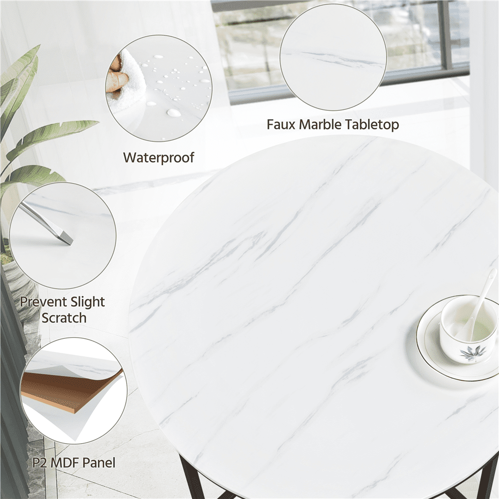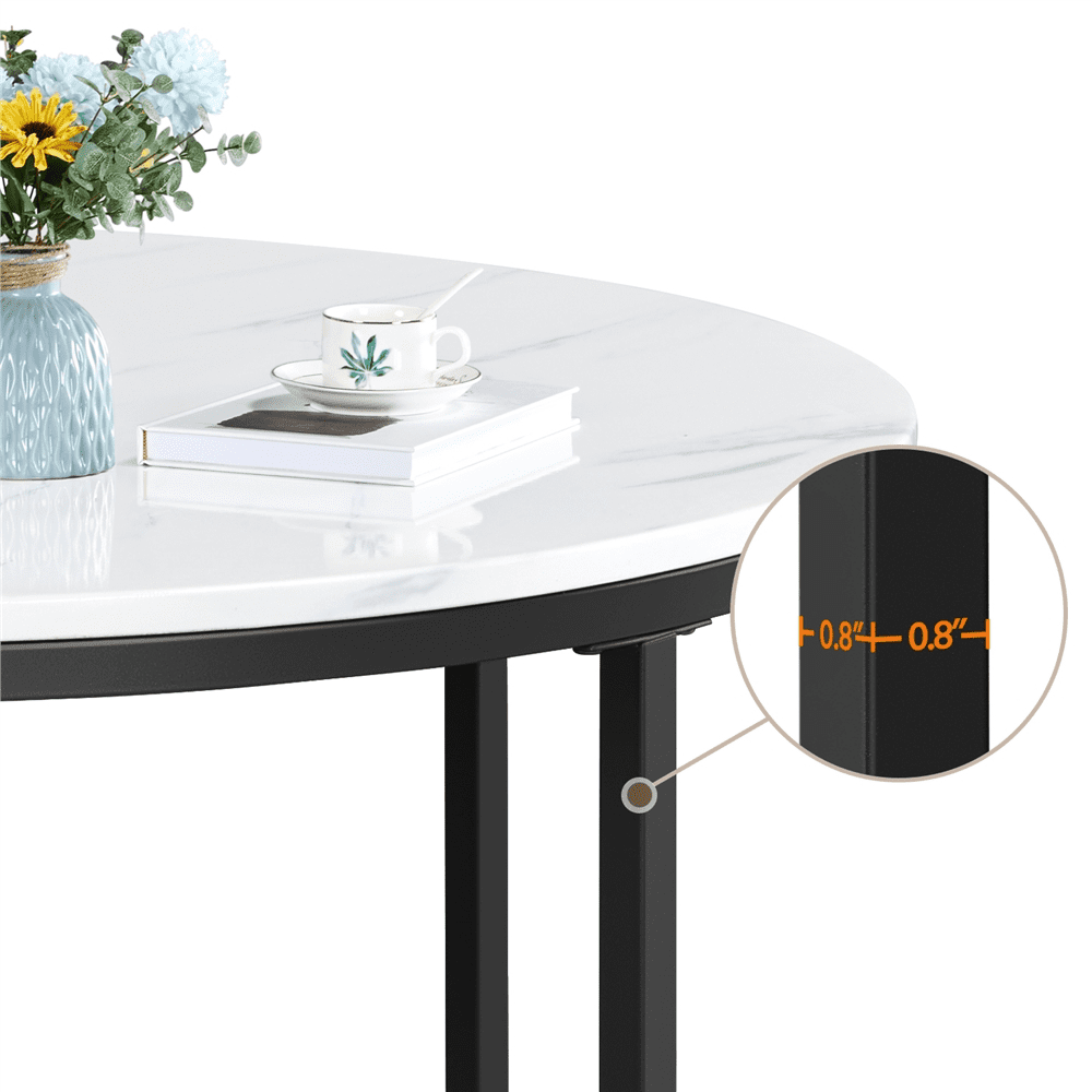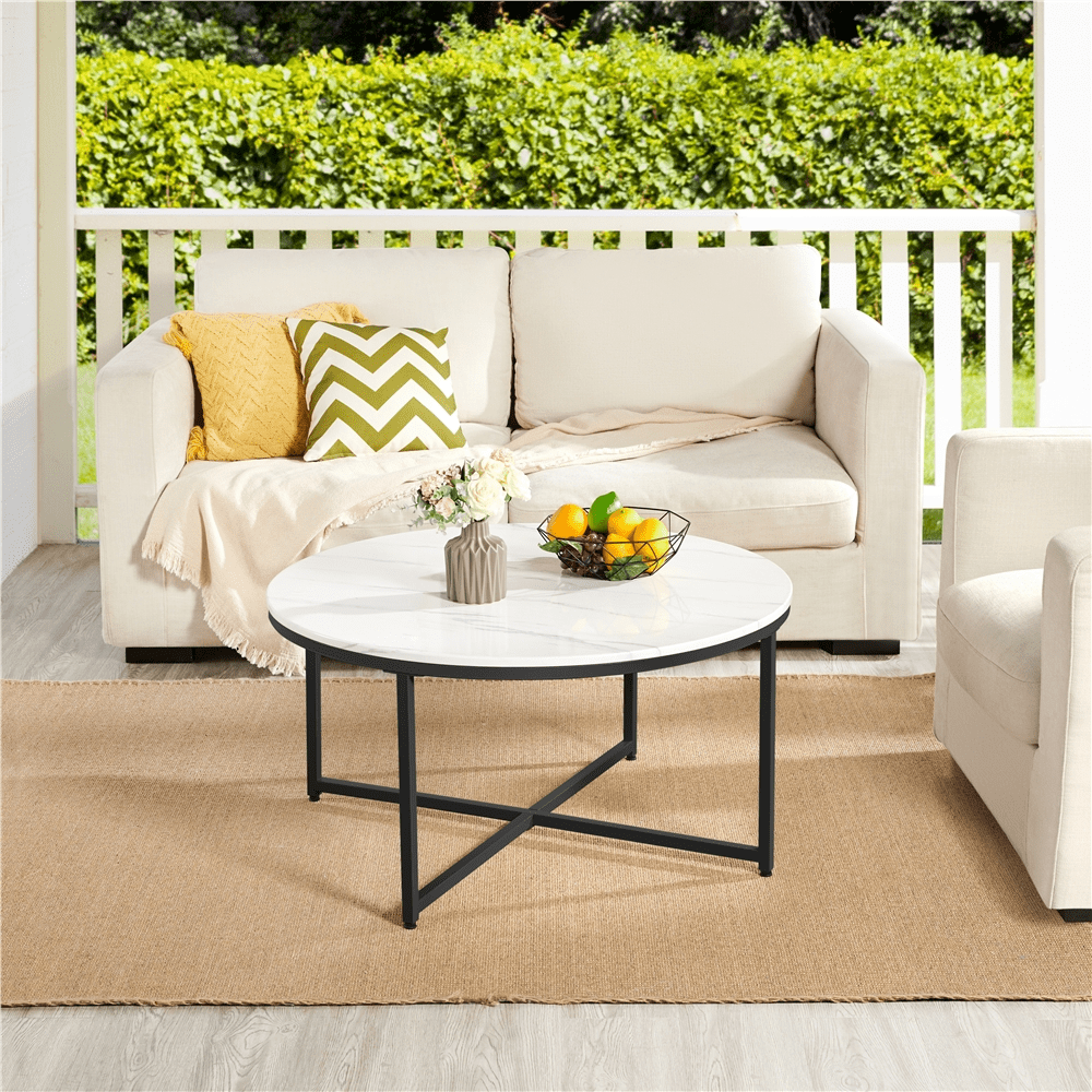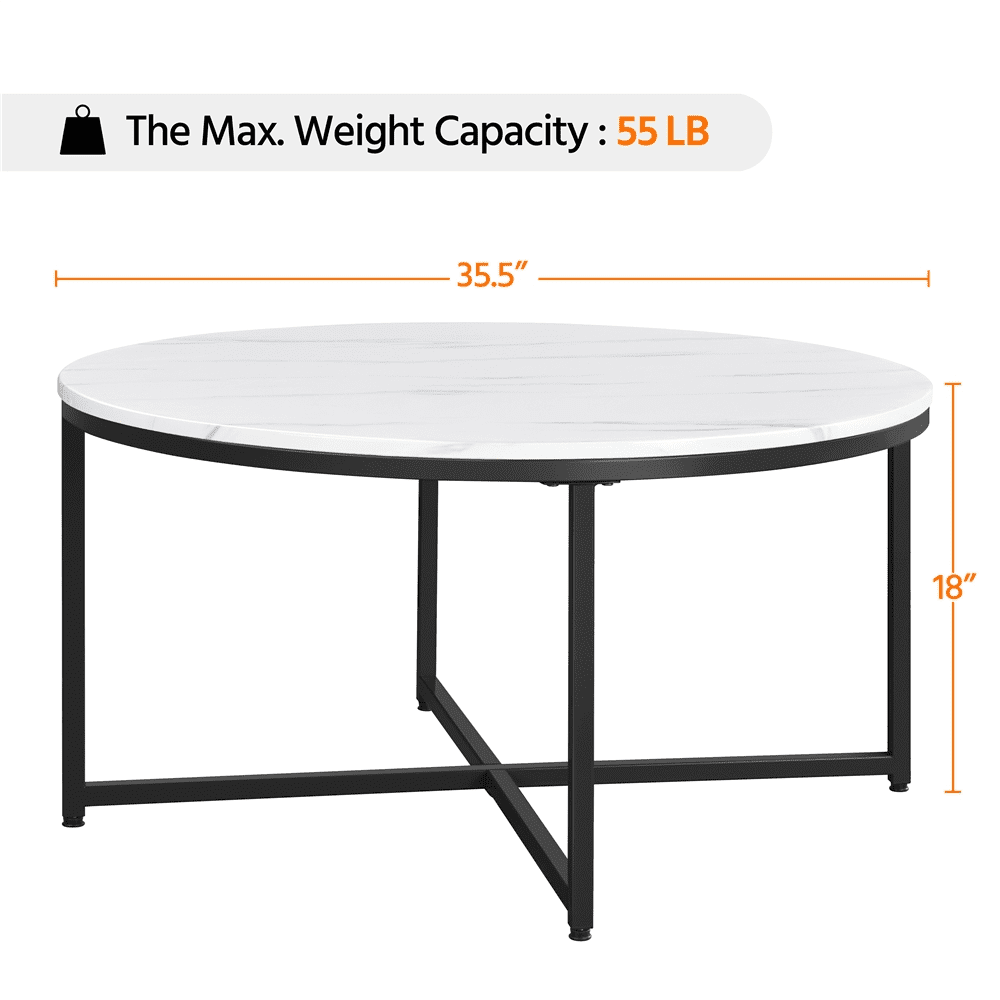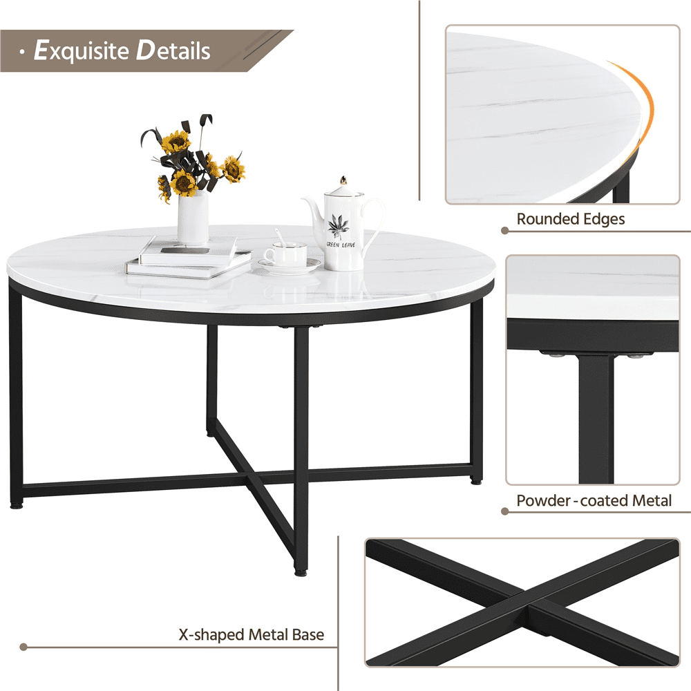 Simple, elegant and practical, this round faux marble coffee table brings elegance and polish to your living space, which is easy to blend with any style of homes. It is made of a premium metal frame and high-quality MDF boards, sturdy and durable for long-term use. The 35.5-inch diameter tabletop area is spacious enough for working, reading and chatting with friends. The marble-like top makes a beautiful contrast with cross base legs in a black finish, which is perfect for the living room, office, apartment, hotel and small space.