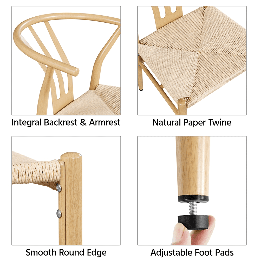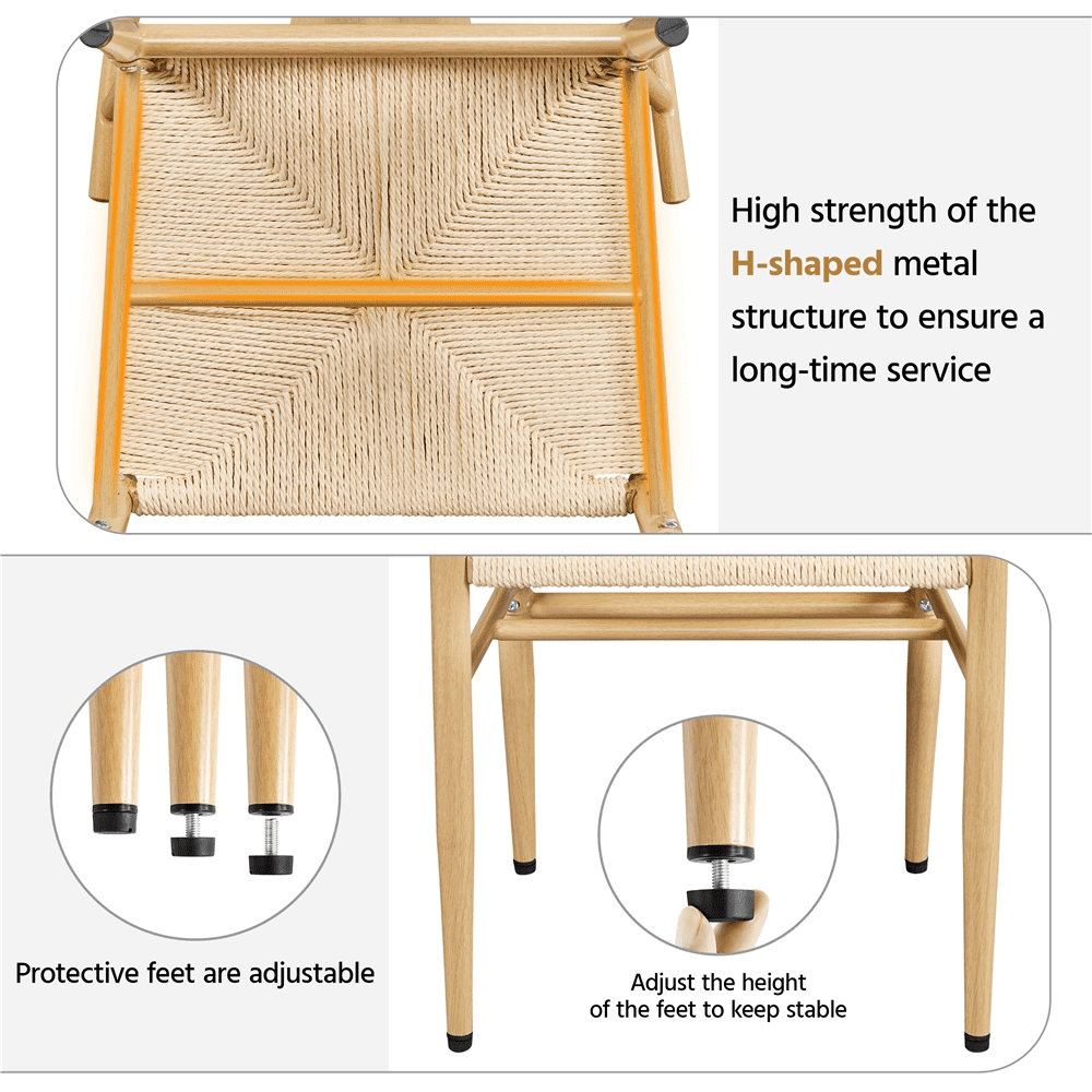 Alden Design Set of 4 Mid-Century Weave Dining Chairs with Solid Metal Frame, Wood Material: Iron and paper twine Color: Wood (as pictures show) Qty: 4PCS Overall size: 22 x 22 x 29 inch (L x W x H); Seat Size: 16 x 16 inch (L x W x H); Seat Height: 17 inch; Max. weight capacity: 331lb; G.W.: 68.8lb Note: 1. Please allow ±1cm/0.4inch error due to manual measurement. 2. Please do not use the products outdoors. Do not expose the chairs to moisture and sunlight directly. Mid-century Modern Style Adjustable Foot Pads