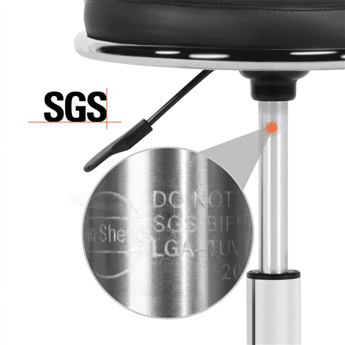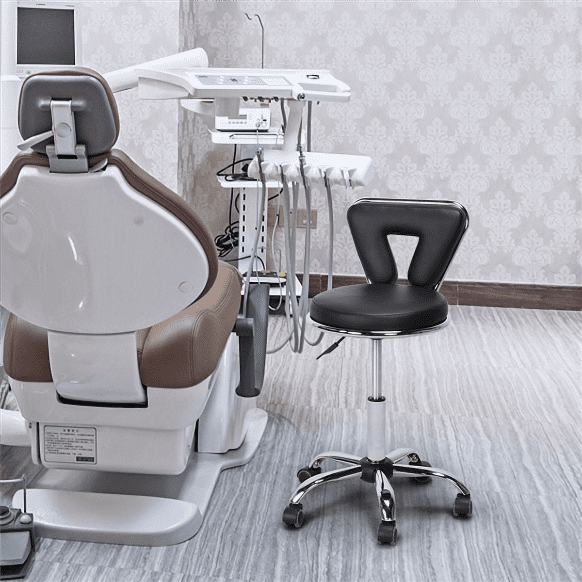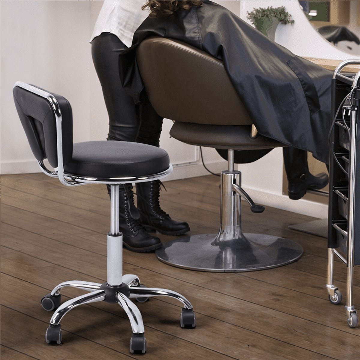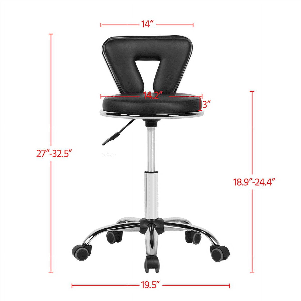 Features: 360° SWIVEL: Five heavy-duty 360° swivel casters for smooth, easy and quiet rolling around your workspace and prevent your floor from scratches; rotatable seat is convenient to fetch things and for multi-tasking ADJUSTABLE HEIGHT: The seat height can be adjusted from 19.7″ to 25.2″ by lifting up the lever below the seat. The freely adjusted stool can meet your various needs. STURDY & DURABLE: Chrome plated metal base has great performance in rust and corrosion resistance. And the 19″ base circumference guarantees the stability and safety of this salon stool. COMFORTABLE & RELAXING: Soft padded circular seat and backrest are made of high elastic foam and covered with high-quality PU leather, ensuring both comfort and durability. MULTIFUNCTIONAL: This low stool is perfect for commercial use in beauty salons, SPA, or clinics for a manicure, pedicure, facial massage, tattoo, etc. It also works great in the house and office. EASY TO APPLY: Simple and quick assembly is required. All parts, hardware, and tool are provided and well protected in several layers of wrapping materials. PU leather cover can be easily wiped clean with mild detergent and water. EYE-CATCHING APPEARANCE: The inverted triangle backrest, round seat and glossy frame make this stool a nice-looking addition to your room. Specifications: Material: PU Leather + Foam + Chromed Steel Frame Overall Dimension: 19″ x 19″ x (27.8 – 33.3)” (L x W x H) Backrest Size: 14″ x 9.3″ x 3.5″ (W x H x Foam Thickness) Seat Size: 14.2″ x 3″ (Dia. x Foam Thickness) Max. Load Capacity: 265 lbs. G.W.: 16.1 lbs. N.W.: 13.9 lbs. Packing List: 1 x Salon Stool 1 x Instruction