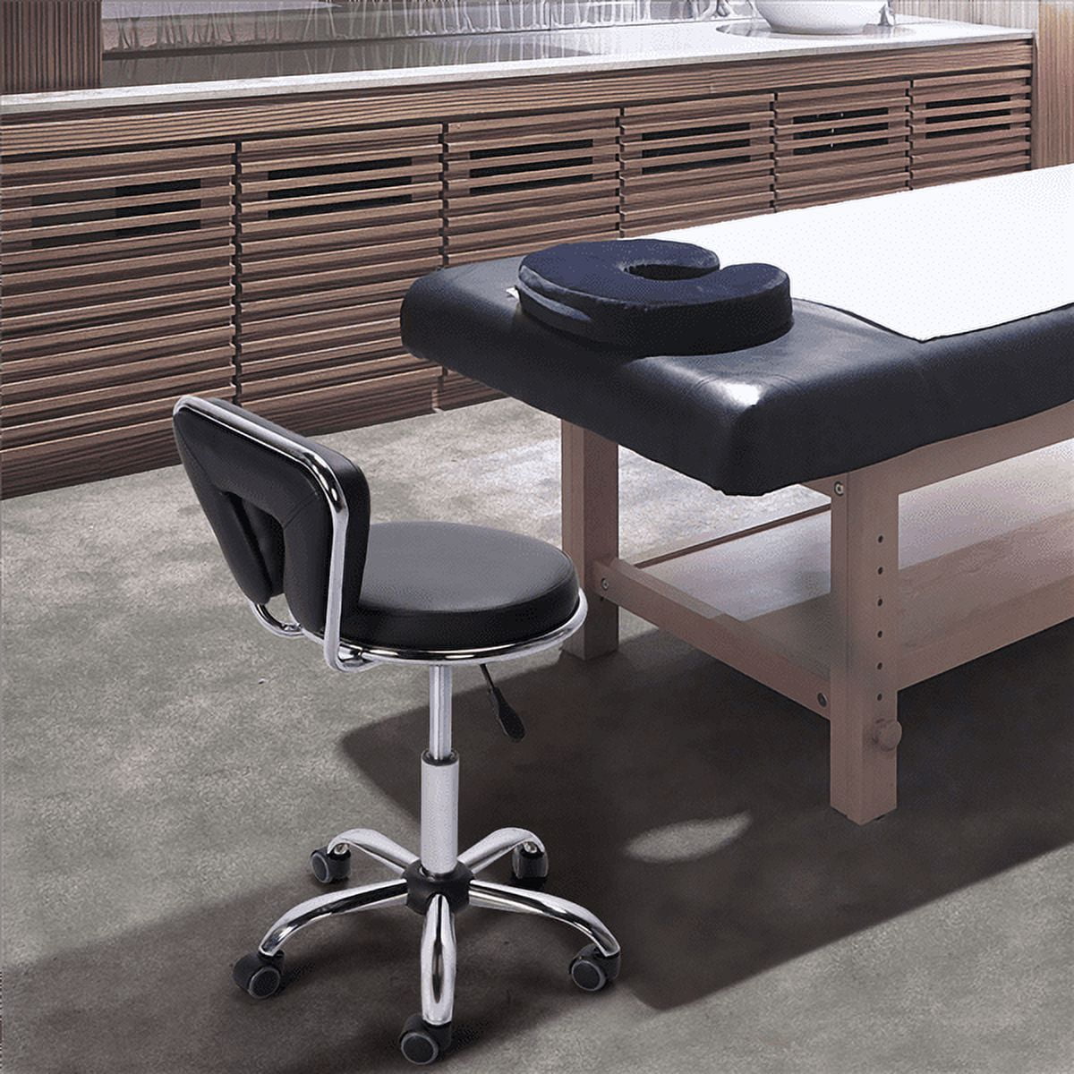 This sleek salon stool with wheels and a backrest can be a good choice. Our high-quality salon stool is made of chromed metal frame and thick foam seat covered with PU leather. Five smooth-rolling wheels can be rolled in any direction you want. The seat height can be adjusted from 50 cm / 19.7″ to 64 cm / 25.2″ according to your needs.
