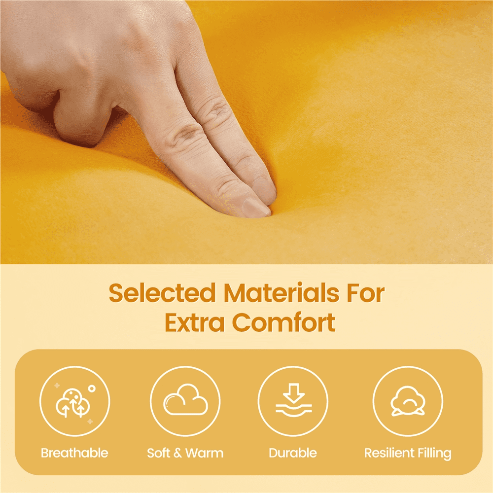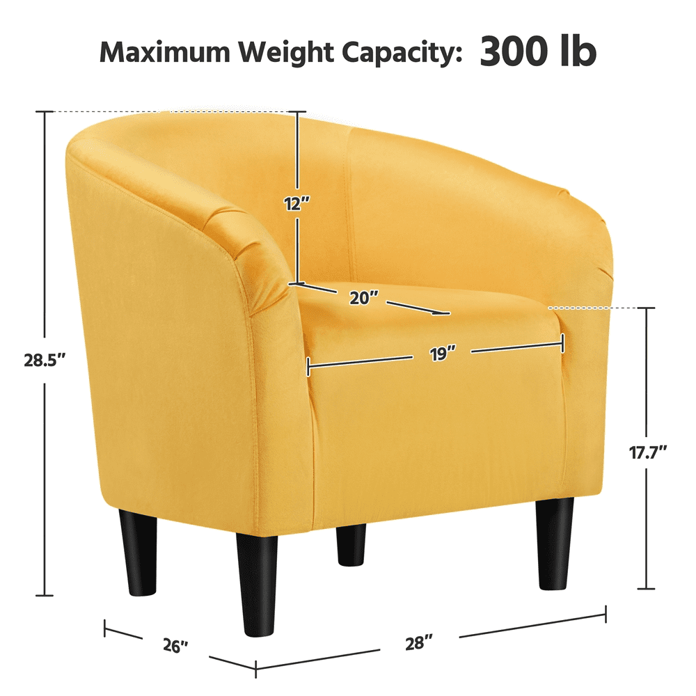 Alden Design Upholstered Barrel Accent Chair for Livingroom, Yellow Velvet Sturdy Construction: Elevated on 4 sturdy plastic legs, this cute accent chair is crafted from a blend of solid and manufactured wood, boasting a high weight capacity of 300 lb. Luxurious Velvet Upholstery: This accent club chair is dressed in lush and smooth velvet upholstery and accented with a curvaceous silhouette for a warm, welcoming look. Thoughtful Details: The curved armrests flawlessly align with your arms and the finish is well-sewn for softer touches. Four protective pads on the feet of the accent chair can keep your floor away from scratches. Easy Assembly: It takes you no more than 5 minutes to assemble this club chair. All you need to do is fix the four tapered legs and the chair is ready to go. Specifications: Color: Yellow; Material: Solid & Engineered Wood, Polyester Velvet Fabric, Foam, Plastic; Assembled Dimensions: 27″ W x 25″ D x 28.5″ H; Seat Depth: 20″; Seat Width: 18.7″; Seat Height: 18″; Ground Clearance: 6″; Maximum Weight Capacity: 300lb; Item Weight: 25.1 lb; Shipping Weight: 31.3 lb.