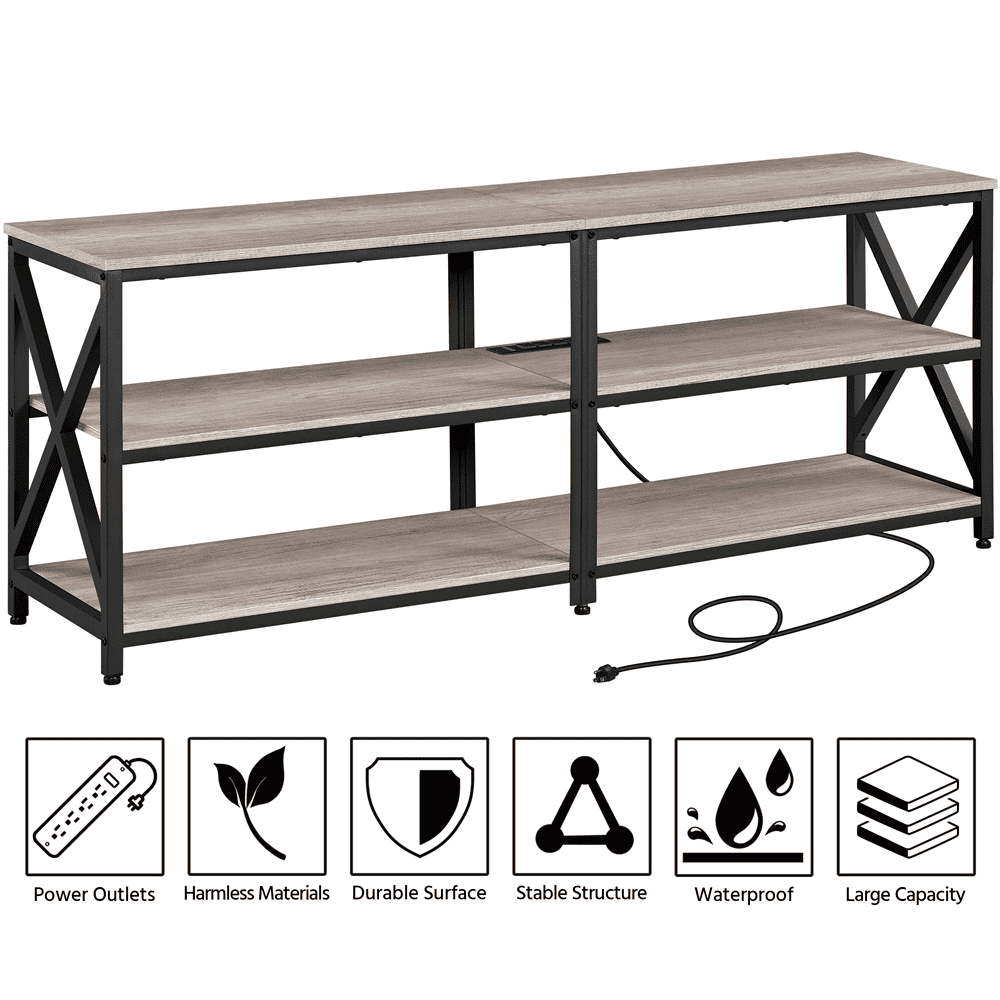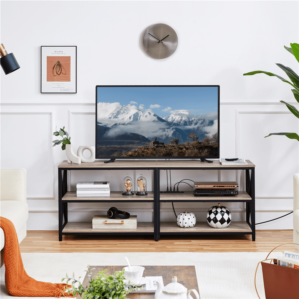 Selected Materials for Long Accompany: Dedicating to time-winners, we have a rigid materials adoption and manufacturing standard. This storage TV cabinet with a power outlet is crafted out of CARB P2 particleboard and robust iron, ensuring a durable and body-harmless long-time service. Strong & Stable Iron Frame: A painted strong iron frame is adopted to support the whole table. 2 X-shape strengthening structures on the 2 sides add extra stability. Simple & Tasteful: Rustic wood tone, crisp lines and simple structure, this TV stand with storage breathe an industrial atmosphere. It can easily blend into diverse decor styles or match your existing furniture, an elegant and low-pitched existence in your space. Protective Coating: The surface of this tv stand with storage is protected by a water-proof and scratch-resistant coating, keeping the table as good as new after years of usage and facilitating your daily maintenance. Specifications: Materials: Particle Board& Iron; Colour: Grey; Overall Dimensions: 62.99″ L × 15.75″ W × 23.74″ H; Each Shelf:9″ L × 15.2″ W; Max Weight Capacity: Top Board: 132 lb; Power Outlet: 6.5 ft (L); Rated Power: 1500 W; Ports: 4AC; Comprising: Comprising: Switch & Hook & Loop; Plugs: 3-plug; Cable: Double-insulated Round Wire.