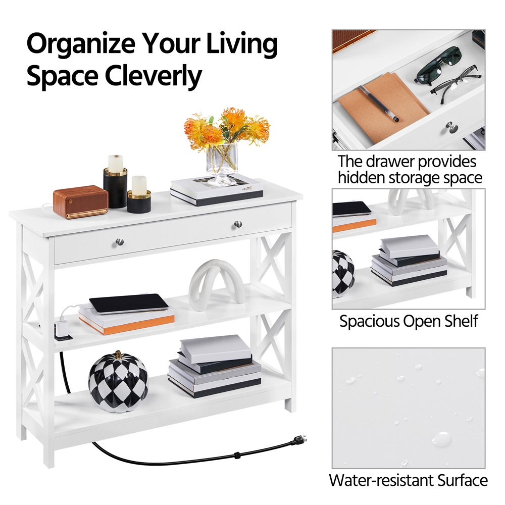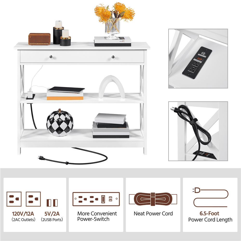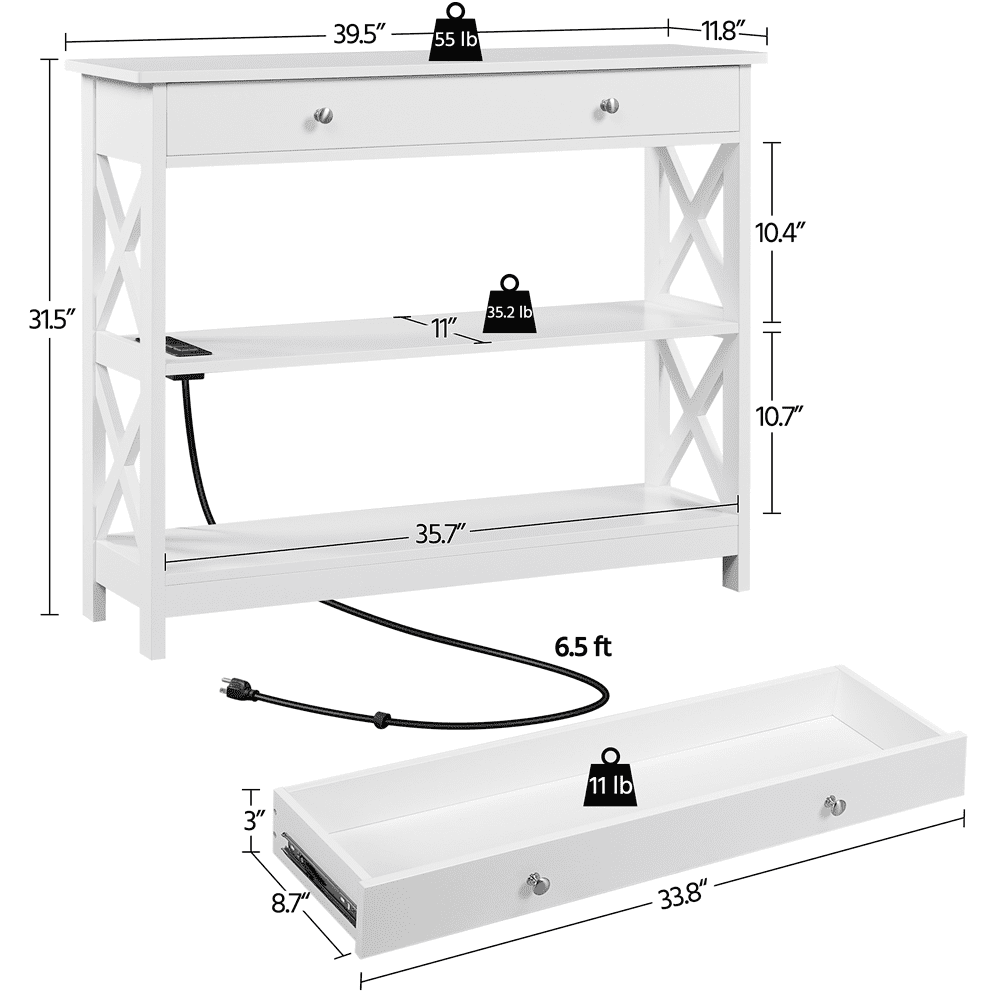 3-Tiers storage: This modern rack provides ample storage space with 2 lower shelves, a long drawer, and a tabletop. Your delicate decorations can be placed on the tabletop and lower brackets are suitable for books, kitchenware, and other necessary goods. The big drawer is ideal for storing and organizing your odds and ends. Sturdy: This wooden entryway table features a robust construction. It is built of CARB P2 MDF panels and solid pine wood to last for years of use. It can bear up to 55 lb on the top, 35.2 lb on each of the two shelves, and 11 lb in the drawer. X-Shaped Side Reinforcement: To reinforce the whole structure, we adopt a pair of X-shaped bars at both sides of the console table for higher stability. Anti-tipping for Extra-safety: This storage sofa table comes with an anti-tipping unit. After completing the assembly, do not forget to fix it to the wall according to the guidance of the instructions. Small step brings extra safety. Specifications: Color: Black; Materials: MDF, pine wood; Overall Dimensions: 39.5″ L × 12″ W × 31.5″ H; Inner Drawer: 33.8″ L × 8.7″ Depth × 3″ H; Max Weight Capacity: Top: 55 lb; Middle: 35.2 lb; Drawer: 11 lb; Power Outlet: 2 m (L); Rated Power: 1500 W; Ports: 2 AC & 2 USB; Comprising: switch & hook & loop; Plugs: 3-plug; Cable: double-insulated round wire.