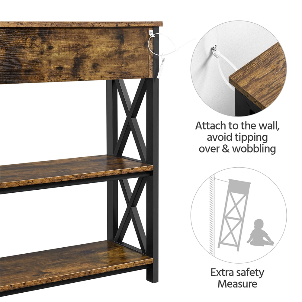 Alden Design Wooden Console Table Entryway Table with Drawer Shelves for Home Living Room,Rustic Brown: Materials: MDF & Iron Overall dimensions: 39.5×11.6×31.7″(LxWxH) Inner drawer dimensions: 33.5x9x3.5″(LxDepthxH) Load capacity (max.): Top: 198 lb Middle: 55 lb Drawer: 22 lb G. W.: 51.4 lb Color: Rustic Brown Residential Use Assembly Required