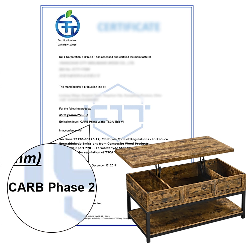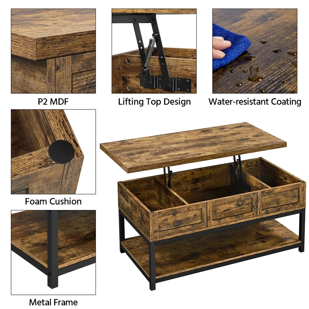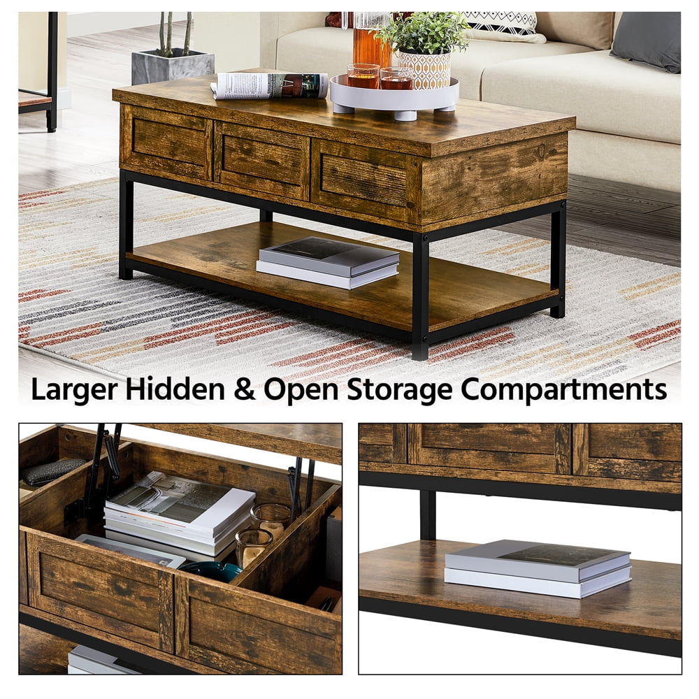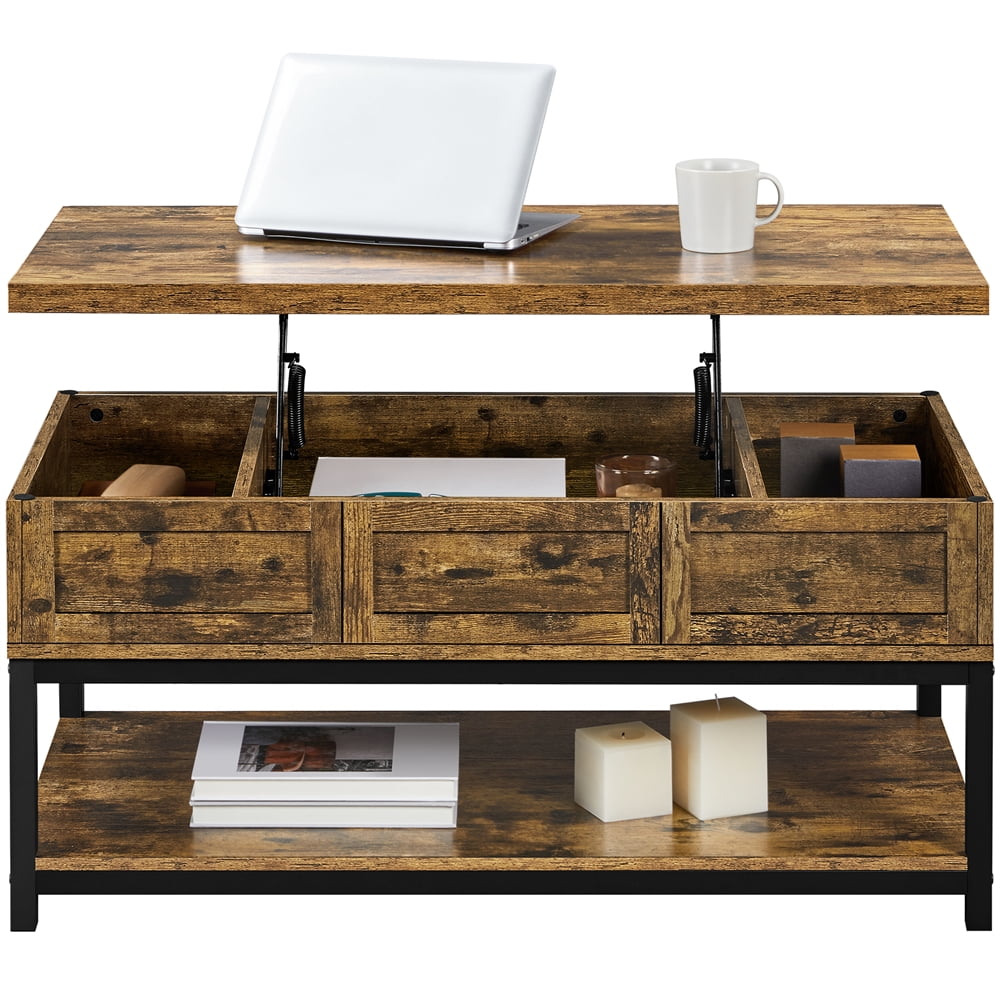 Alden Design Wooden Lift Top Coffee Table with Storage Shelf: Color: Rustic Brown Material: MDF, metal Overall dimension: 41.2 x 19.7 x (18-23)” (L x W x H) Storage inner size side: 8 x 18 x 4″ (L x W x D) Storage inner size middle: 19.7 x 18 x 4″ (L x W x D) Bottom open shelf size: 38.3 x 19.7″ G.W.: 28.1 kg / 61.9 lb N.W.: 26.5 kg / 58.3 lb Max. load capacity: tabletop (when extended): 14 kg / 30 lb; hidden storage: 20 kg / 45 lb; bottom shelf: 14 kg / 30 lb Note: For your safety, please do not stand on the tabletop. Please be careful with your fingers when lifting/lowering the tabletop. Please allow ±0.3 cm/0.2″ errors due to manual measurements.