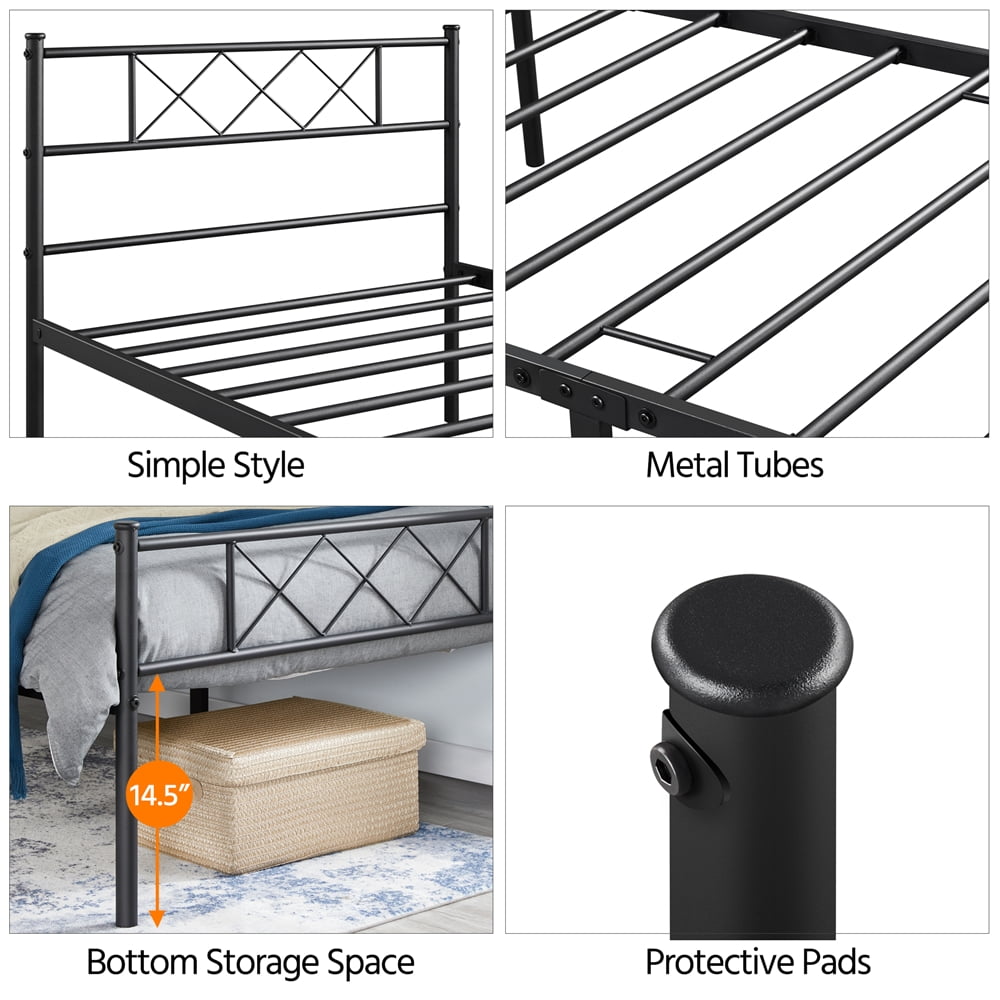 SmileMart X-Design Headboard & Footboard Metal Twin Bed, Black : Material: Iron Overall dimensions:78″ L × 41″ W × 35″ H Max. weight capacity: 350lb Ground clearance: 12.6” N. W.: 32.2 G. W.: 36.4lb Color: Black Note: 1. Please allow ±0.5” error due to manual measurement. 2. Mattress, box spring, and bedding (comforter, sheets, pillows, etc.) are NOT included.