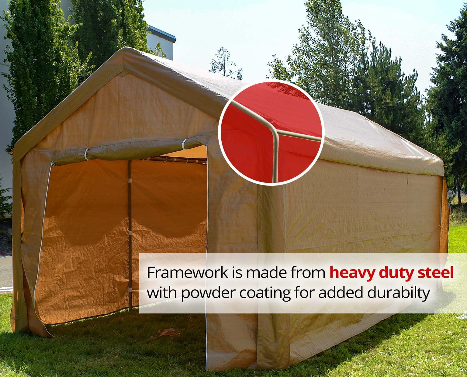 10 x 20 feet heavy duty tent with removable side walls, for customizable privacy High quality, extra strength white powdered steel frame is resistant to chipping, peeling and possible corrosion Heavy duty waterproof / weatherproof fabric canopy gazebo top is made from durable PVC material Offers up to 200 square feet of UV protection Includes 4 corkscrew pegs and metal joint fittings for the utmost stability