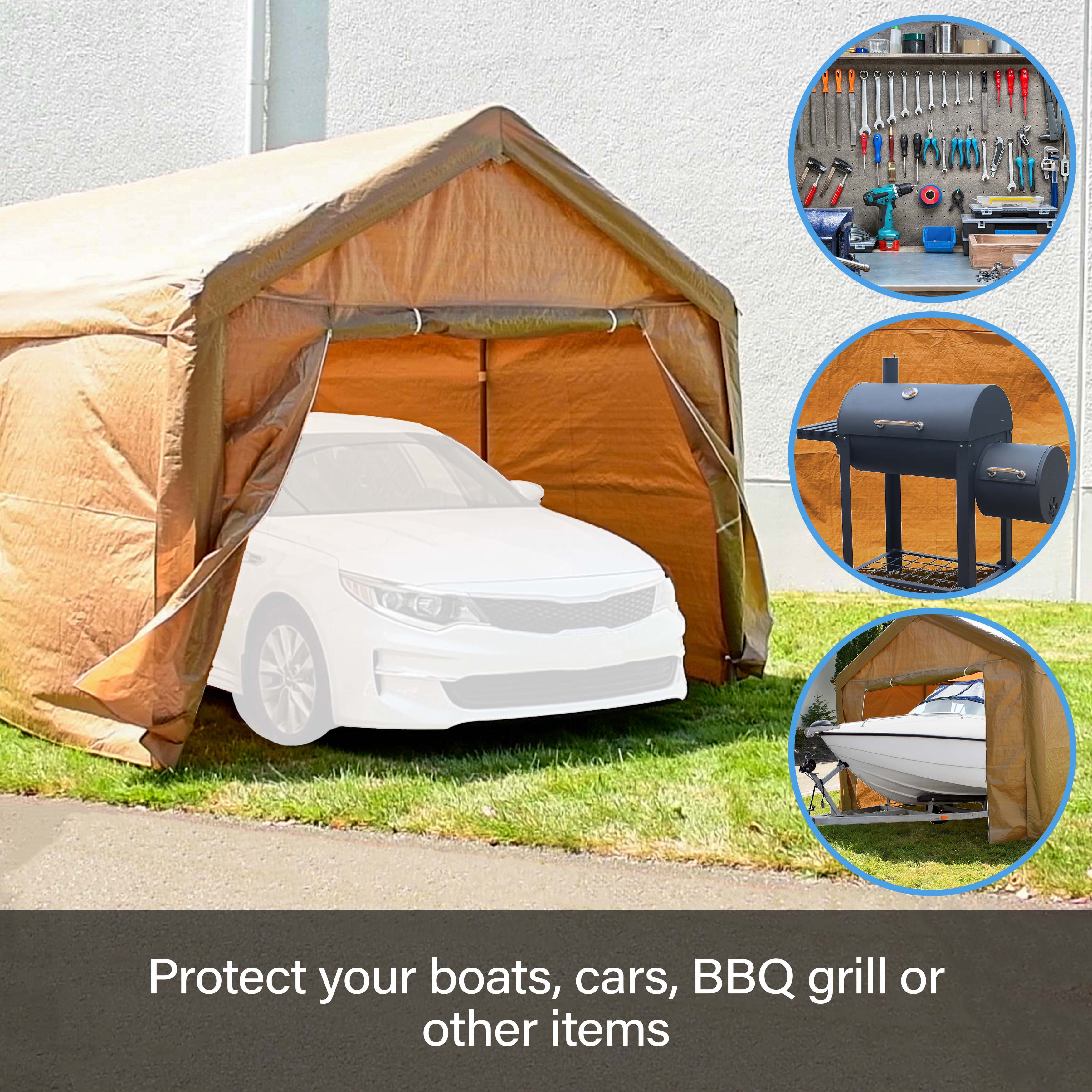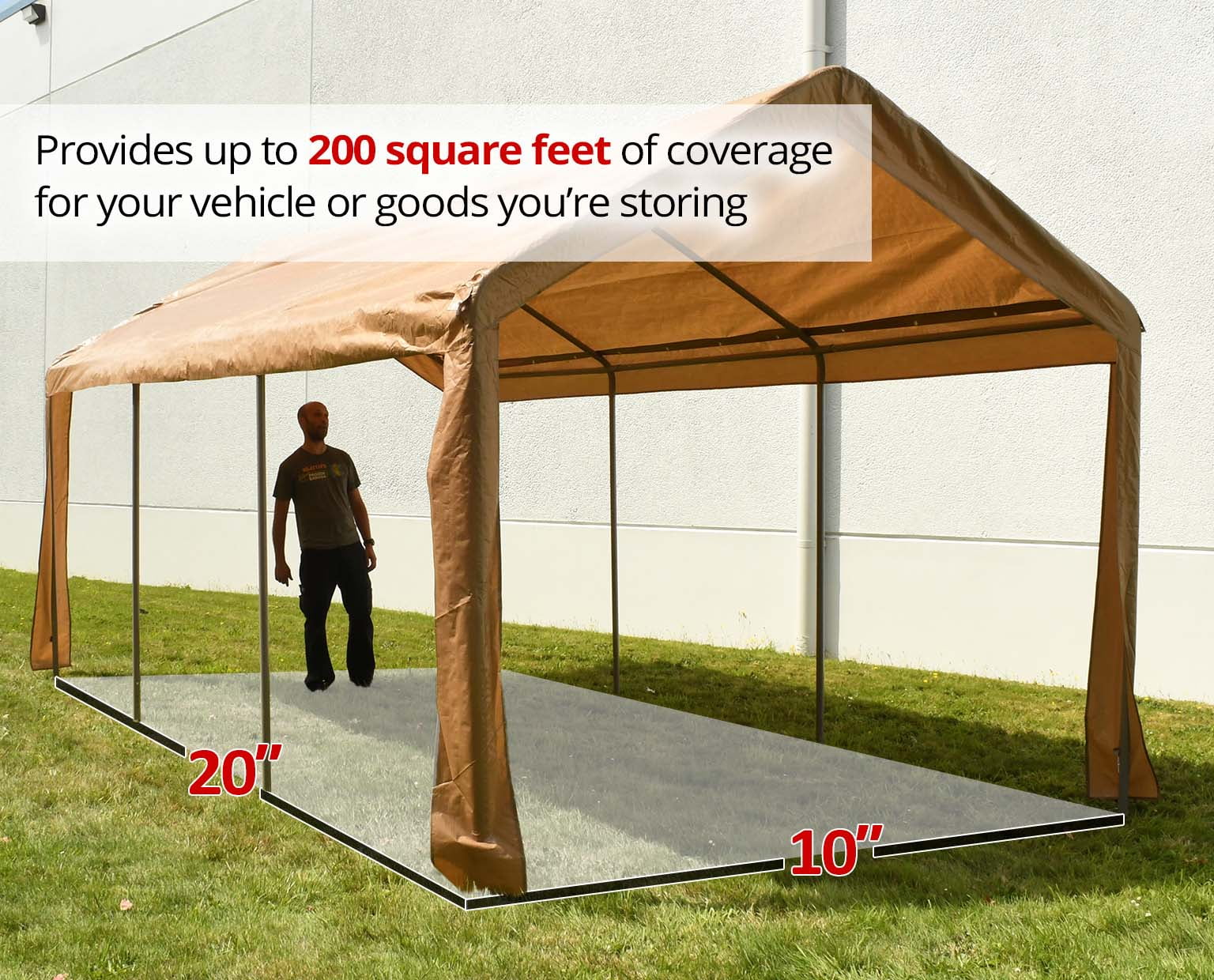 This Heavy Duty outdoor tent is made to be able to withstand rain and sunshine. Simply set up and disassemble for an ideal outdoor storage tent. Perfect for recreational use or commercial use. Our outdoor gazebo top is made specially to protect your storage from sun rays and weather fluctuations. Measures at 10 x 20 feet when set up, offering plenty of room for your storage like boats, cars, BBQ grills or anything you need to keep safe from rain/sunshine. Our product comes with sidewalls for all around protection.