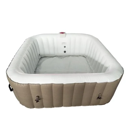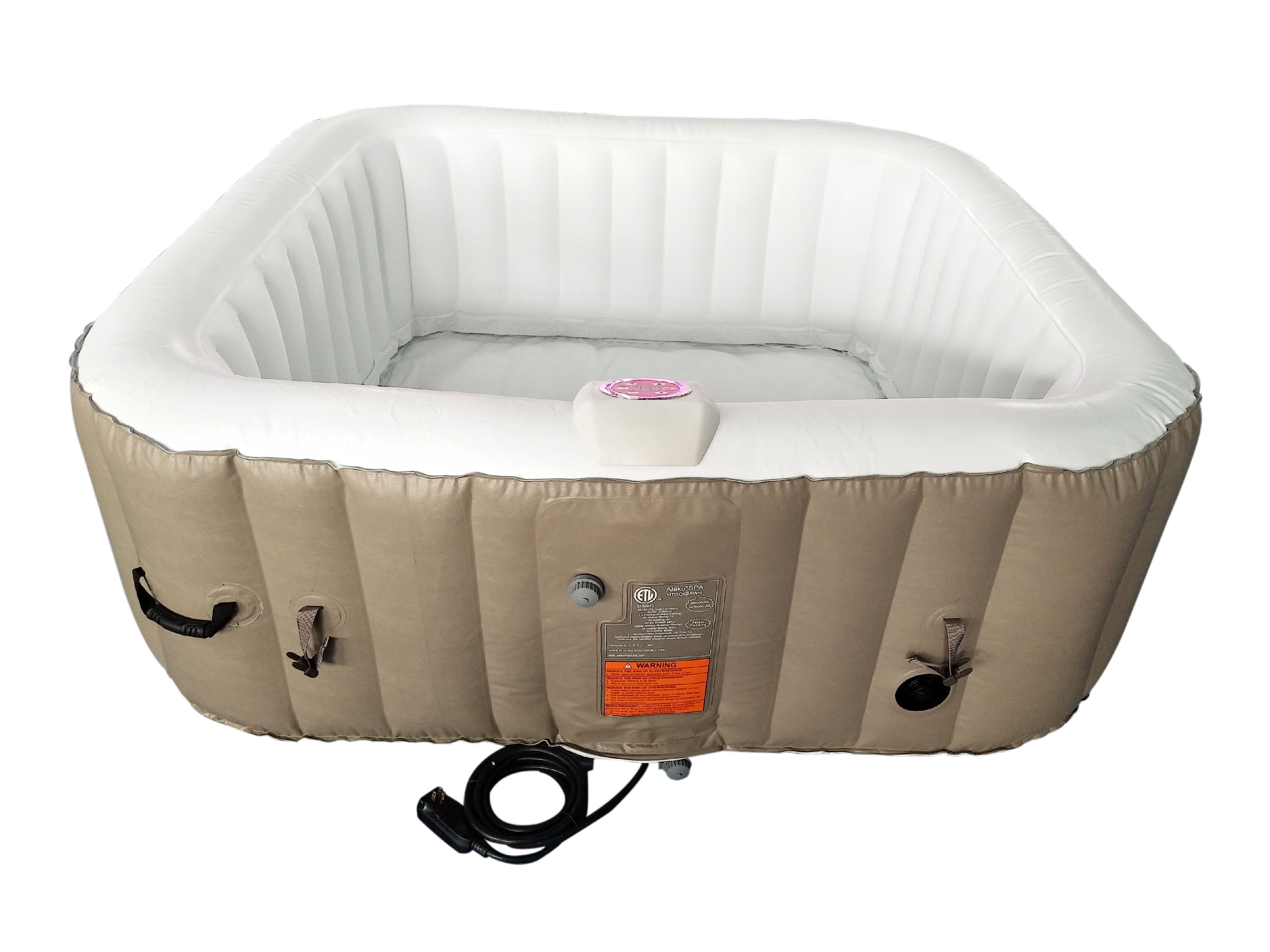 ALEKO does not ship Inflatable Hot Tubs to residents of California, due to state requirements for energy efficiency Square hot tub holds up to 6 people; 250 gallon water capacity Inflates in minutes and deflates for easy storage; no tools required Heats up to a maximum temperature of 104 degrees For safest use, it is recommended to set your temperature at 100 degrees or lower 130 high powered bubble jets provide a soothing massage Heating time varies depending on the outside temperature/temperature of the water used to fill the tub Top cover must be used for optimal heating; Heats 1-3 degrees F/h Cover snaps in place with buckles Easy to operate digital panel Materials: PVC hot tub and polyurethane cover with aluminum foil underside Outer PVC thickness: 0.66mm/264 gauge / Interior PVC thickness: 0.60mm/240 gauge Outer dimensions: 73L x 73W x 26H inches / Inner dimensions: 57L x 57W x 26H inches Power pack 1800 watt (110-120 volt) Heater: 1200 Watt / Bubbler: 600 Watt 120 Volt AC filter pump (420 gallon capacity) Color: Brown and White Includes: inflatable hot tub, fitted cover, inflation hose, filter cartridges, filter cartridge cover, ground cloth, rubber plug and repair kit Note: For optimal heating and performance results, the following is recommended: Avoid leaving your spa out at temperatures lower than 40°F Switch control box off every 48 hours to allow temperatures to cool and reset Use a 12/3 extension cord if one is required (if an extension cord is not necessary, it is recommended to connect hot tub directly to outlet) Connect hot tub to designated 20 AMP plug when in use (heater requires 1200 Watts of electricity and the bubbles require 600 Watts of electricity)